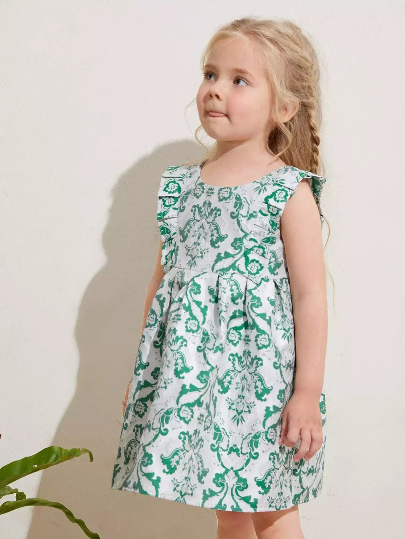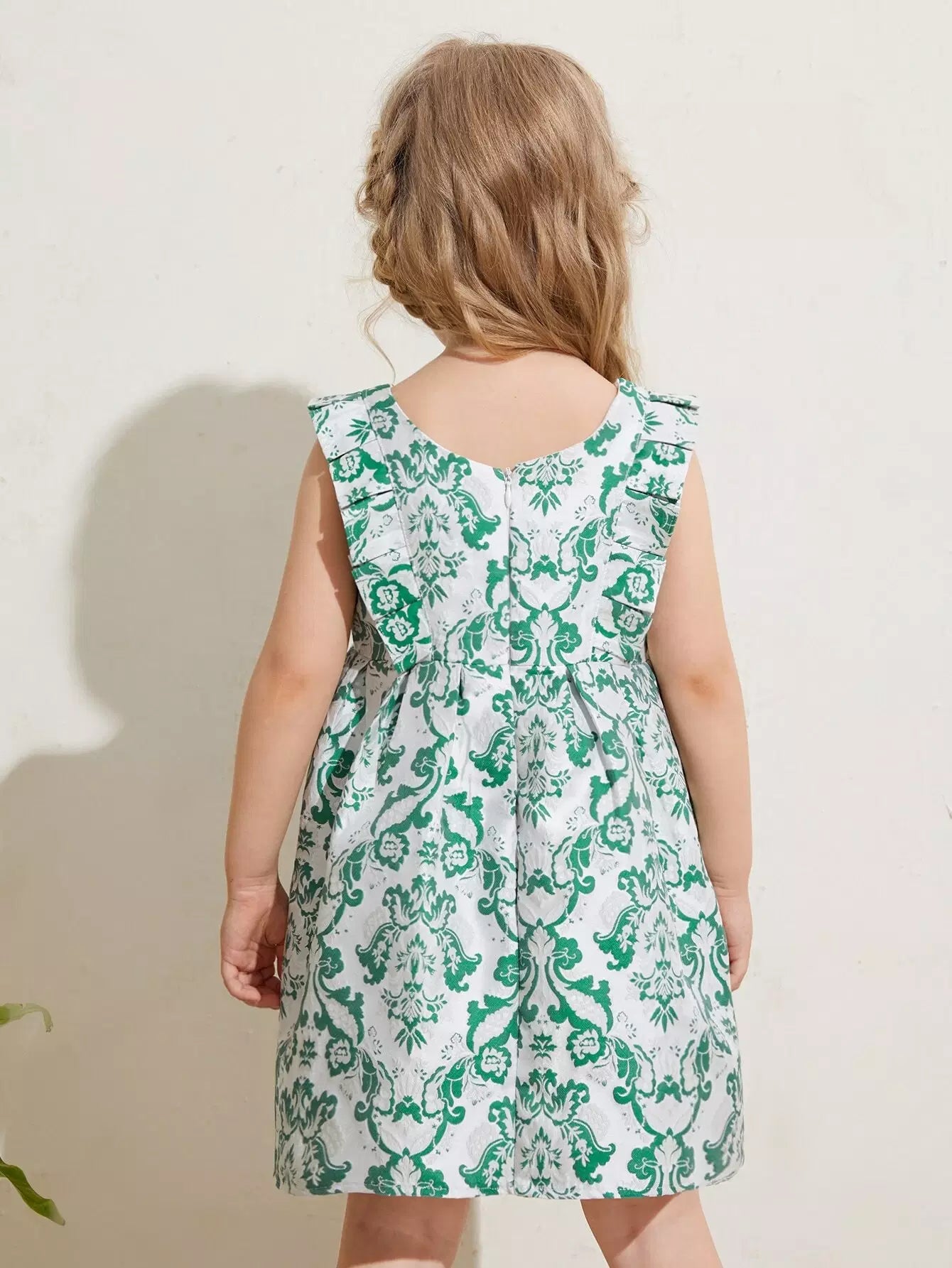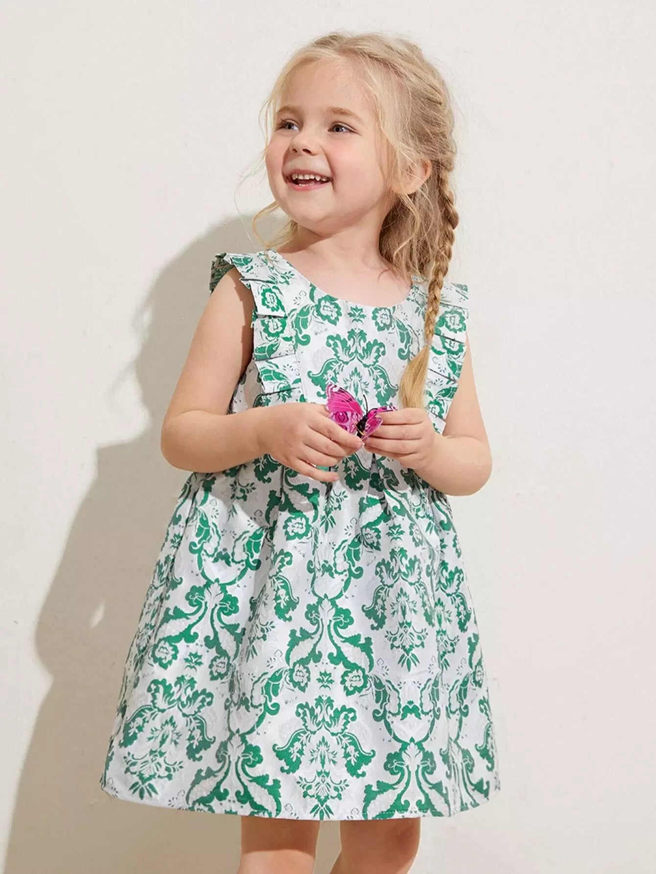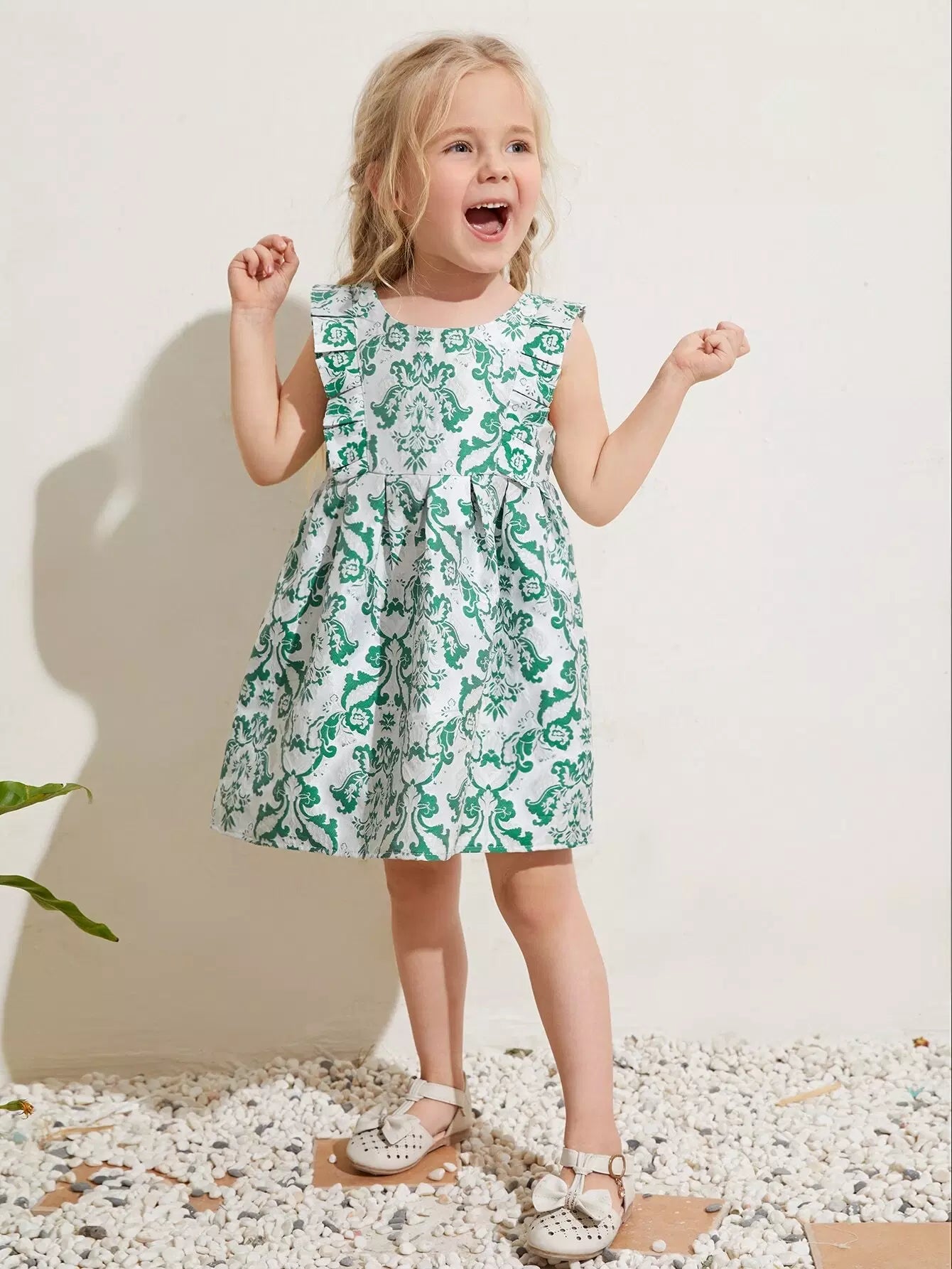 فستان بناتي صغير مطبوع عليه كشكشة على الأكمام