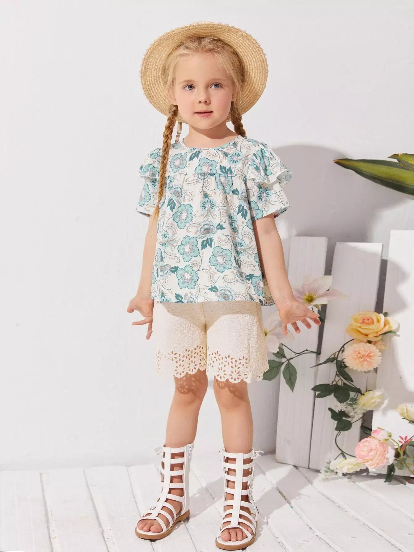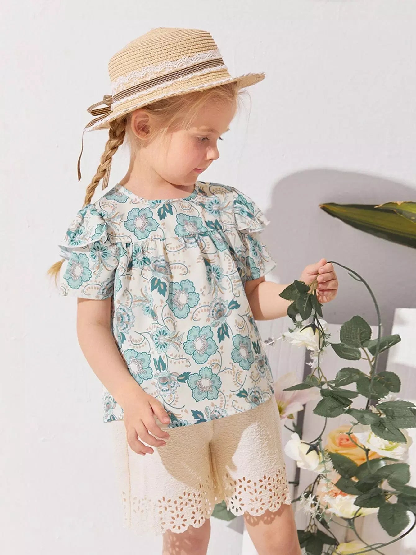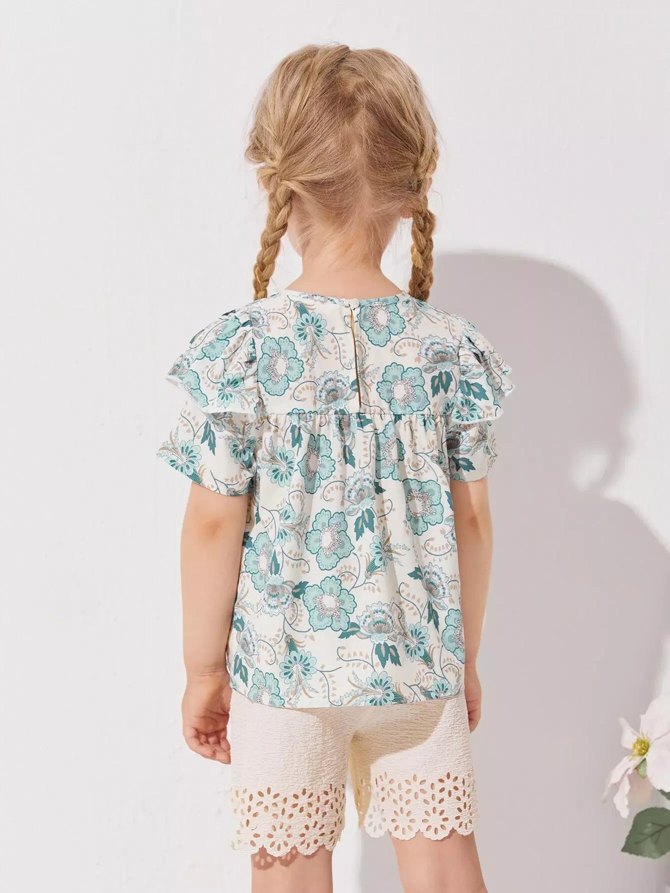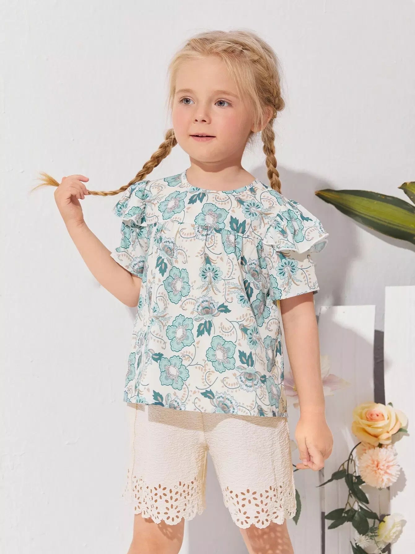 طقم بلوزة مزينة بالكشكشة وشورت مقطوع بالليزر للفتيات الصغيرات