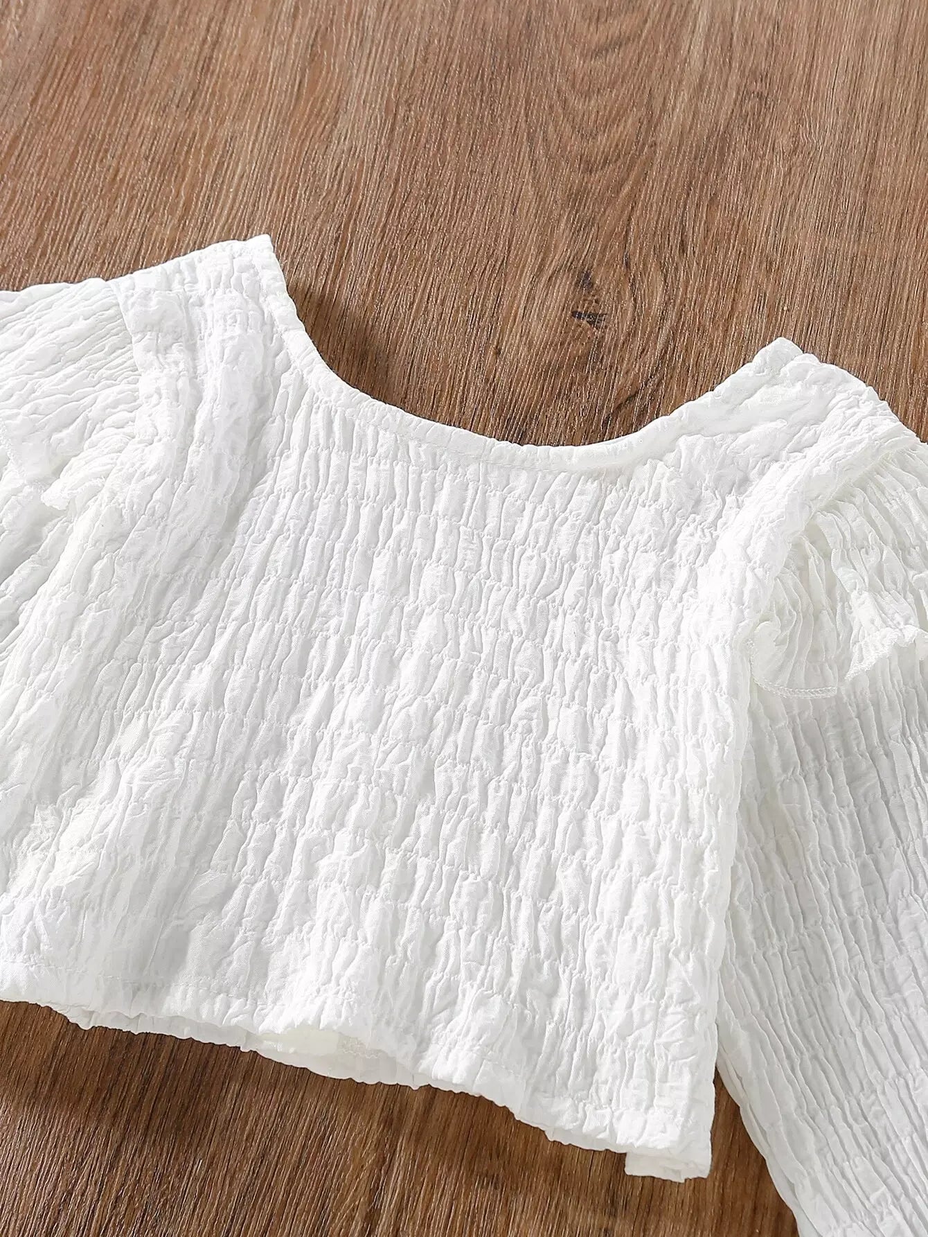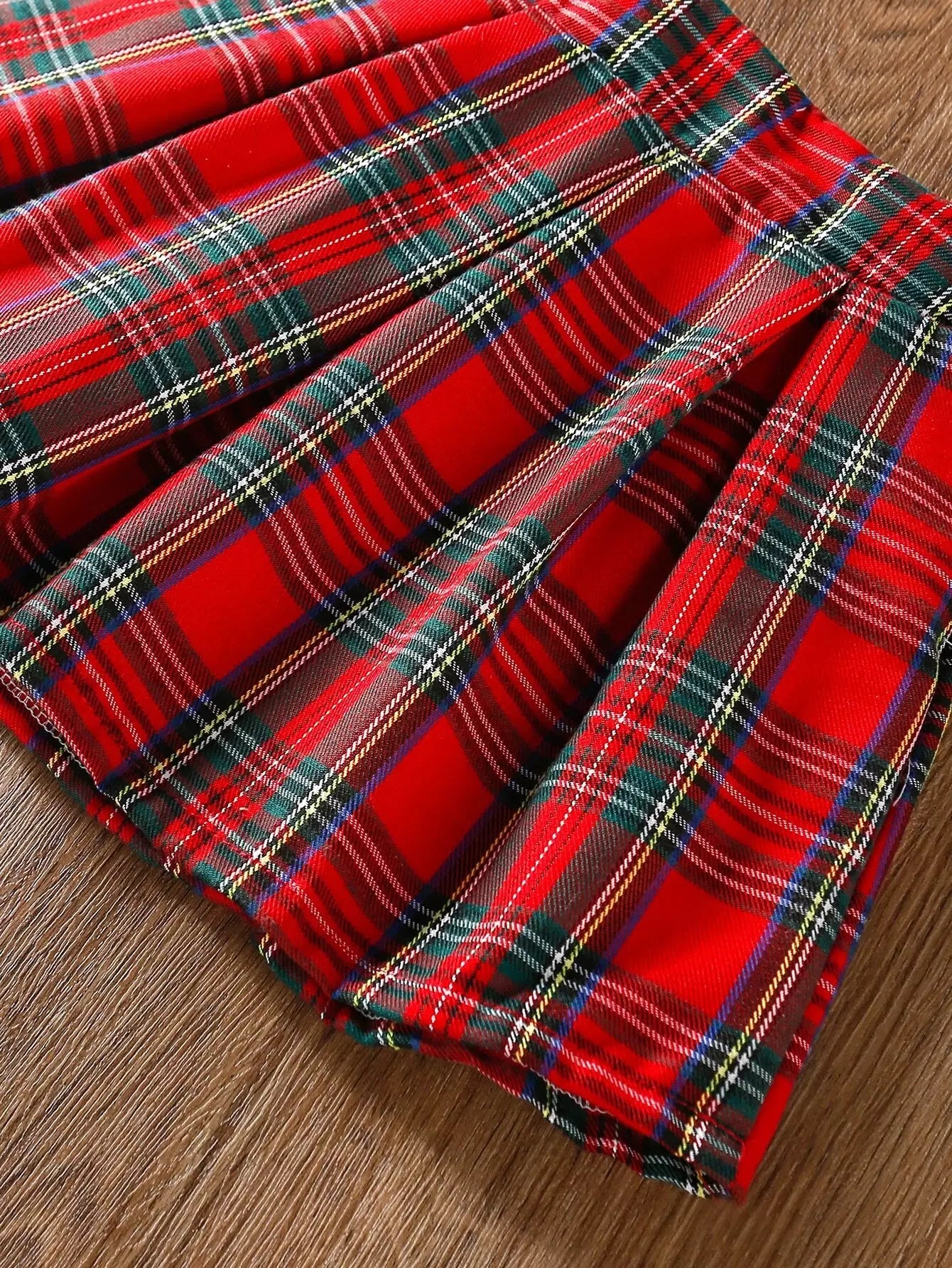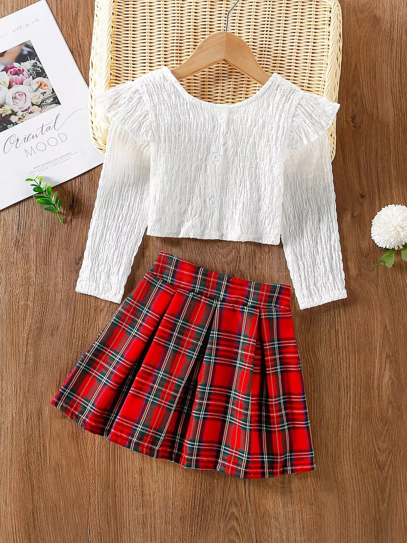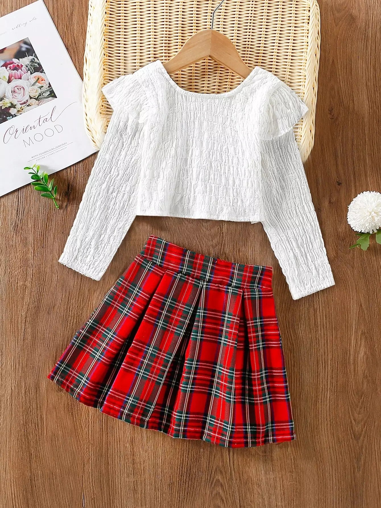 تي شيرت بحواف مكشكشة للبنات الصغار وتنورة تارتان
