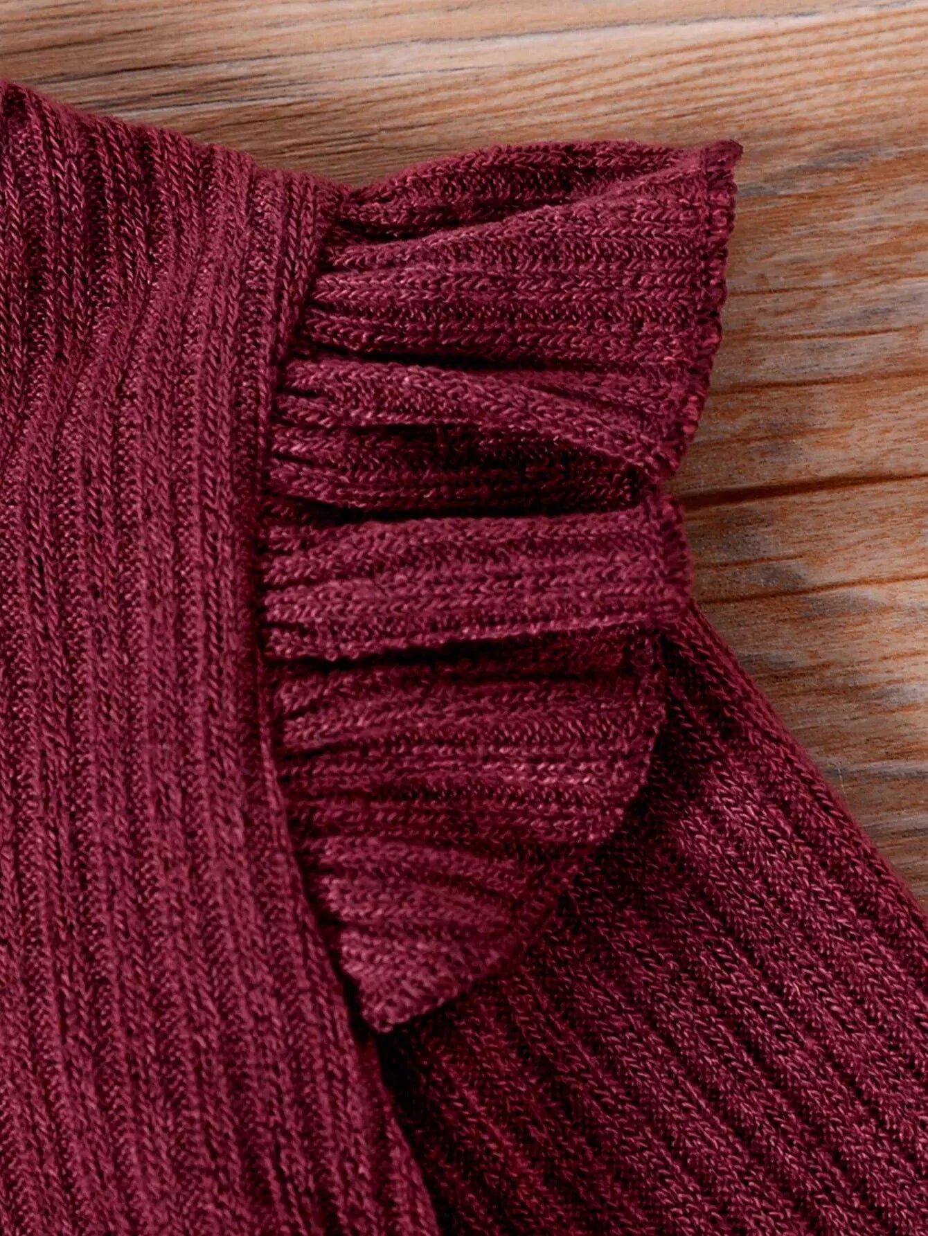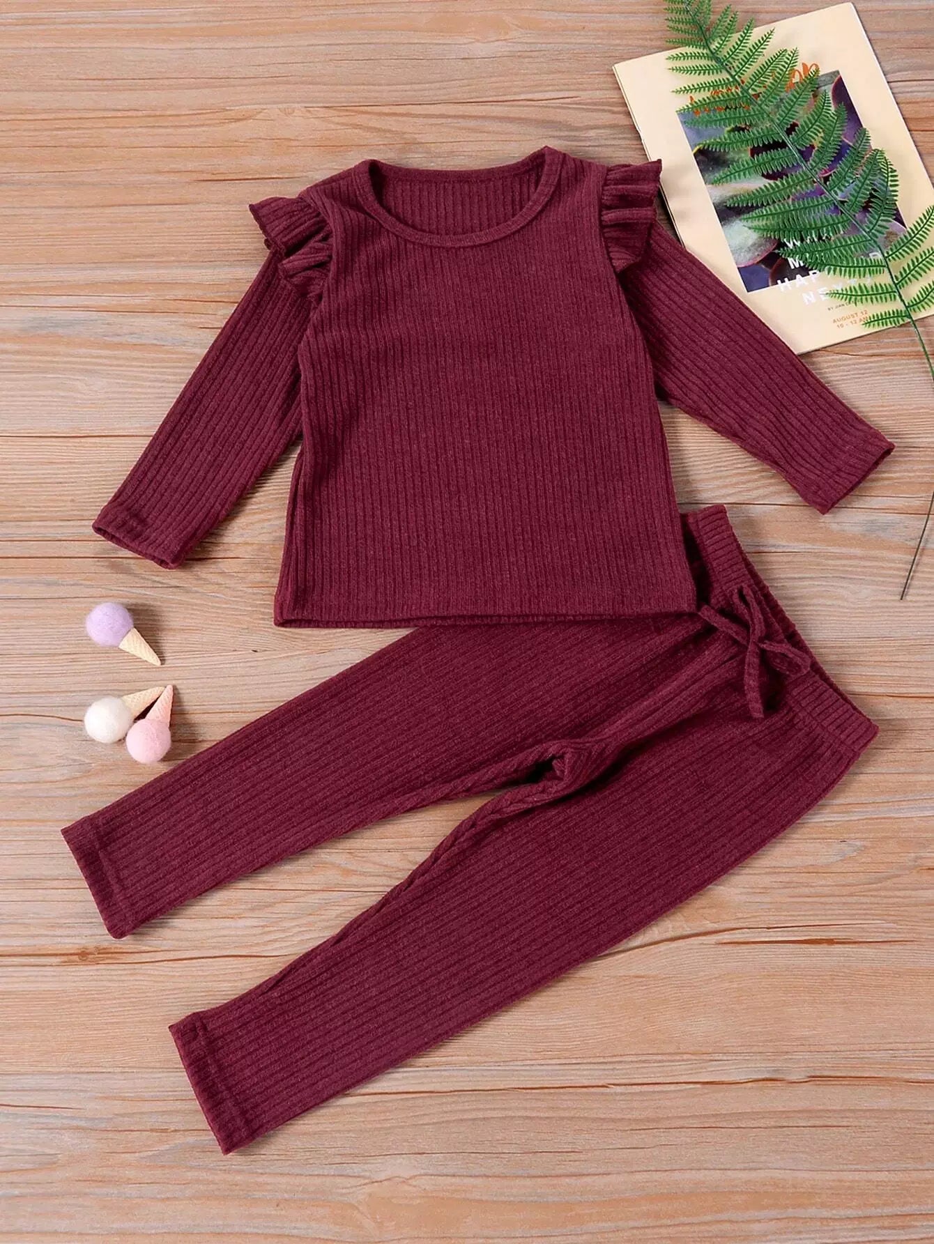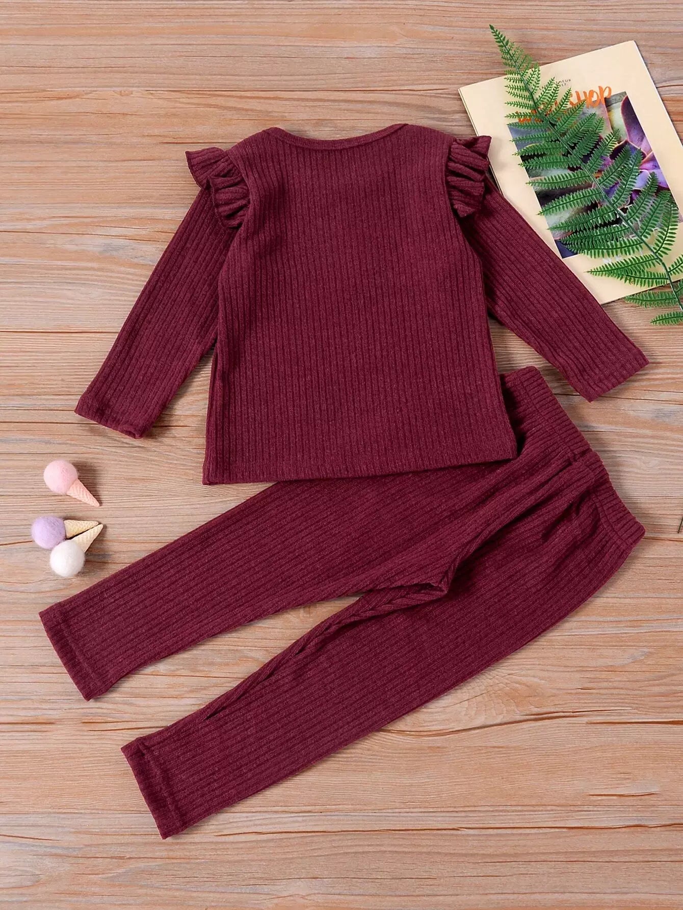 تي شيرت بحواف مكشكشة للبنات الصغار مع بنطلون بعقدة أمامية
