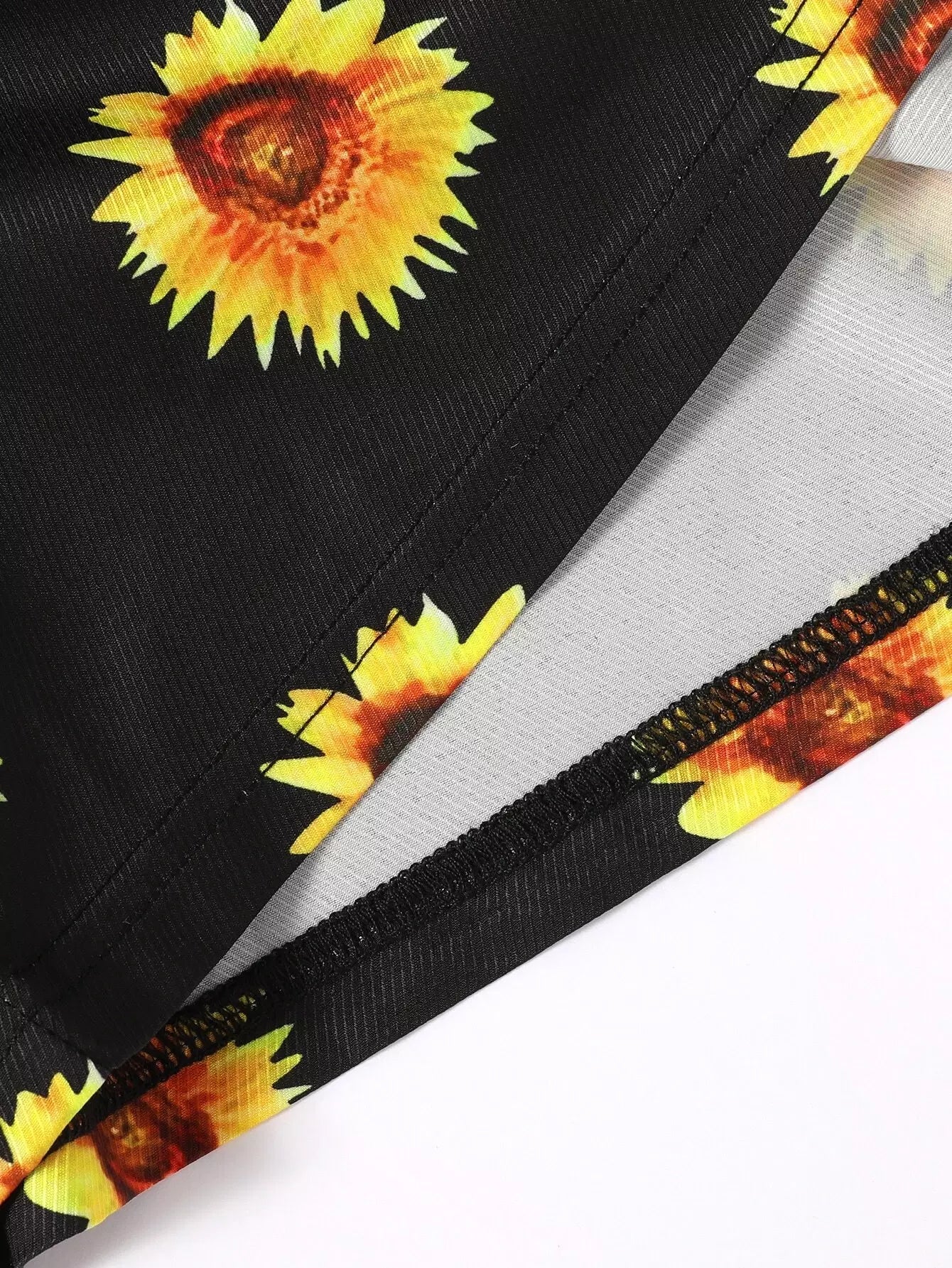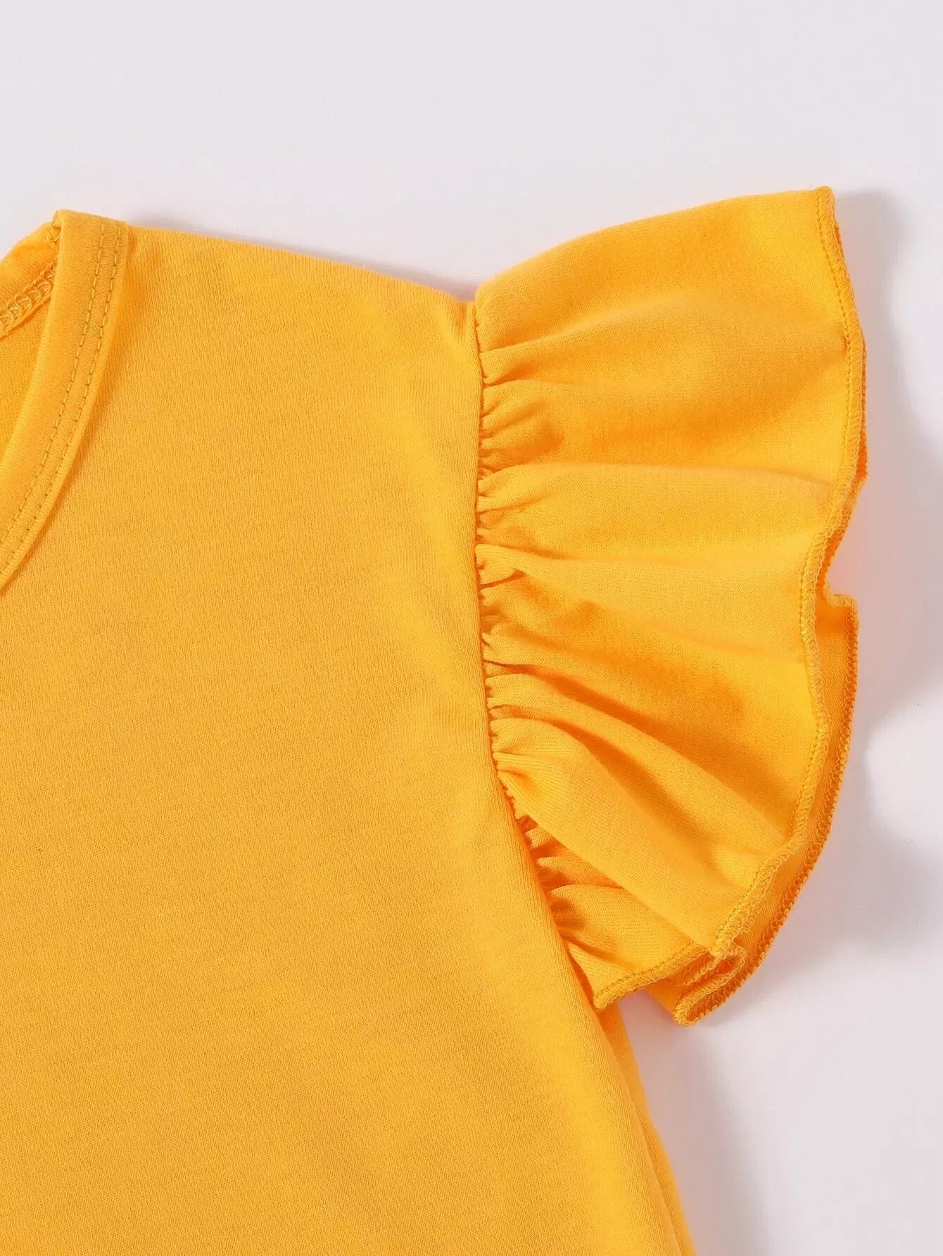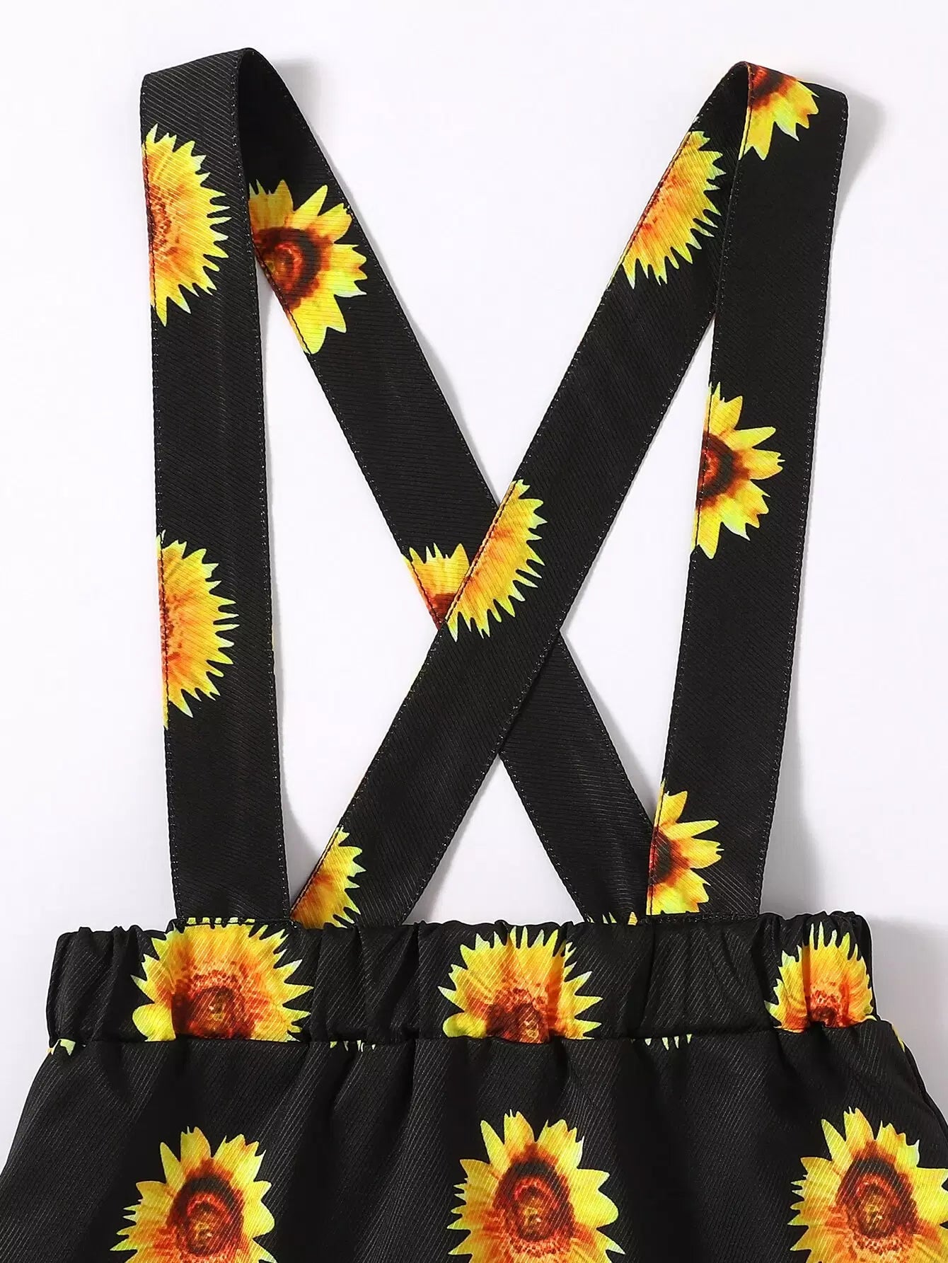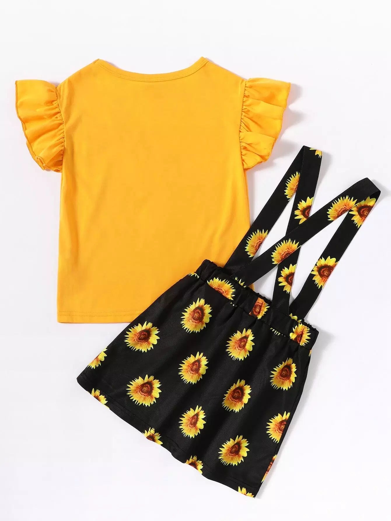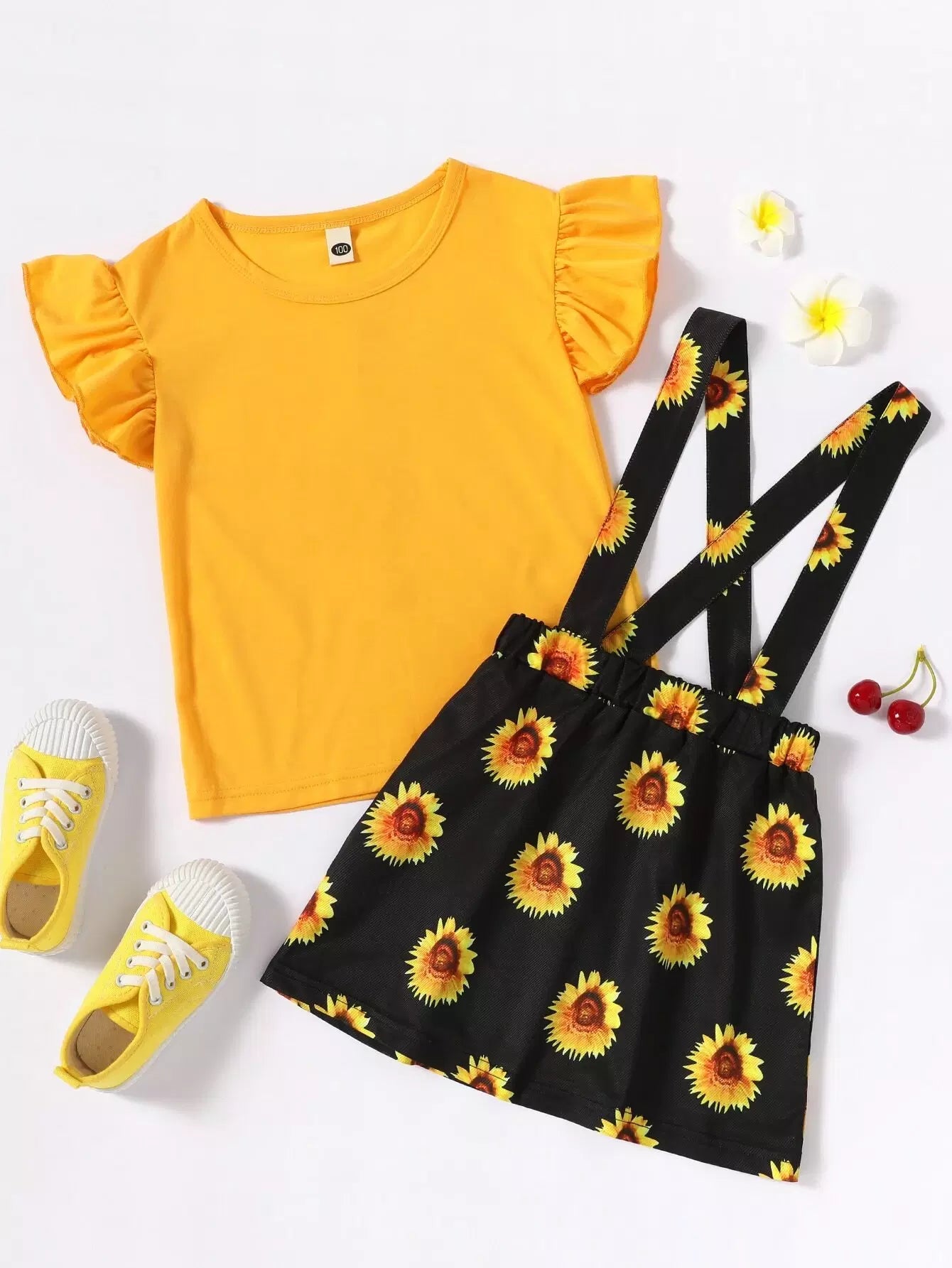 تي شيرت بحواف مكشكشة للبنات الصغار مع تنورة بنطلون بطبعة زهرة عباد الشمس