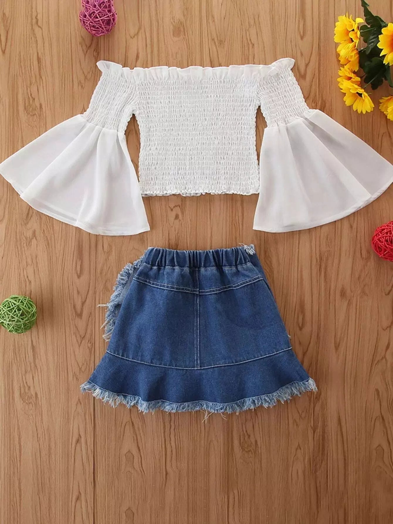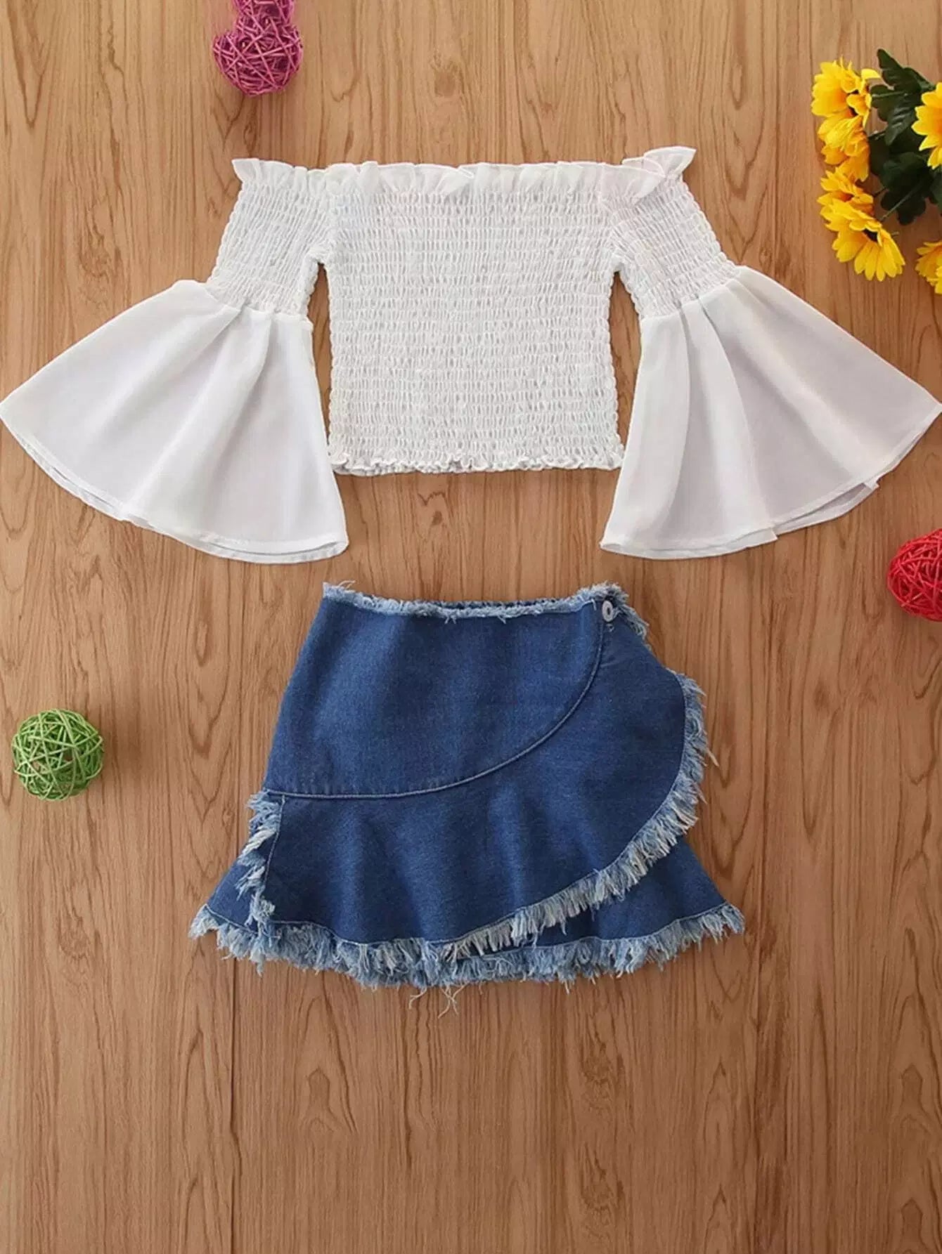 بلوزة باردو بقصّة باردو للبنات الصغار مع تنورة دنيم ملفوفة