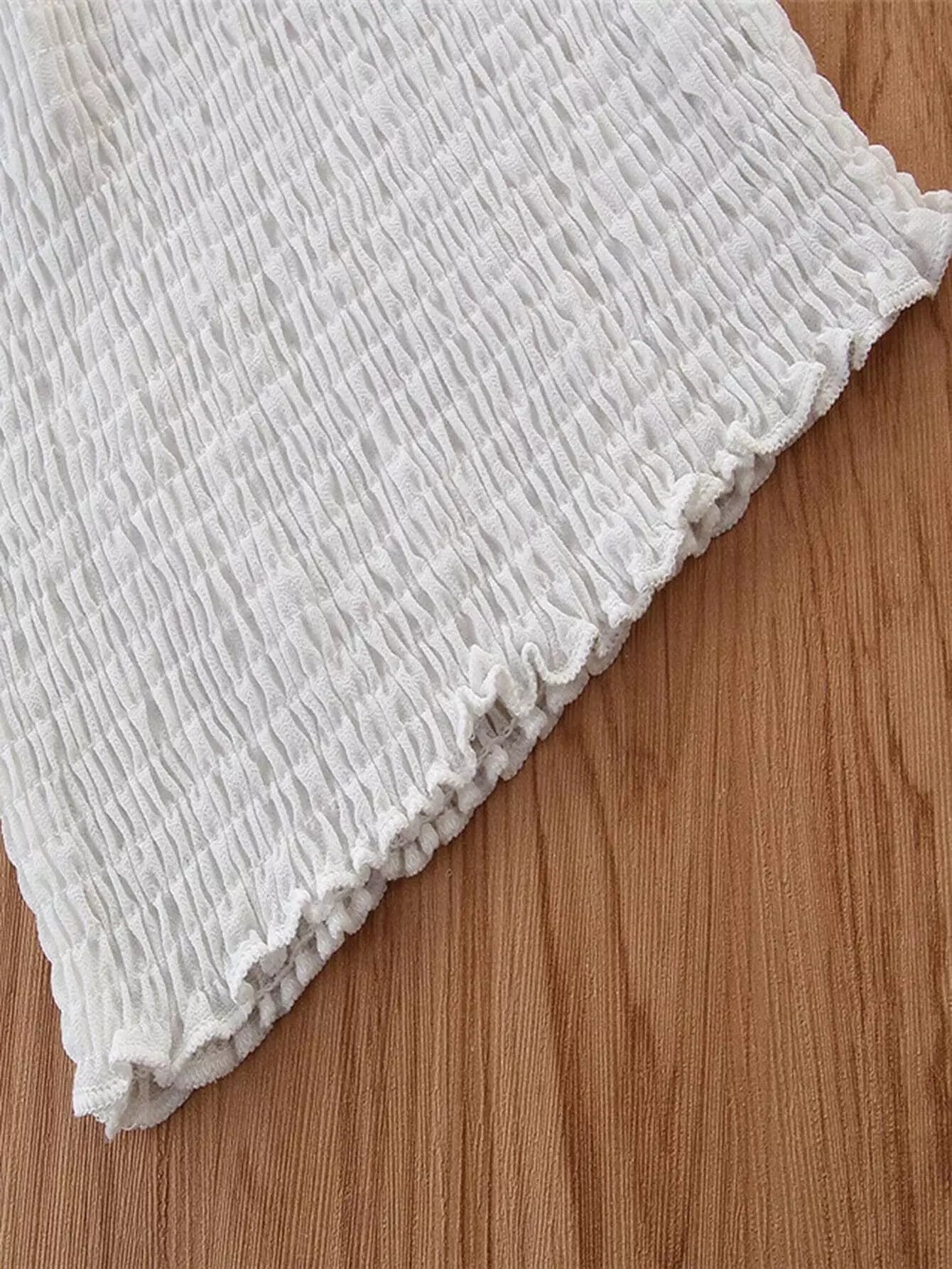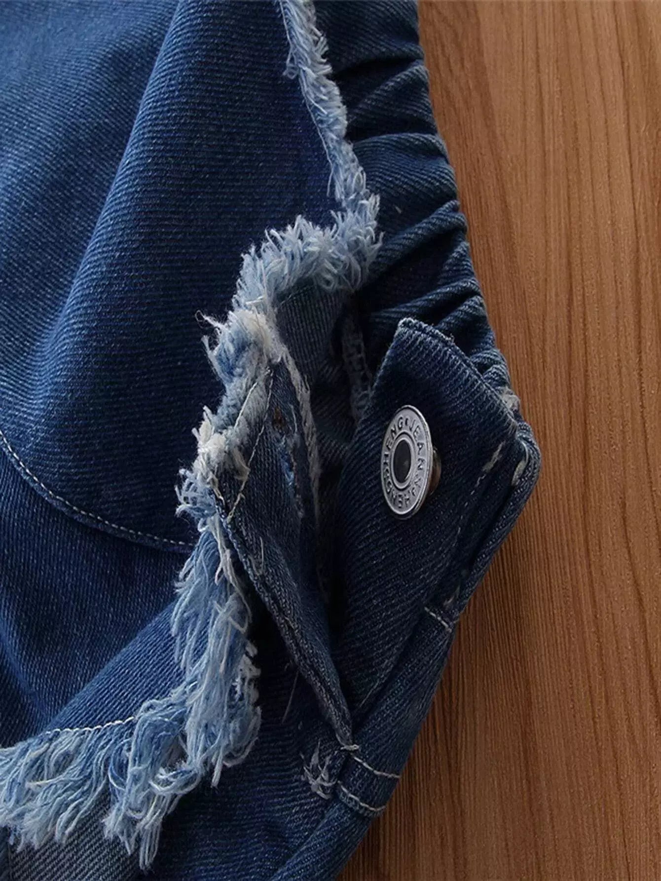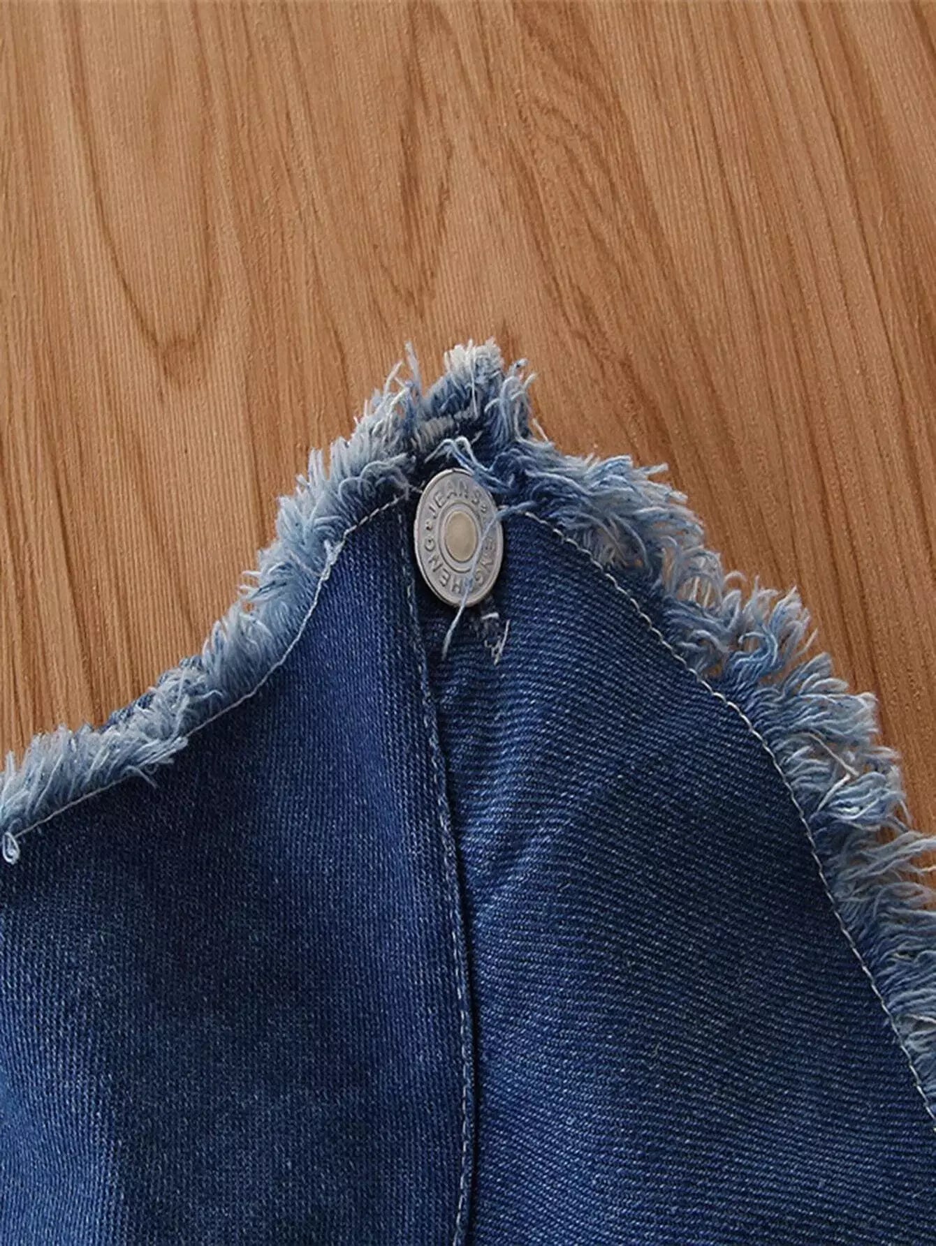 الأطفال - بلوزة باردو ذات صدرية مكشكشة للفتيات الصغيرات وتنورة ملفوفة من الدينيم