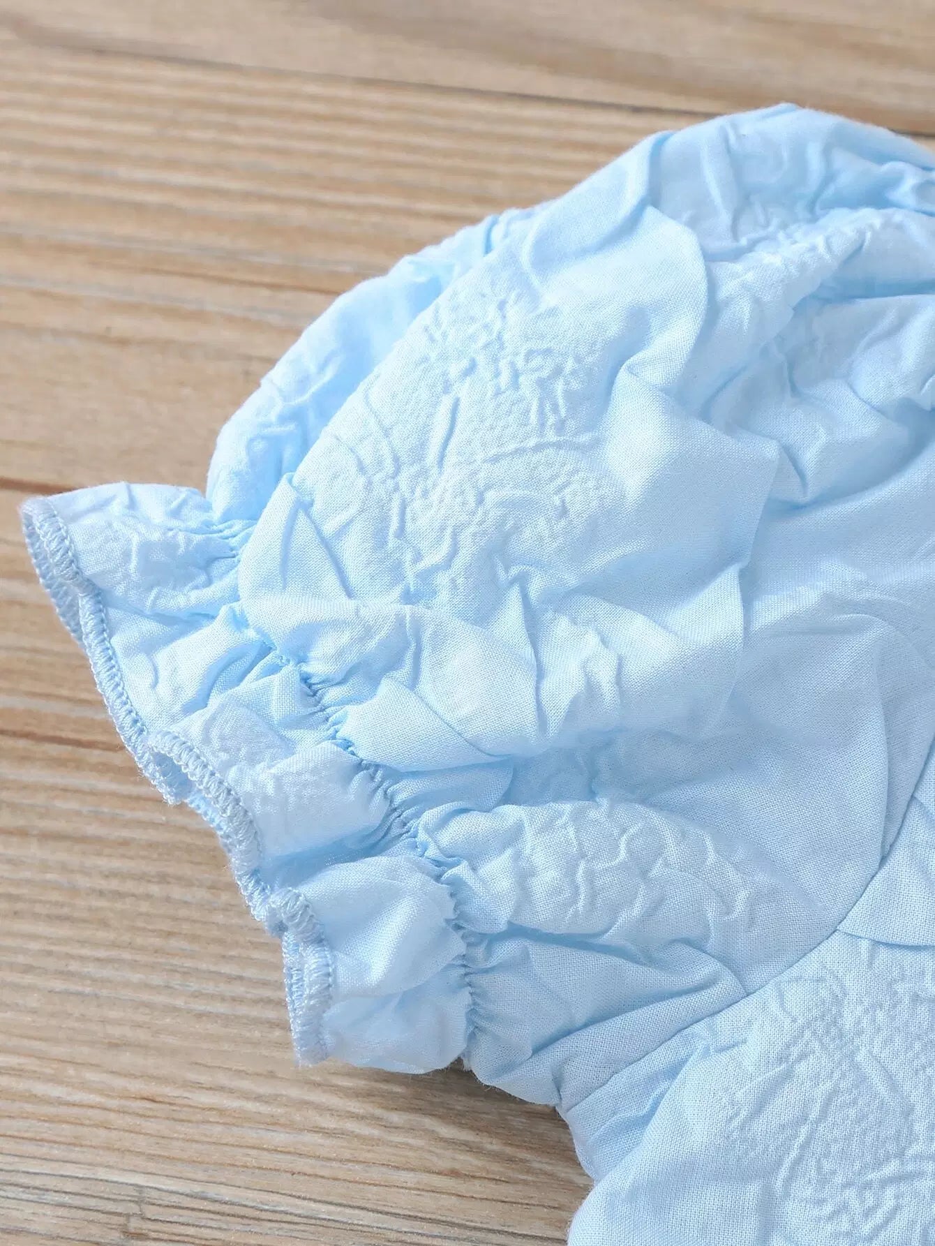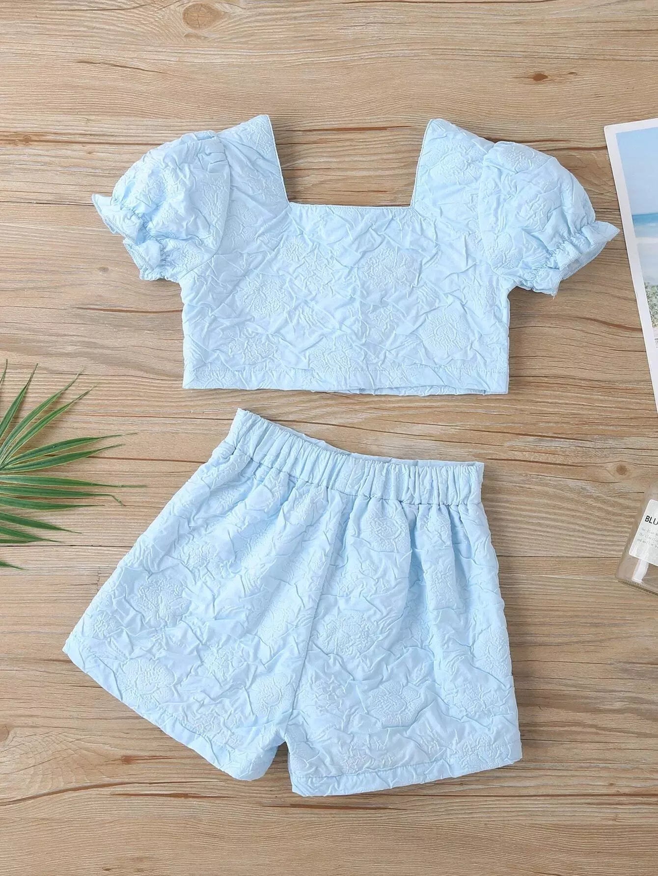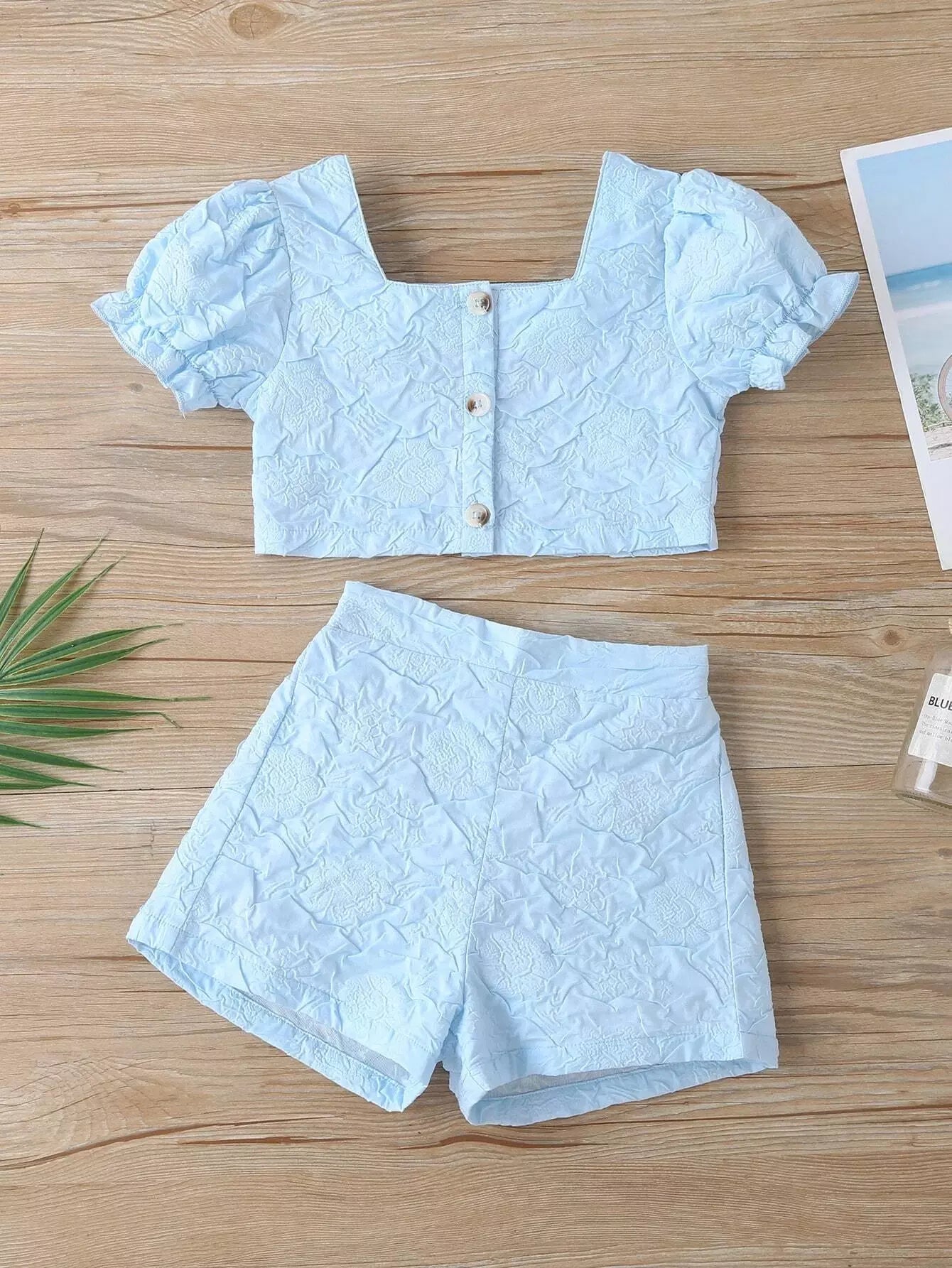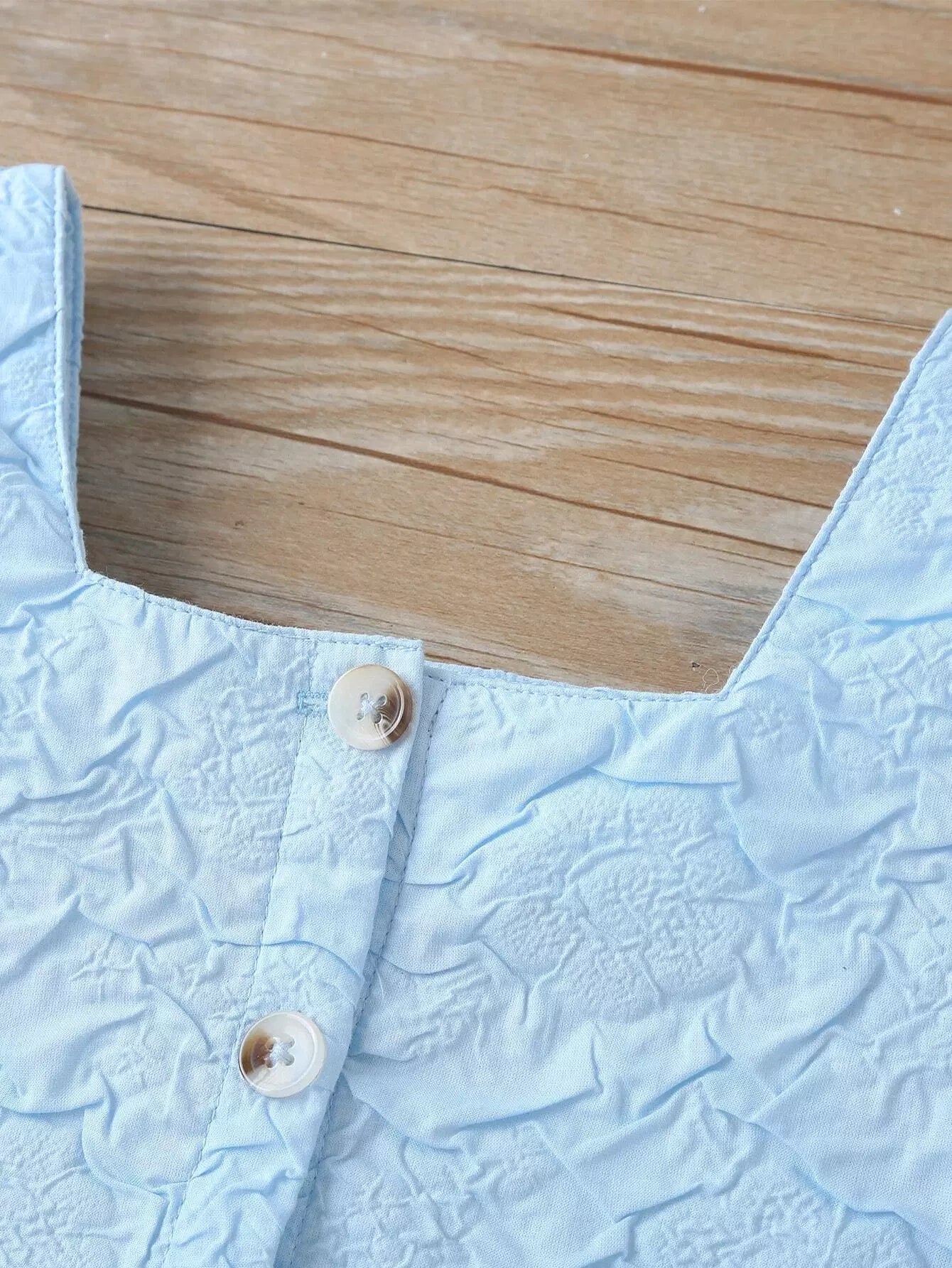 الأطفال - بلوزة قصيرة وسروال قصير للفتيات الصغيرات برقبة مربعة وأزرار أمامية