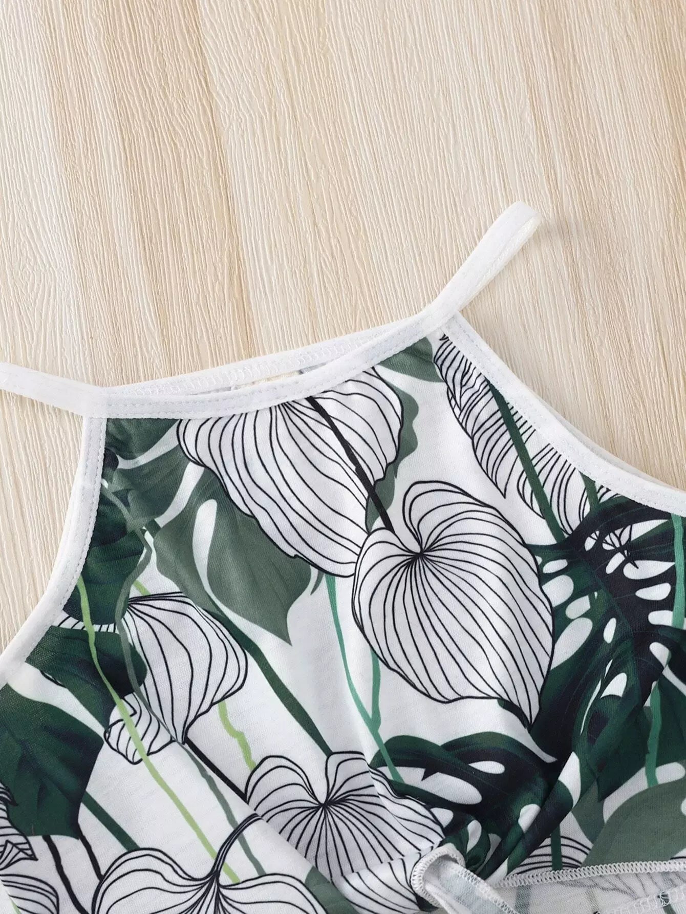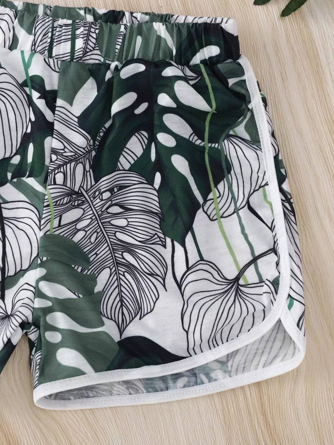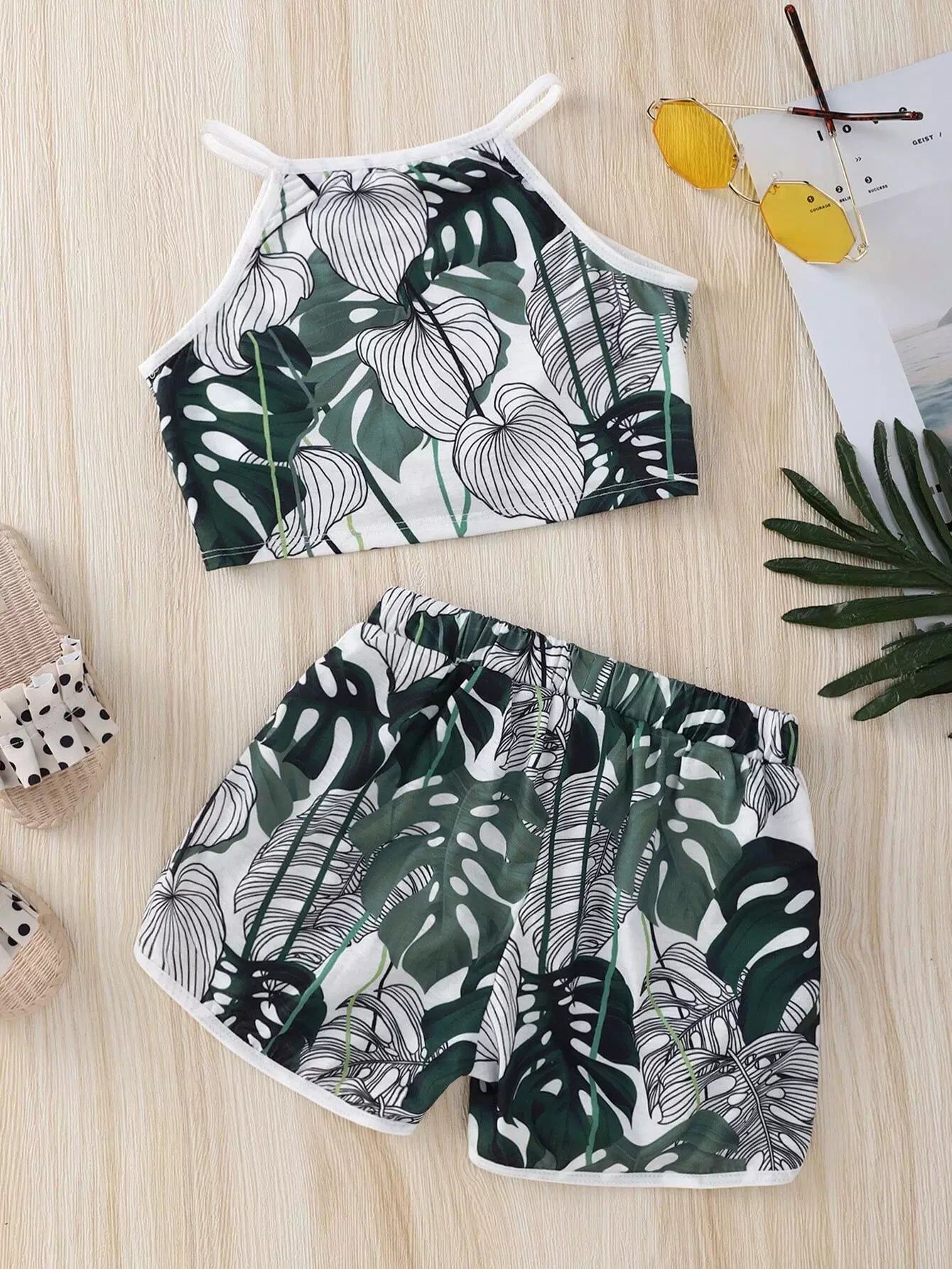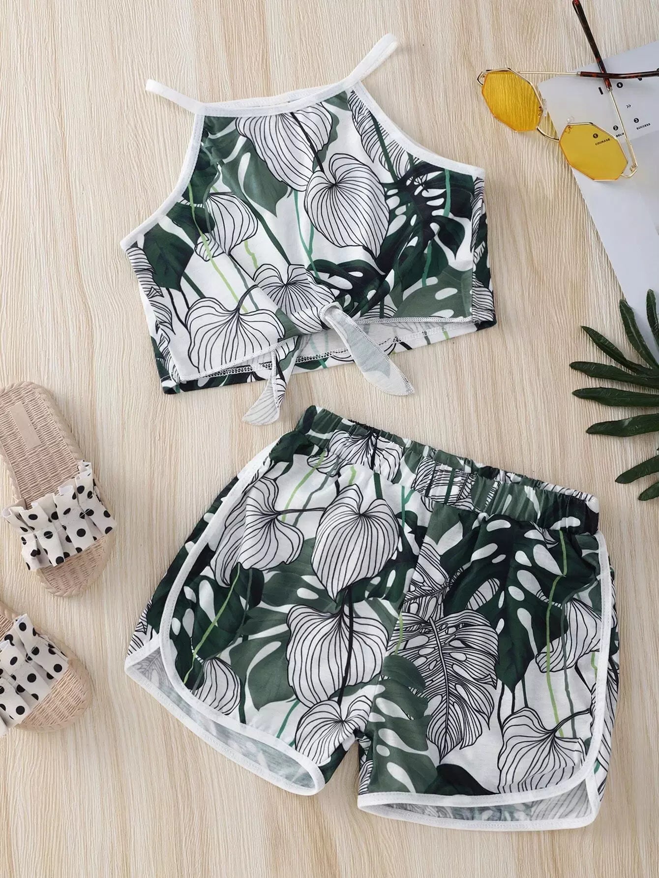 قميص قصير وبنطلون قصير بطبعة استوائية للبنات بطبعة استوائية بعقدة أمامية متباينة