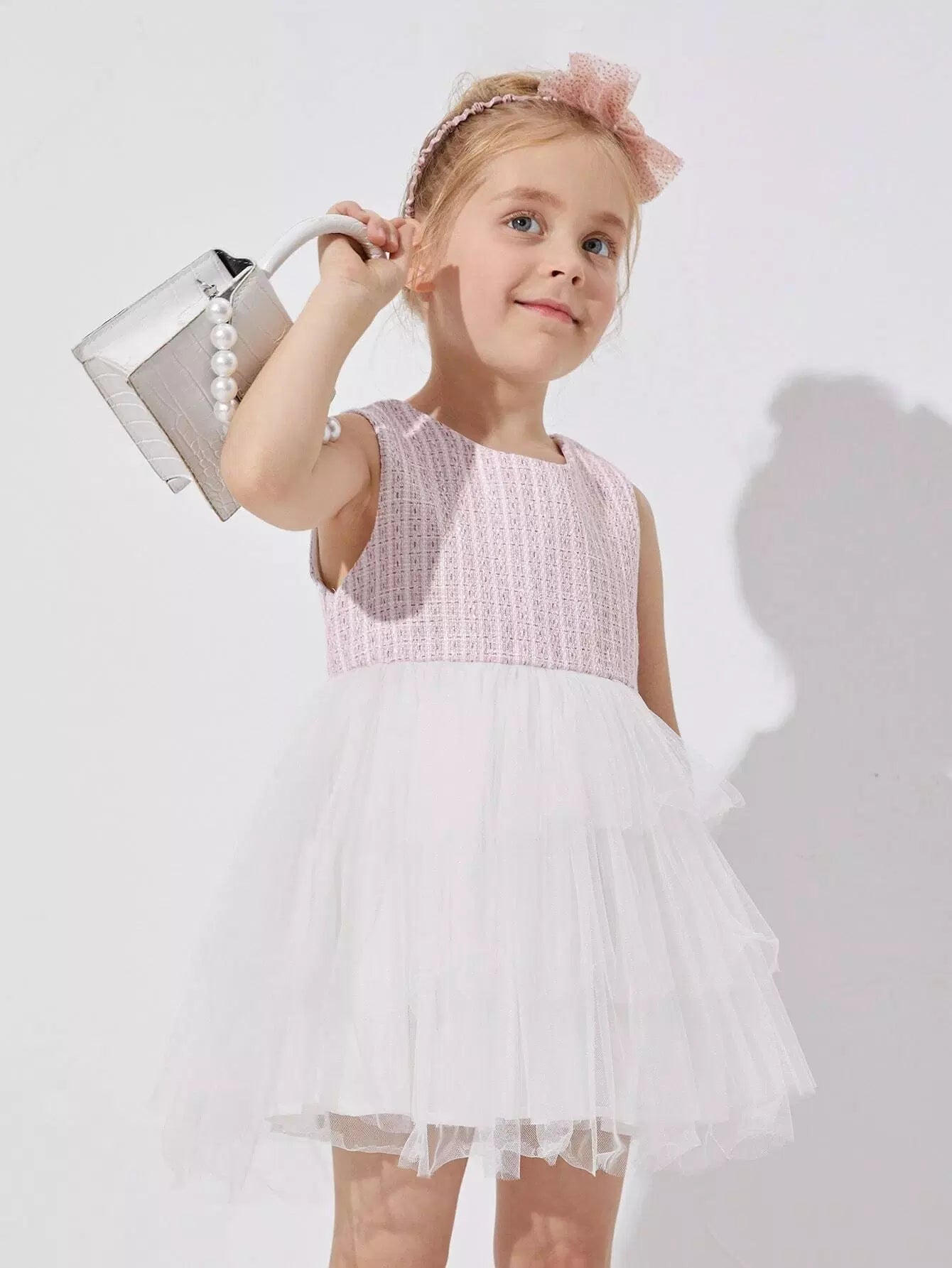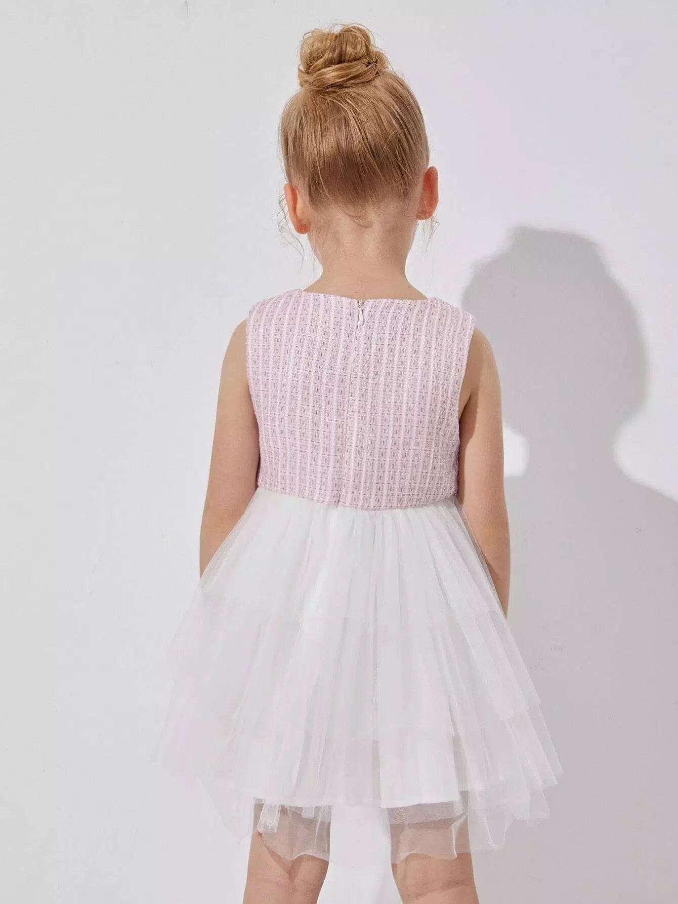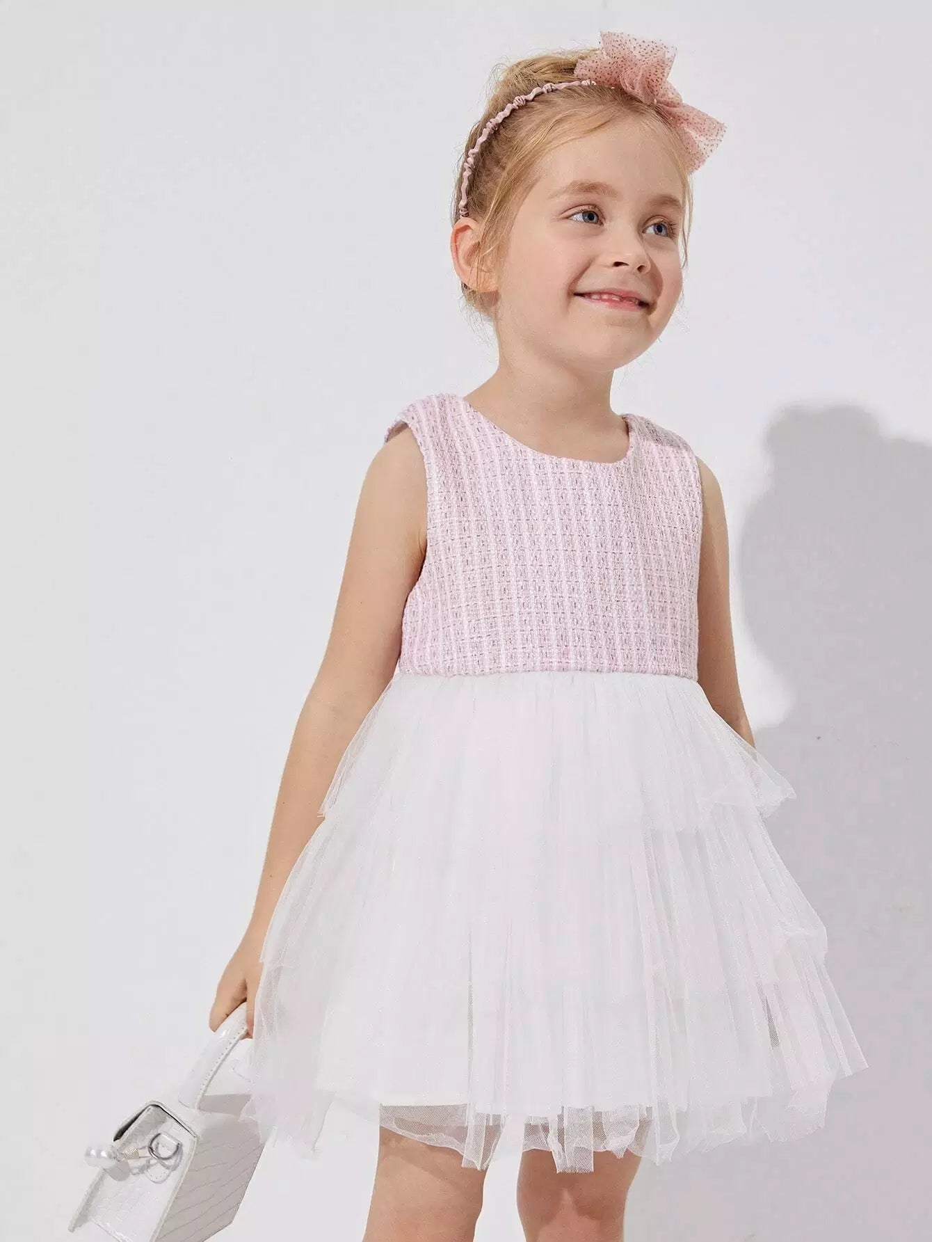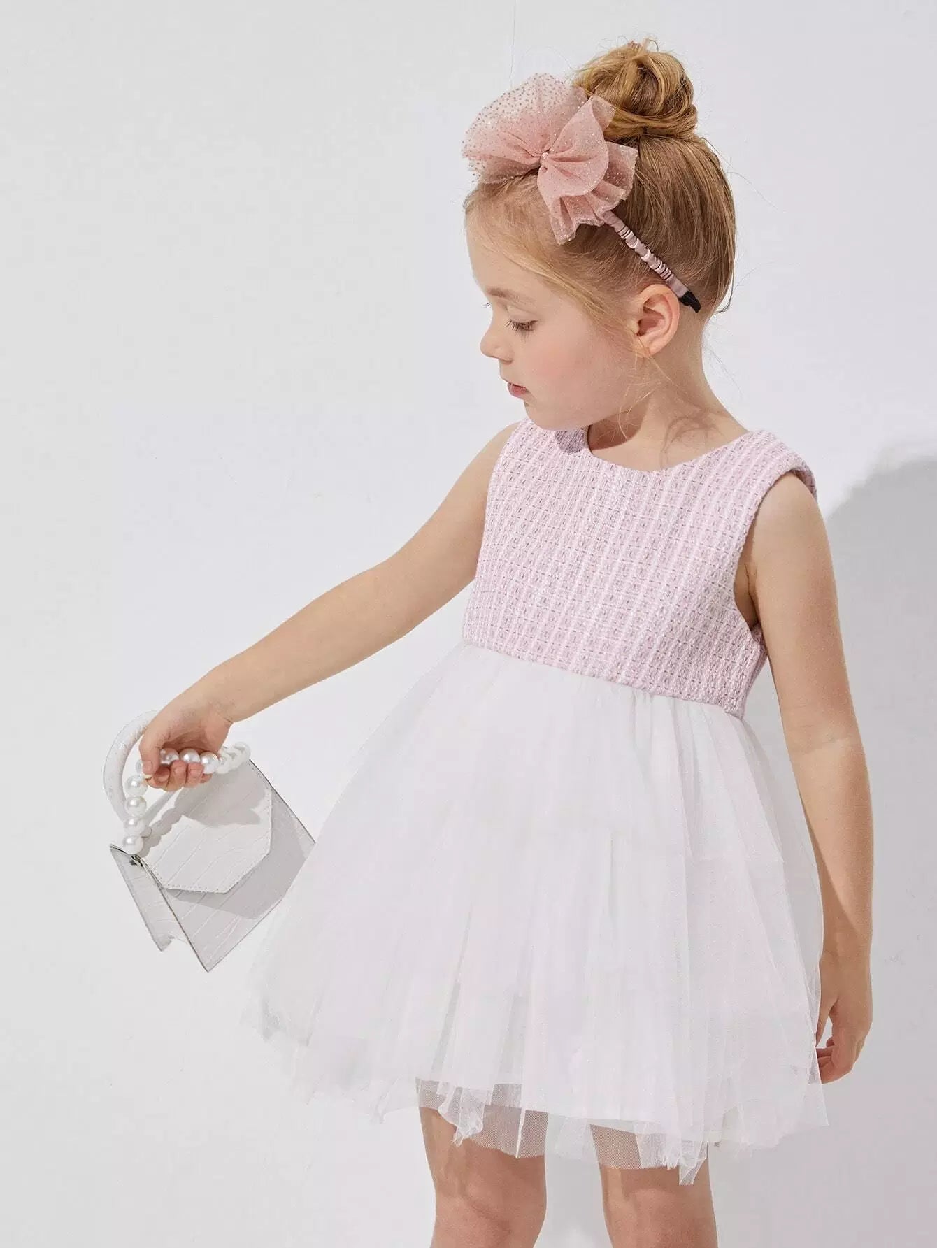 فستان كومبو من قماش تويد مع حافة شبكية شفافة للفتيات الصغيرات