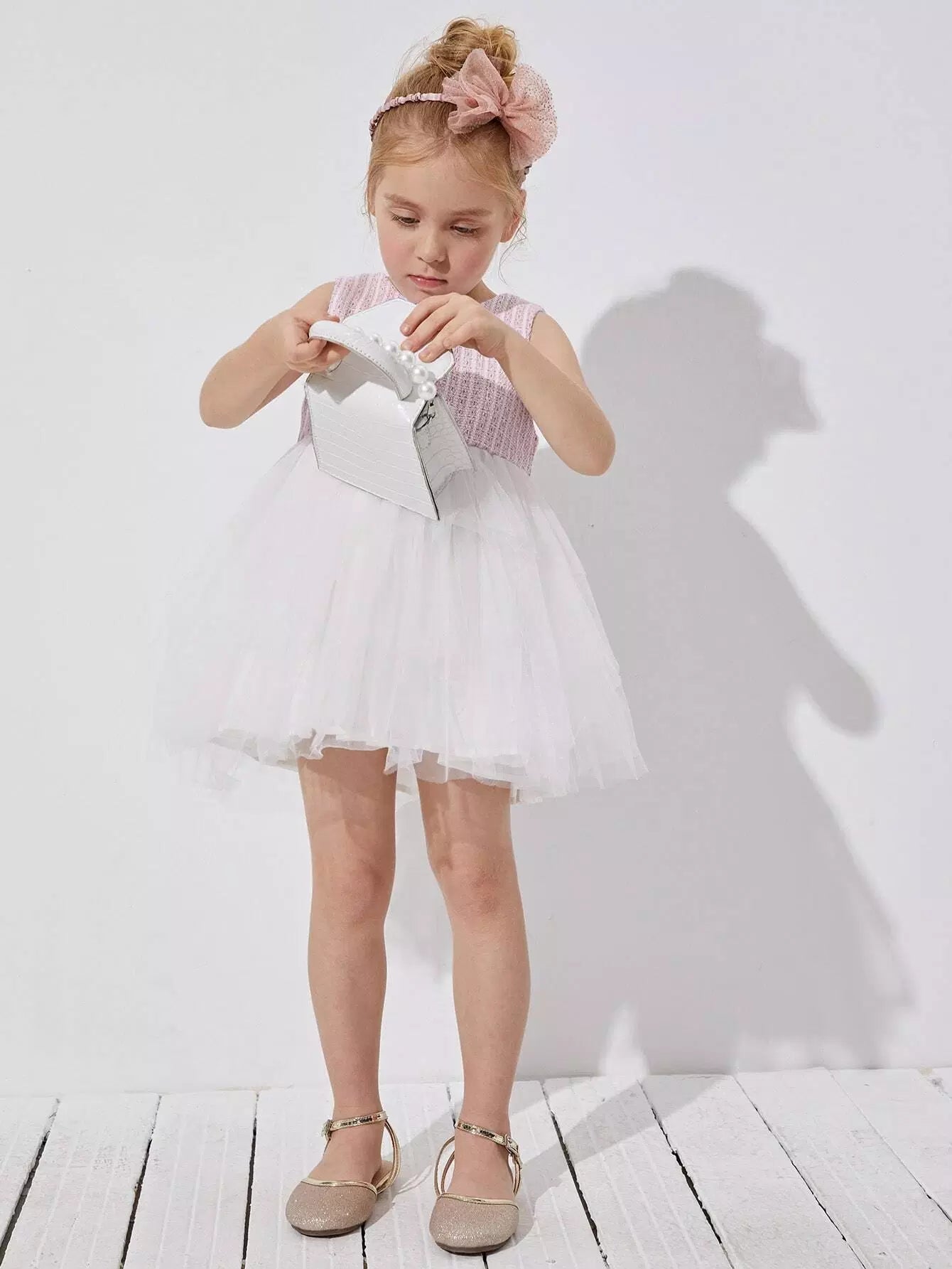 الأطفال - فستان كومبو ذو صدرية شبكية شفافة وحاشية واسعة للفتيات الصغيرات