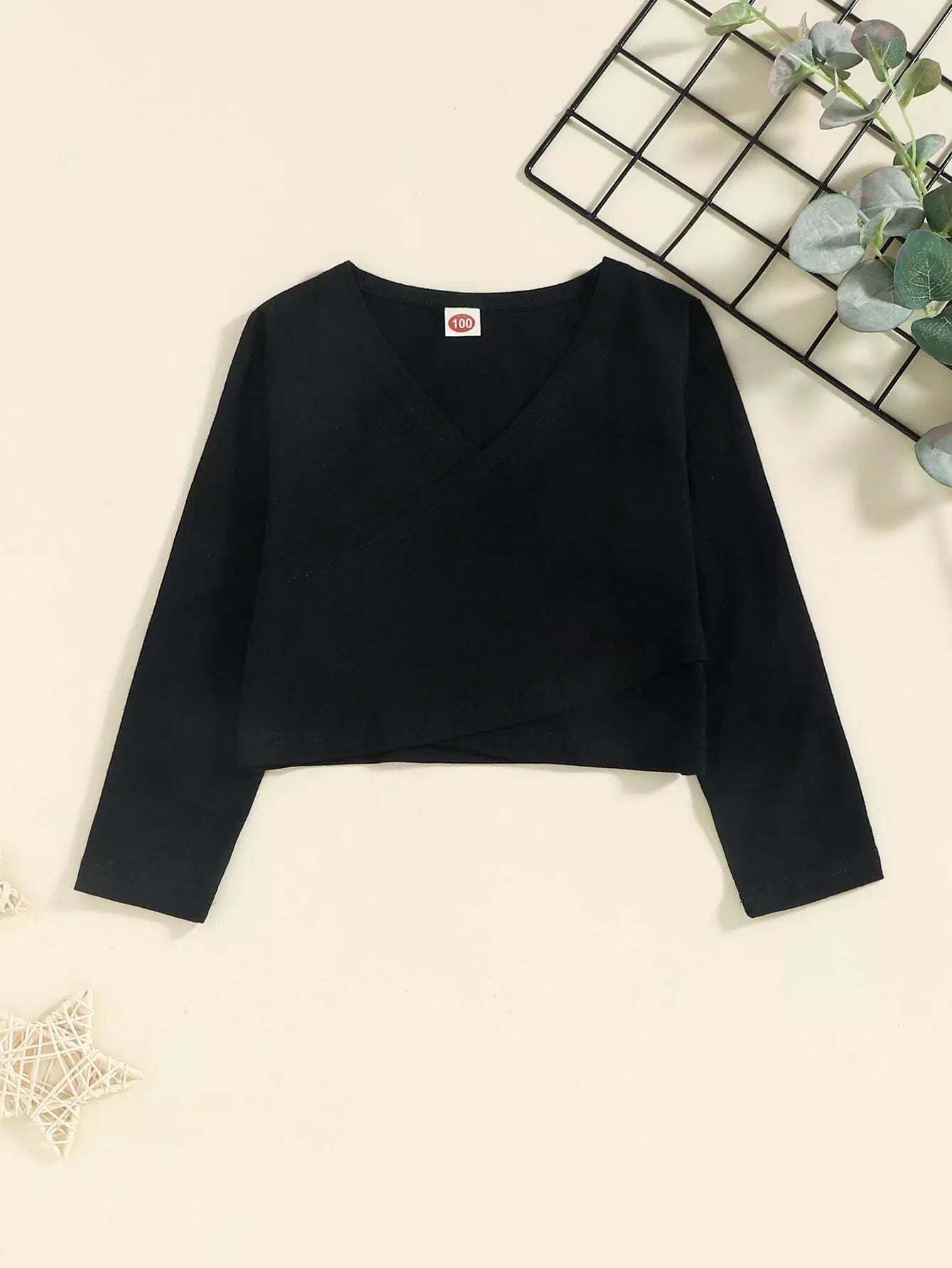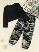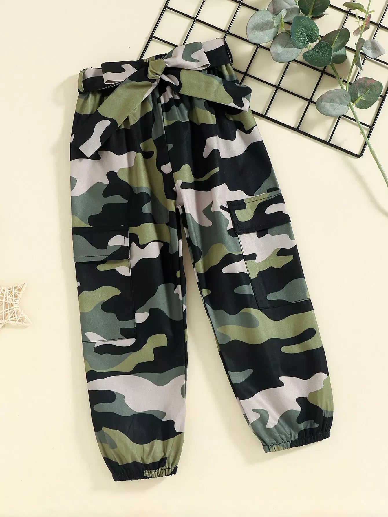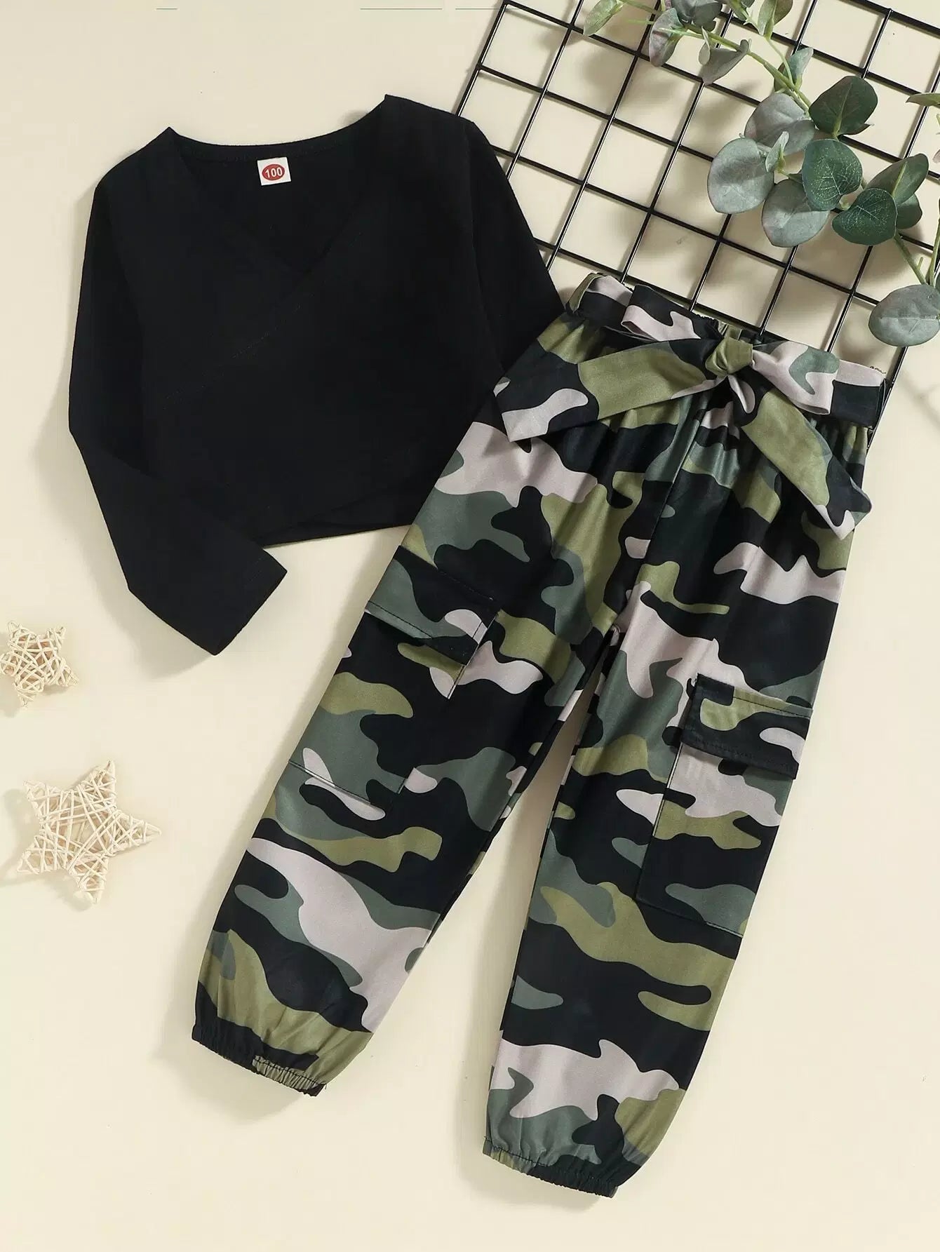تيشيرت برقبة على شكل حرف V للفتيات الصغيرات وسروال كارجو بطباعة مموهة بدون حزام