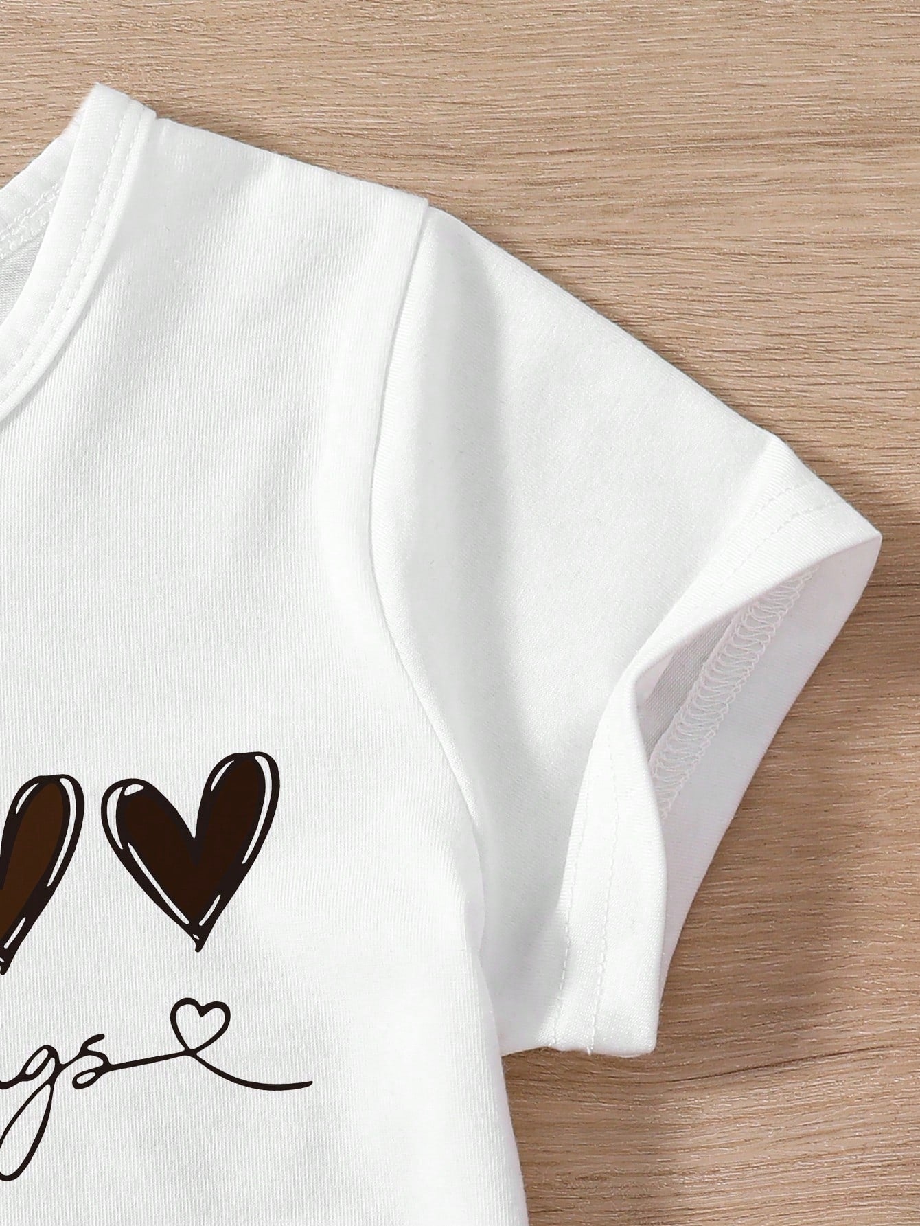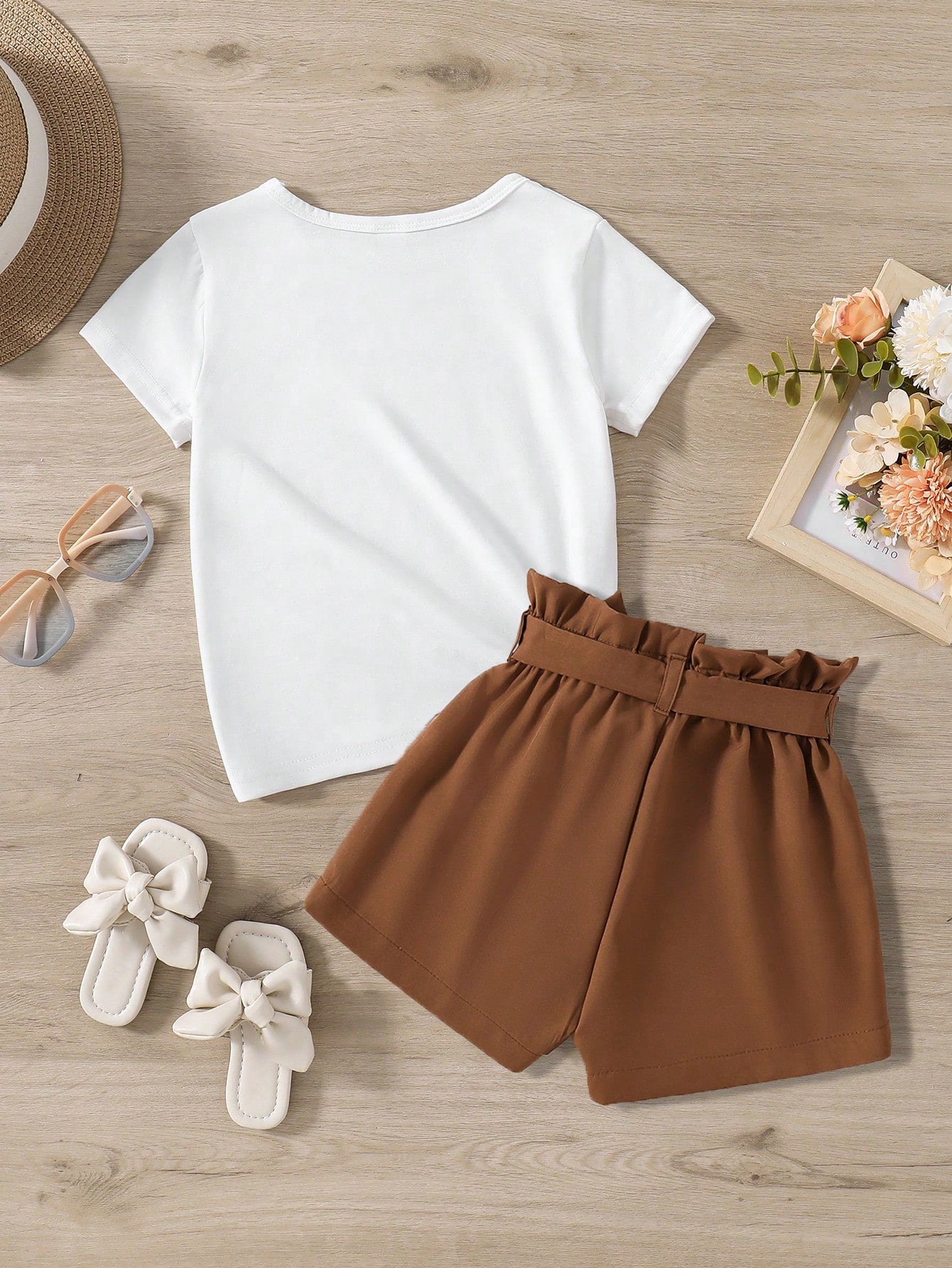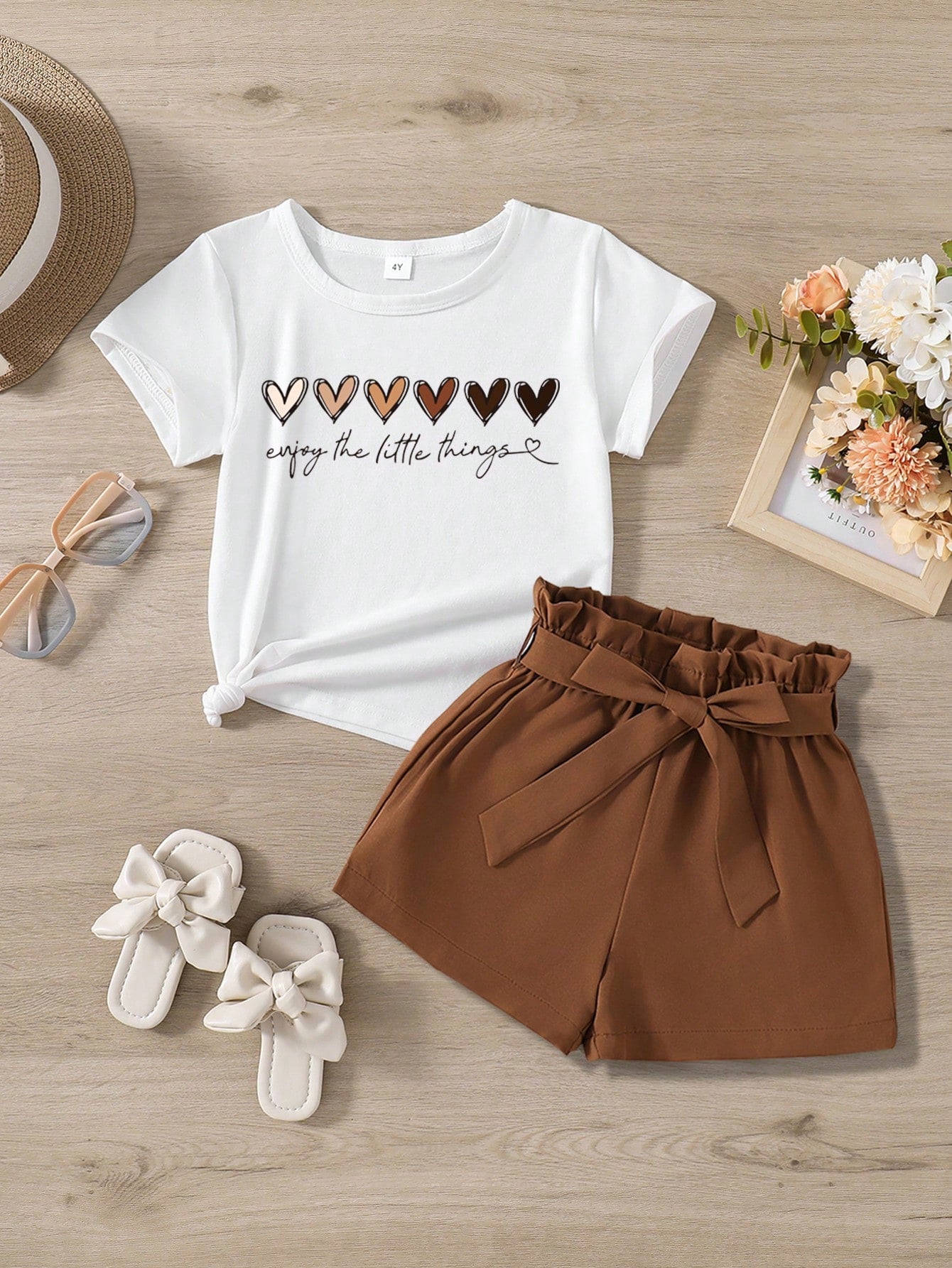 kids Young Girl Heart Print Short-Sleeved T-Shirt And Paper Bag Waist Belted Shorts