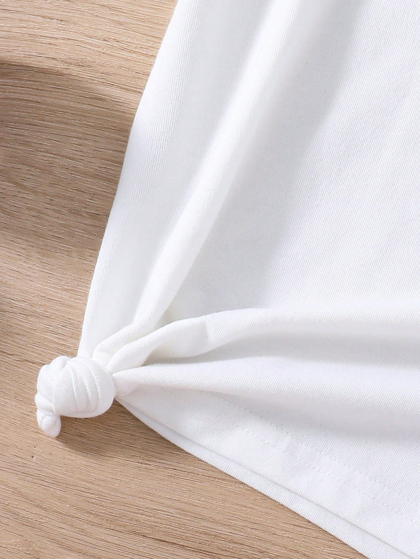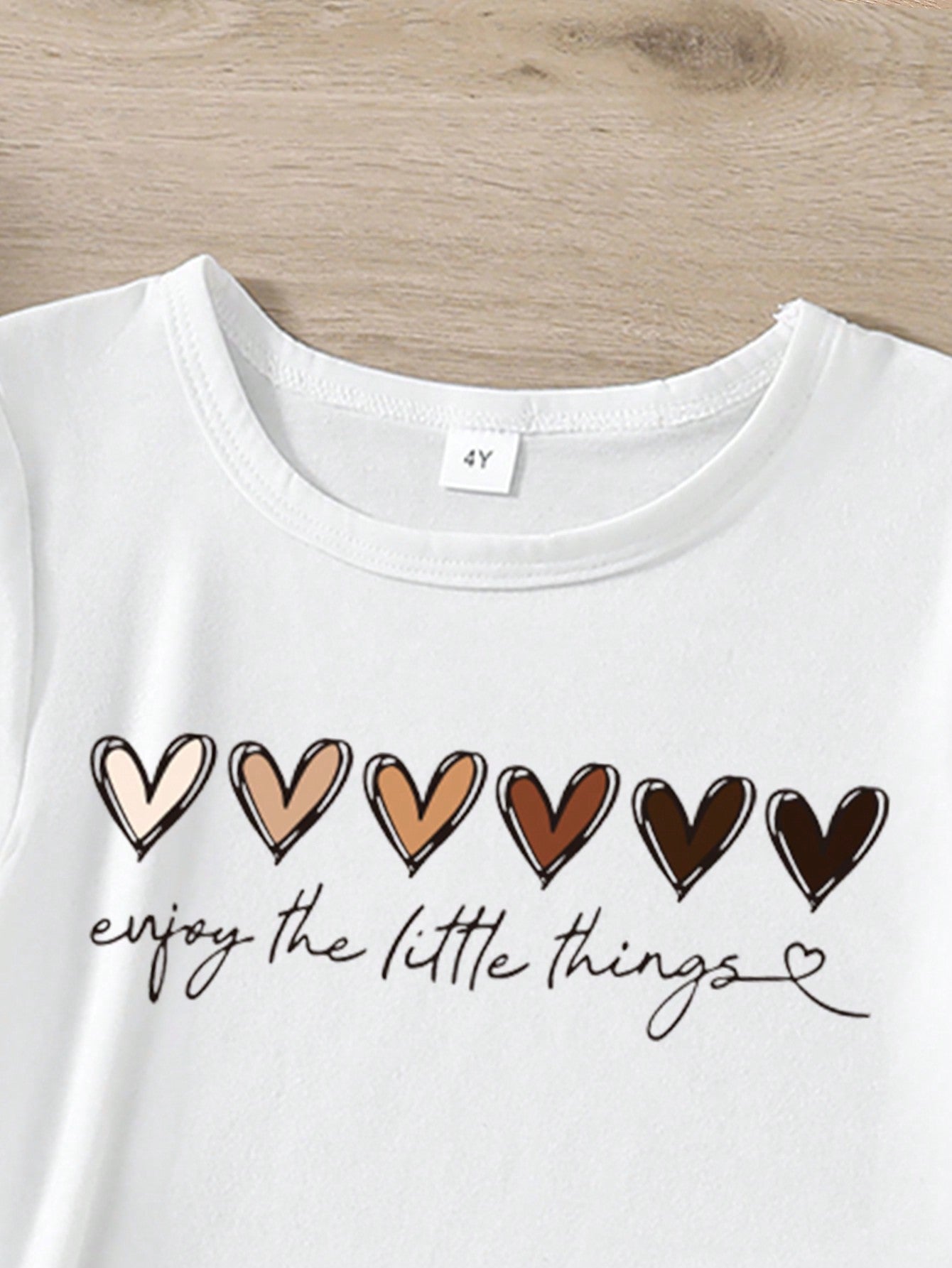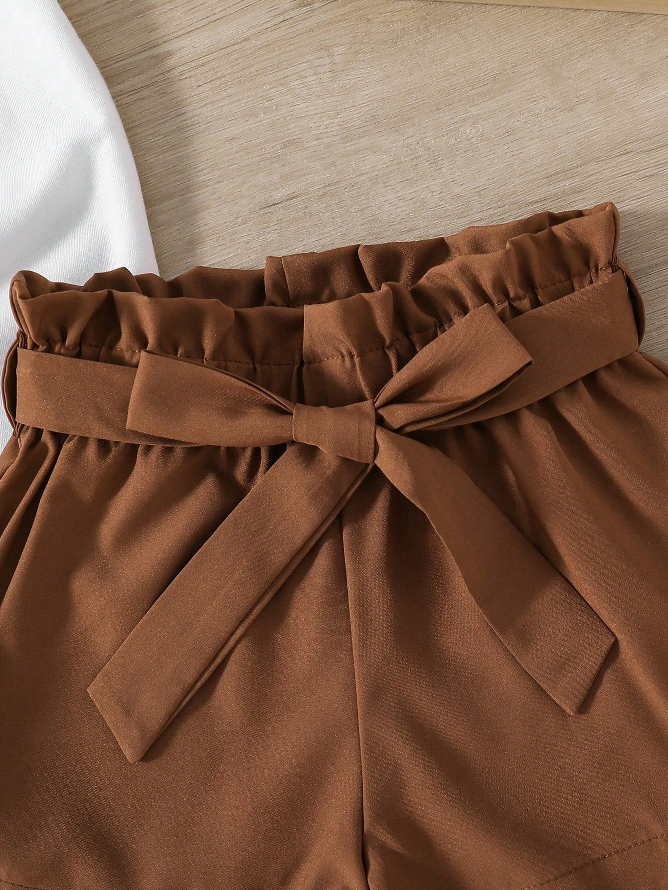 kids Young Girl Heart Print Short-Sleeved T-Shirt And Paper Bag Waist Belted Shorts
