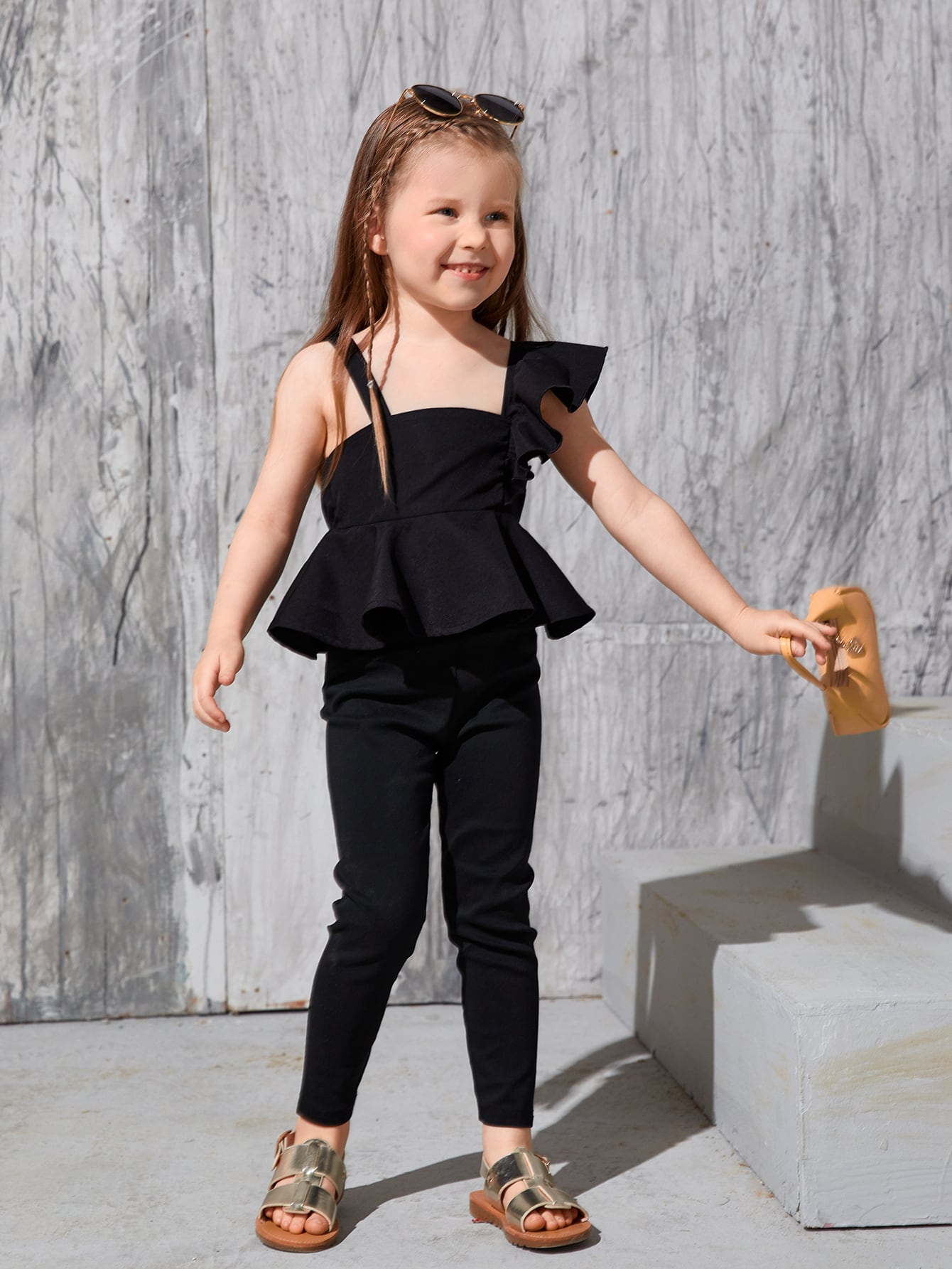 Young Girl Ruffle Trim Asymmetrical Neck Peplum Top & Pants