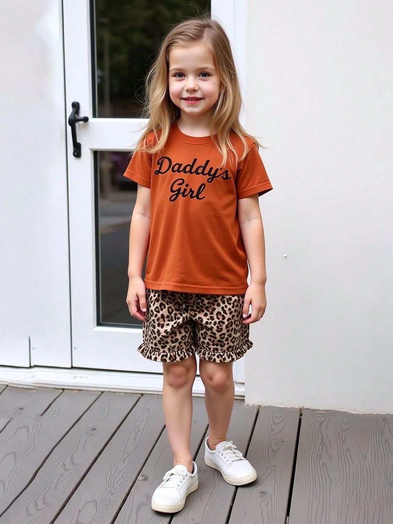 طقم تي شيرت بطبعة حروف صيفية جديدة لفتاة صغيرة + شورت بطبعة جلد النمر عصري