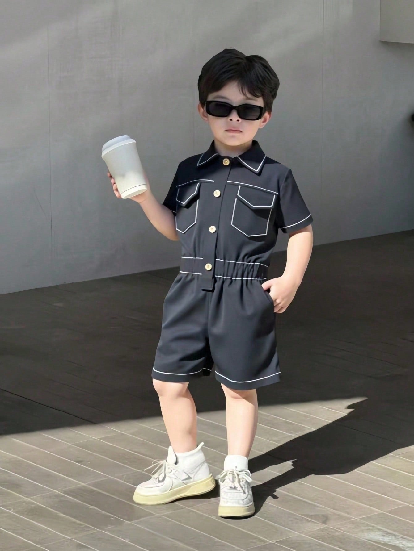 طقم واحد من بذلة قفز أنيقة غير رسمية للأولاد الصغار، قميص مريح وعصري بأزرار أمامية مع ياقة