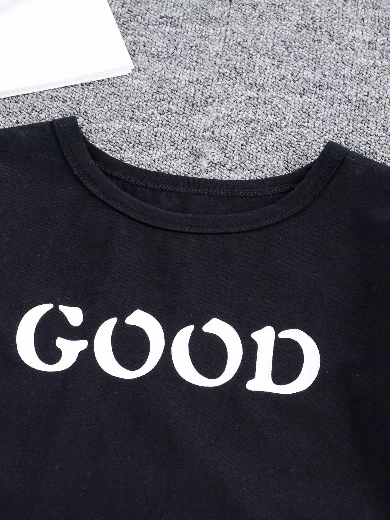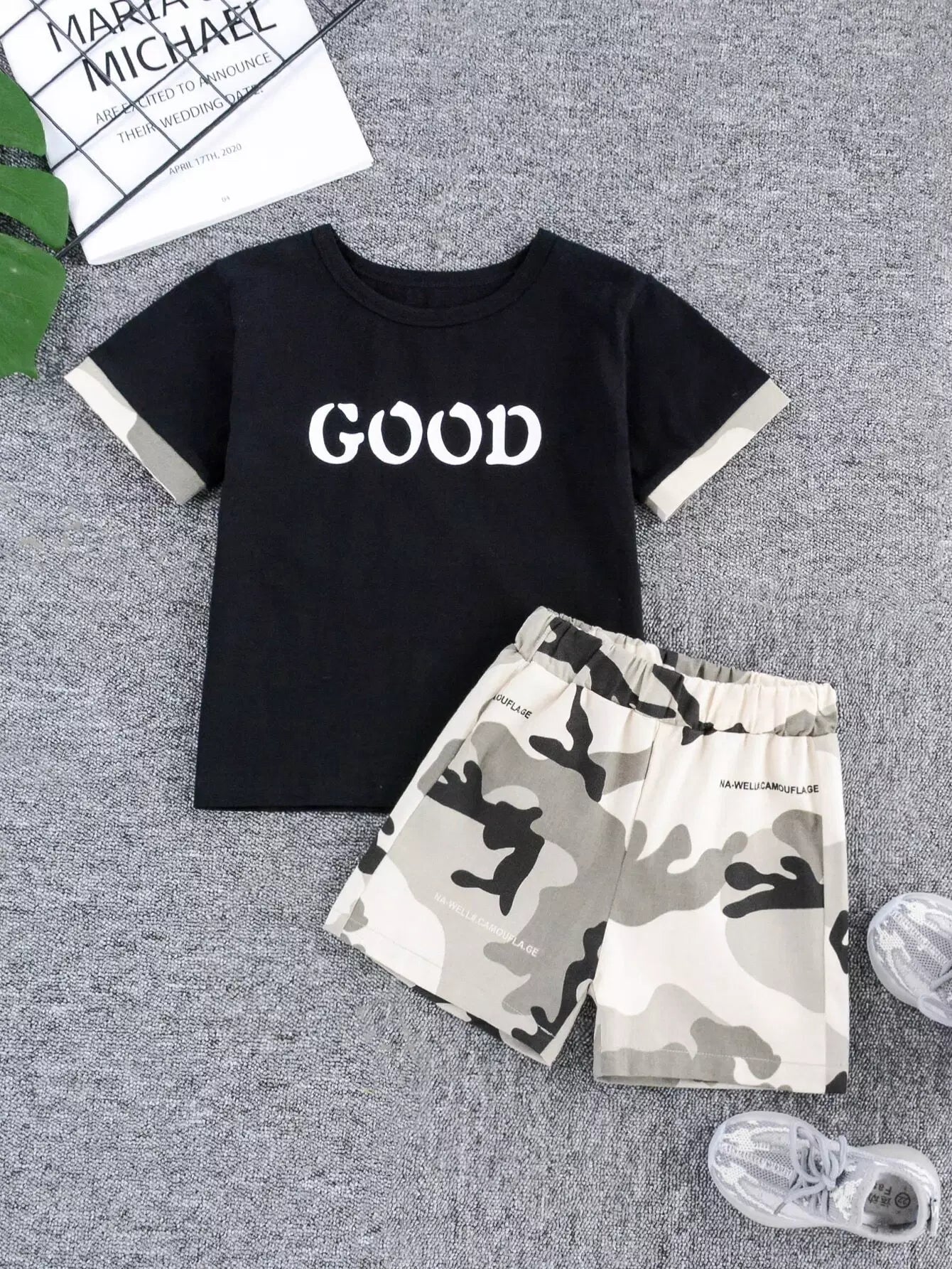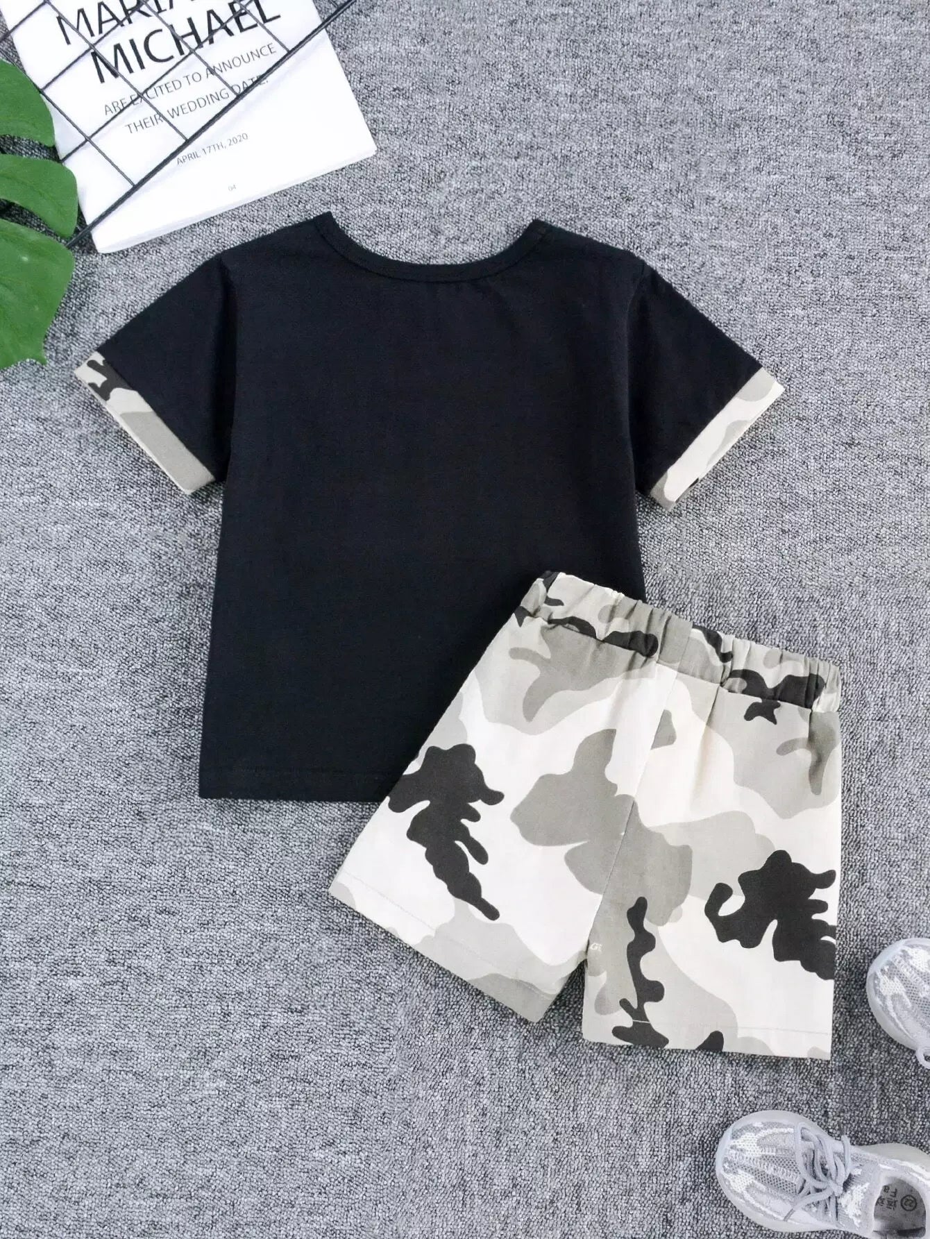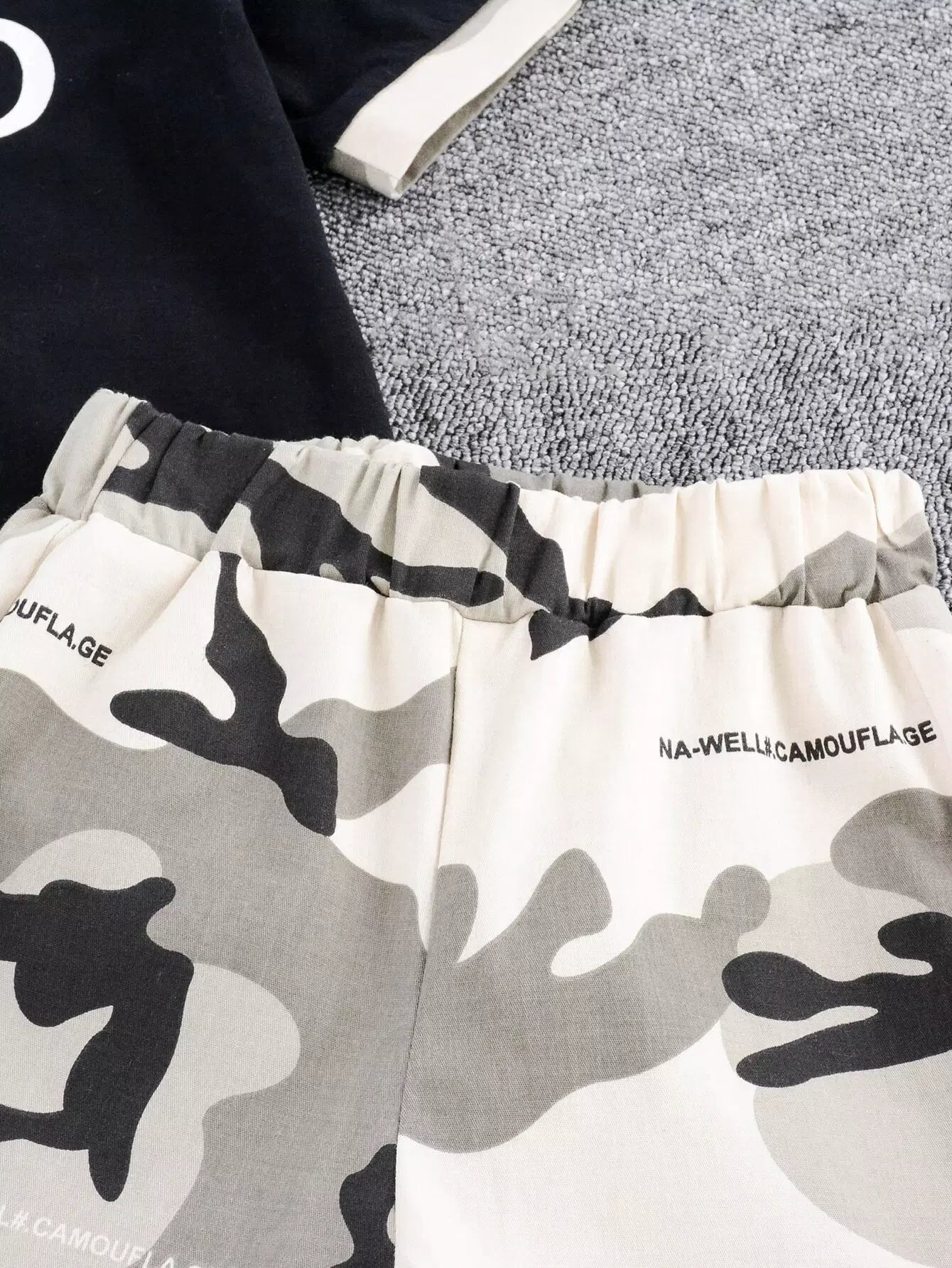 تي شيرت جرافيك برسوم حروف لطفل صغير مع شورت مموه
