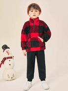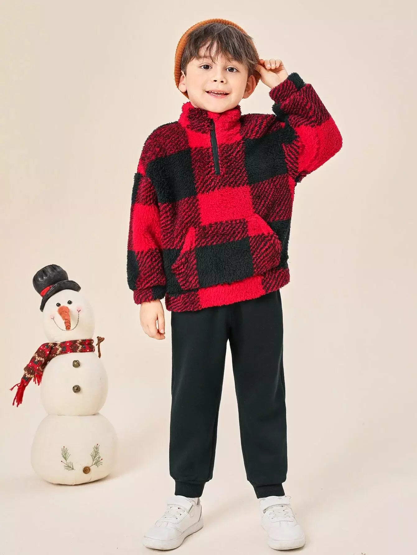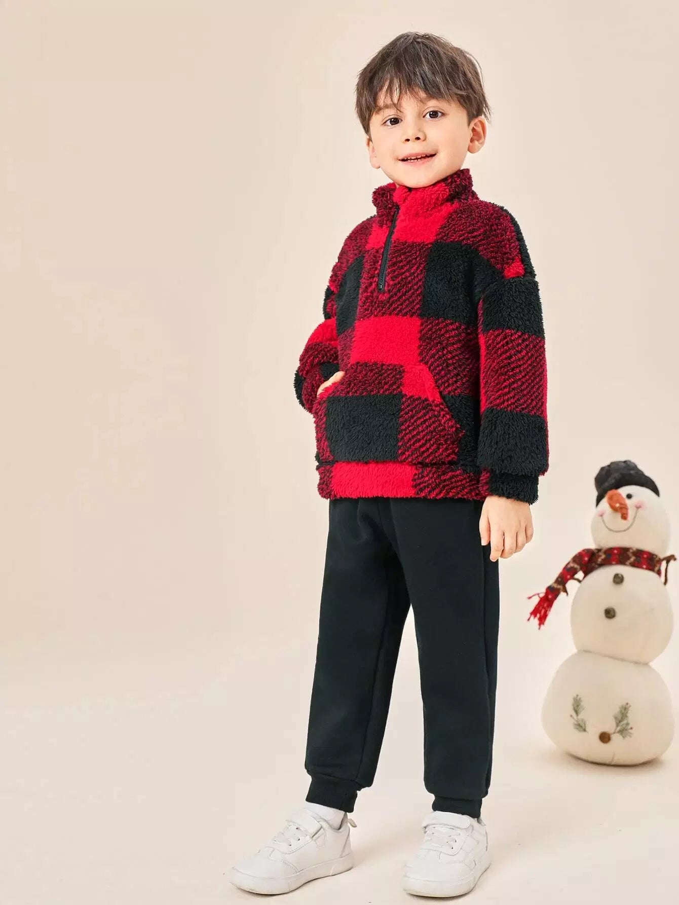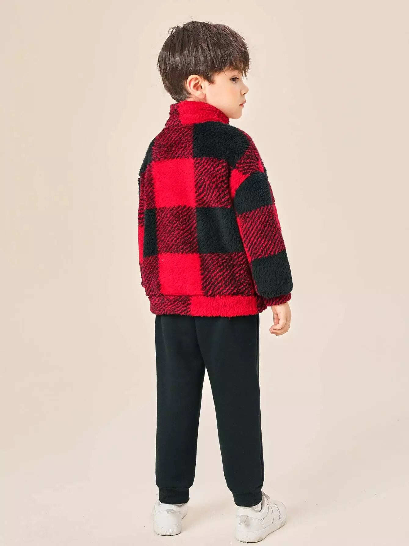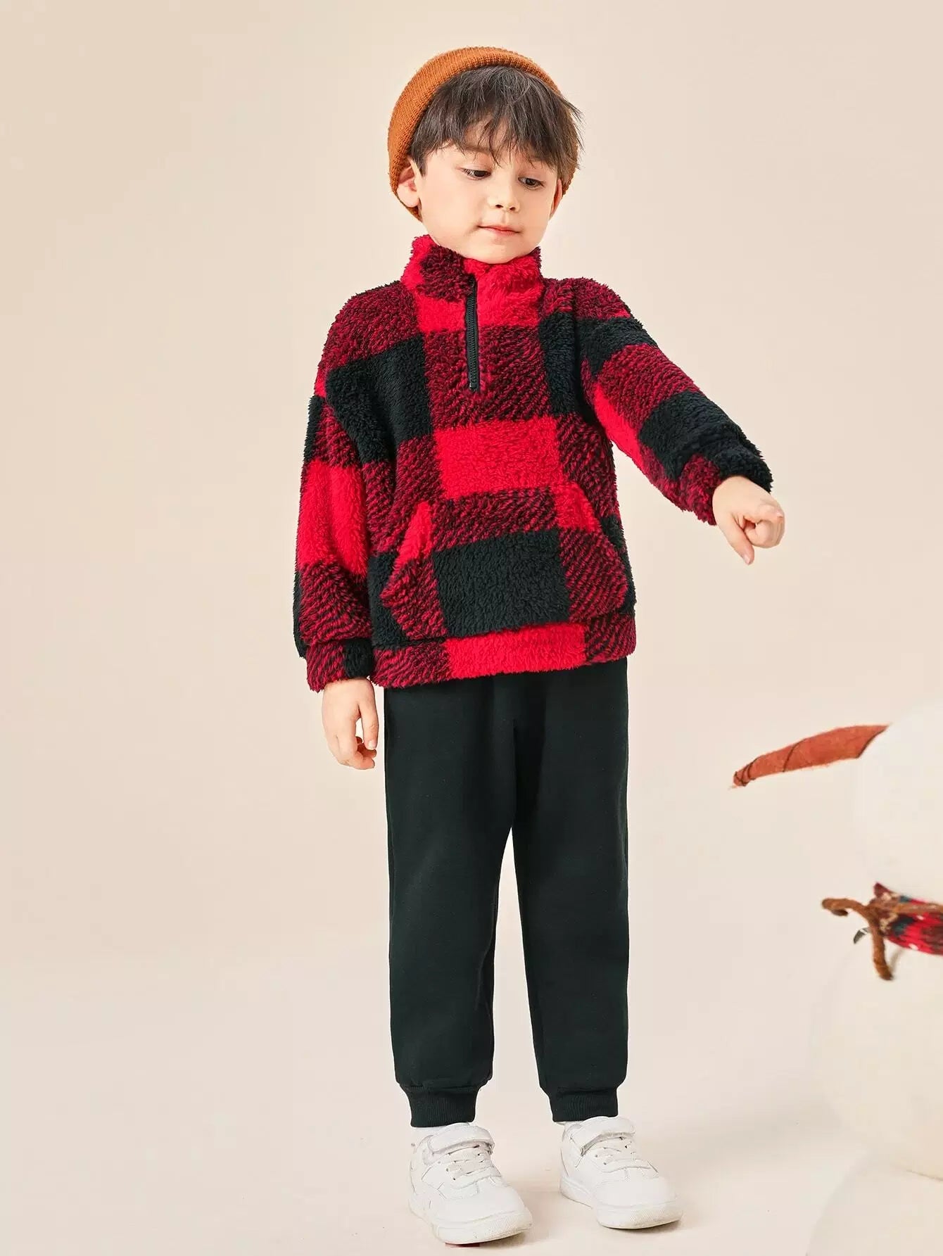 سويت شيرت وبنطلون رياضي بنصف سحاب وكتف منسدلة بطبعة مربعات الجاموس للأولاد الصغار