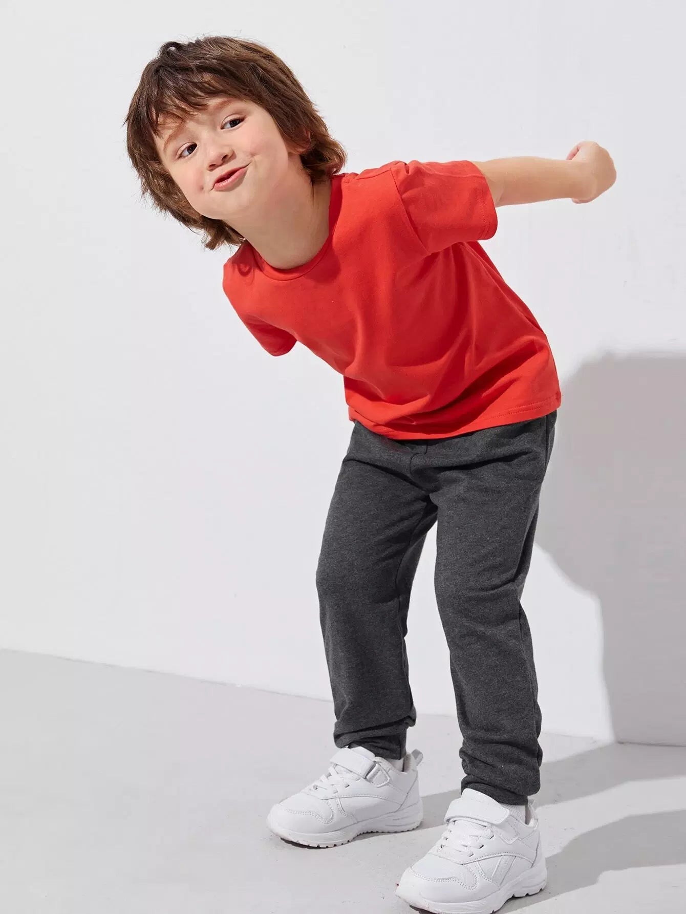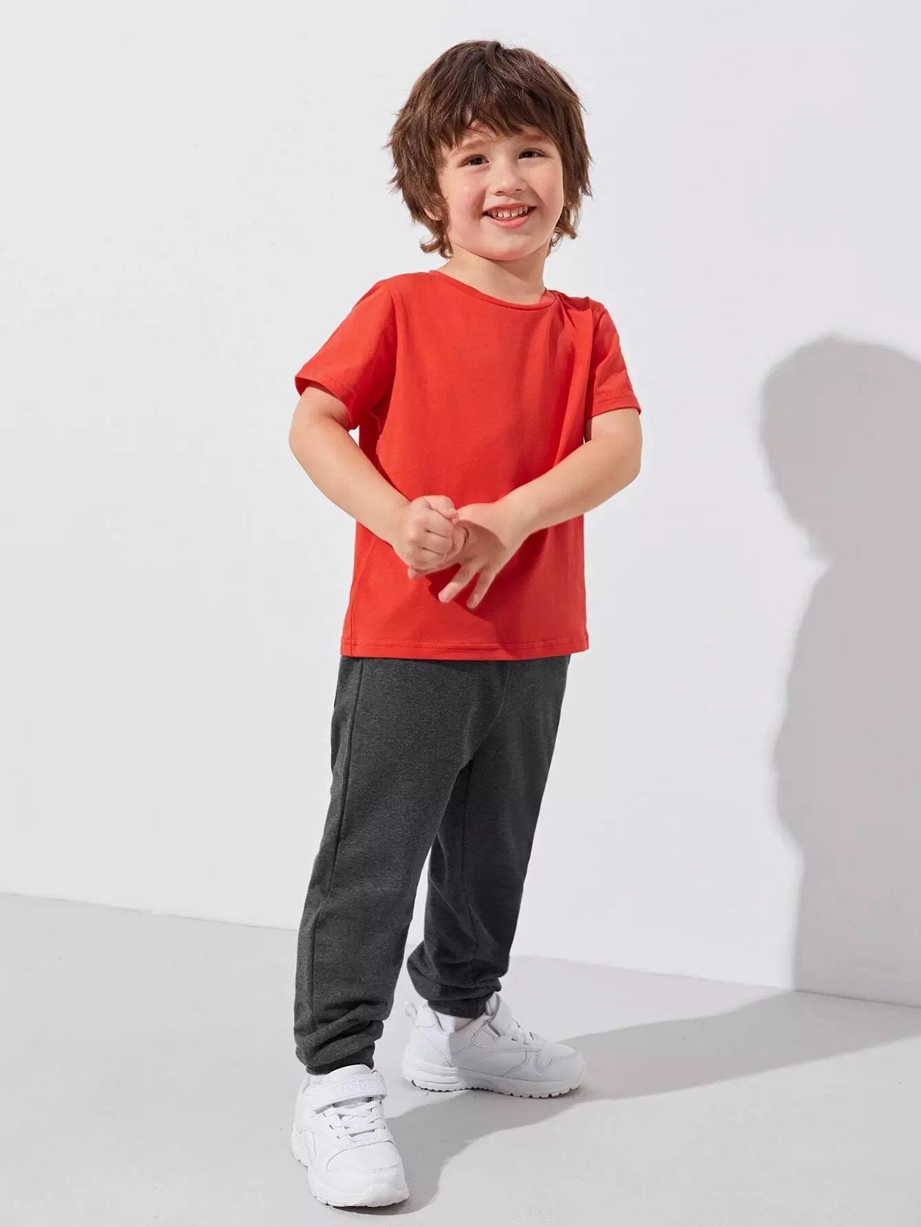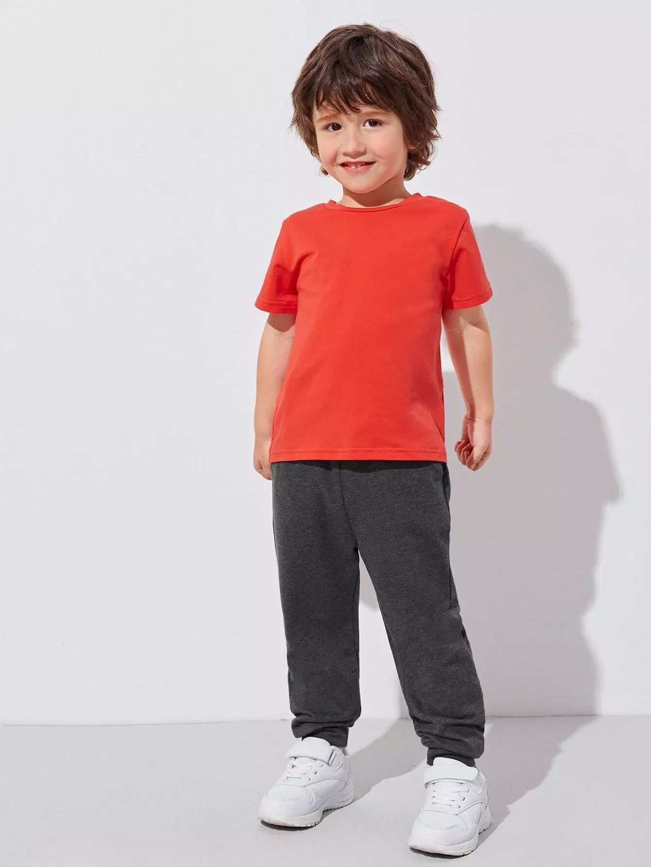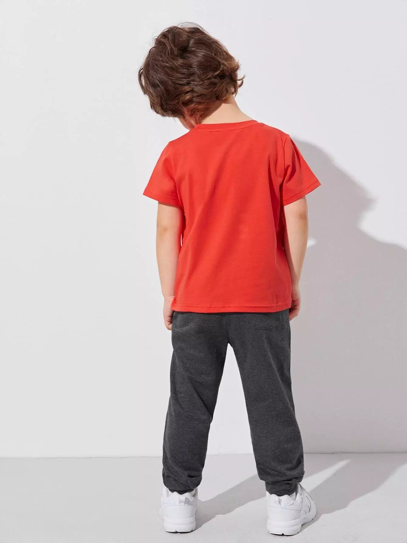 طقم تي شيرت قطني بياقة دائرية وبنطلون رياضي بجيوب مائلة للأولاد الصغار باللون الأحمر النيون