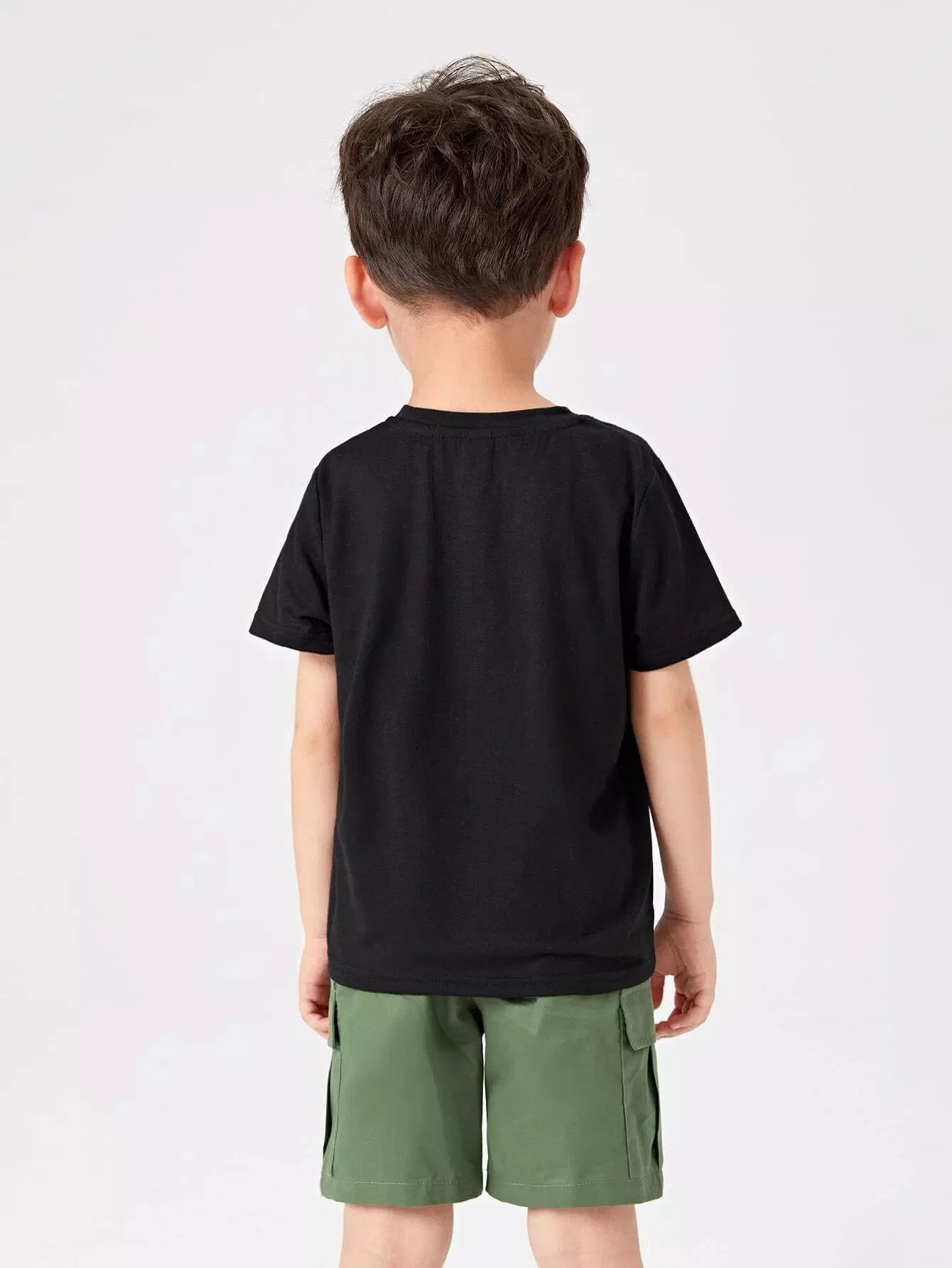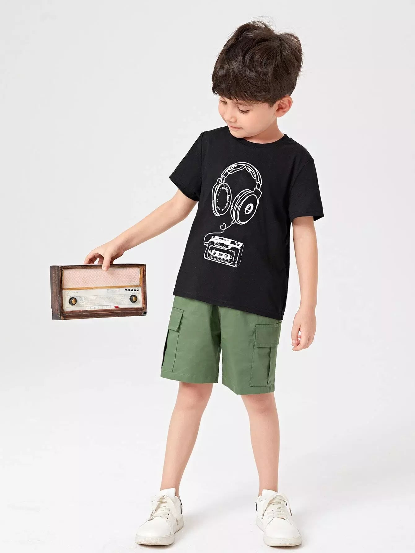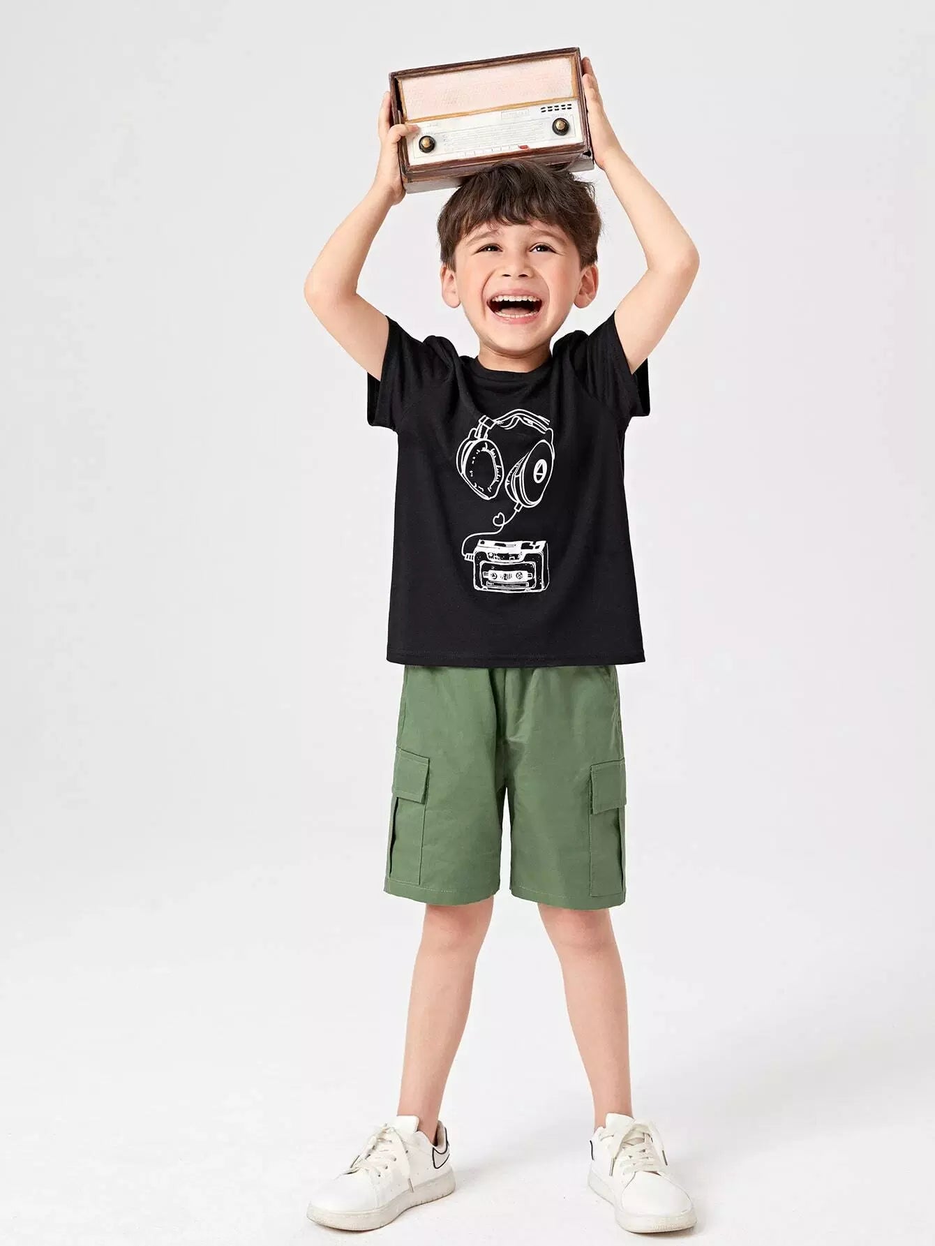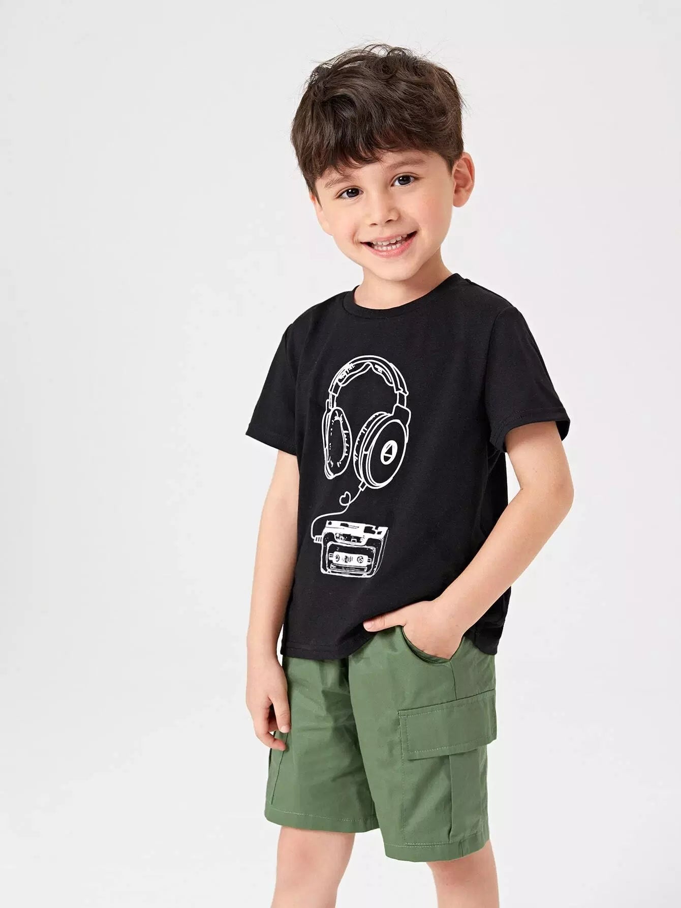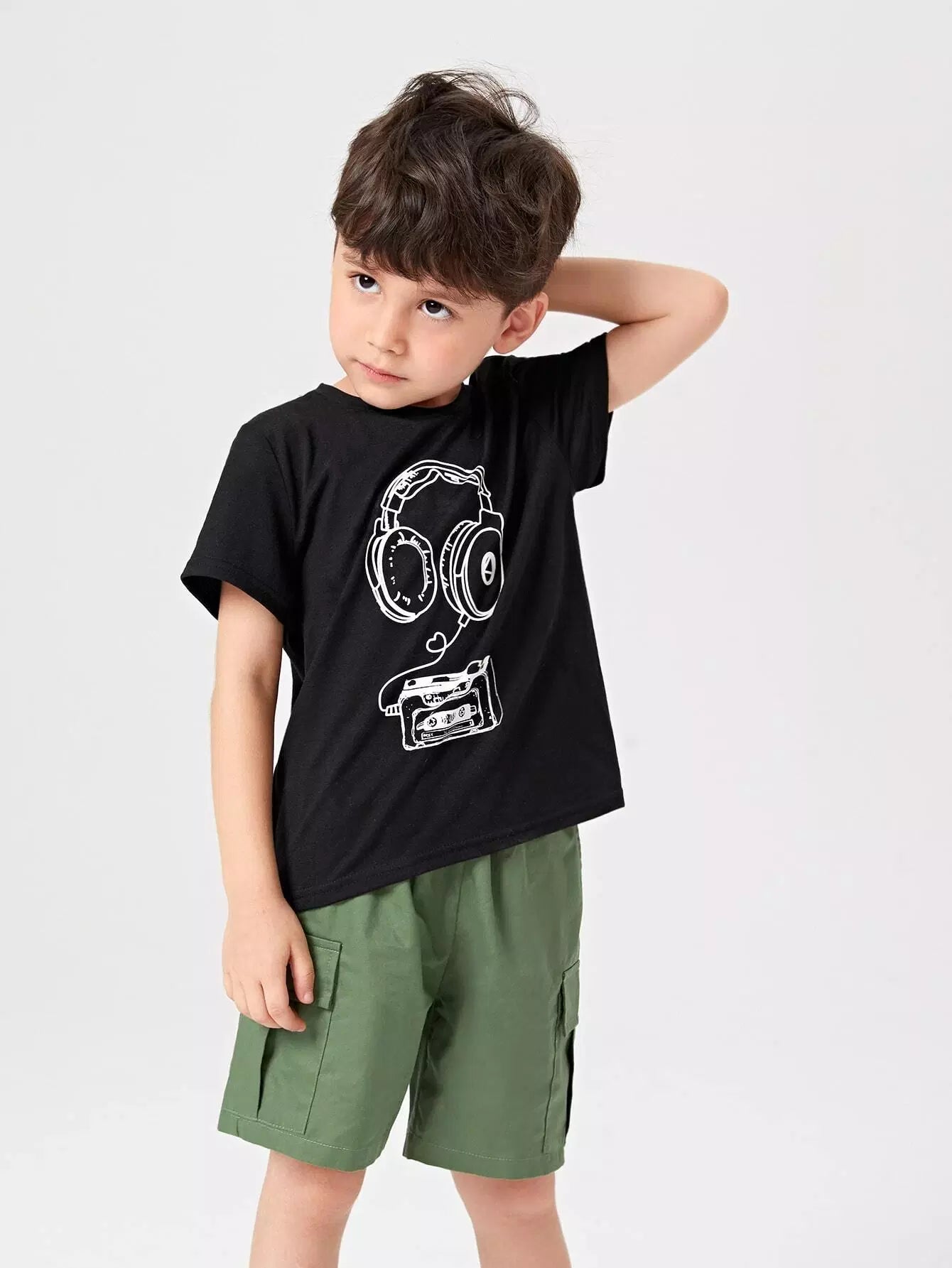 تي شيرت مطبوع عليه سماعة رأس للأولاد الصغار وشورت بجيب قابل للطي