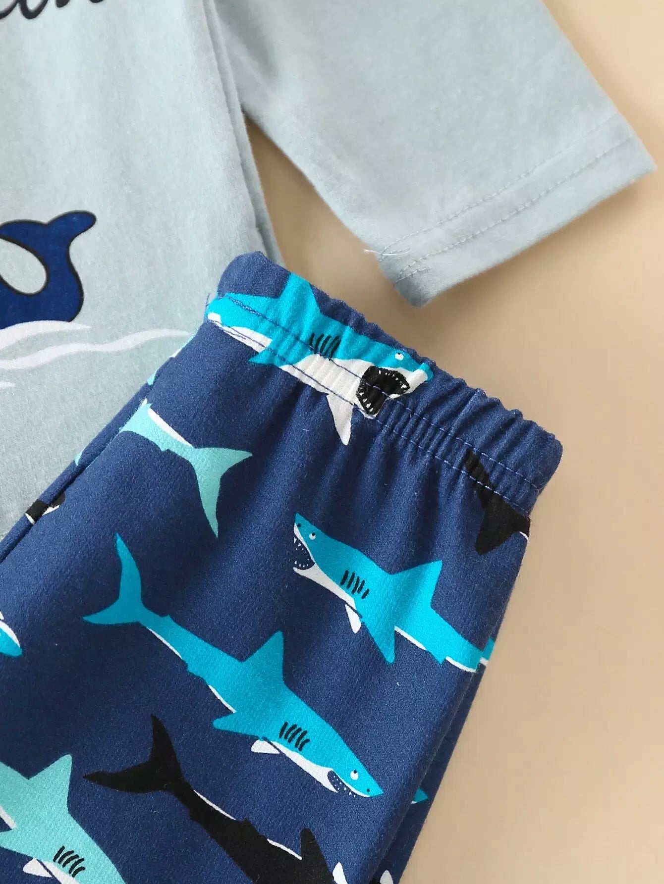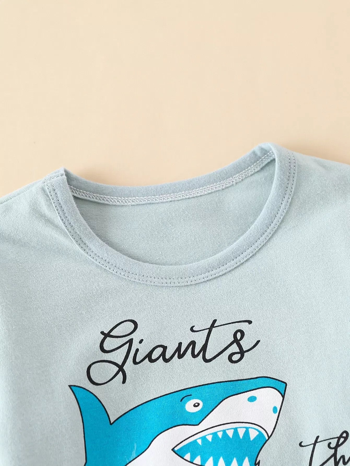 تي شيرت وبنطلون بنقشة حروف وقرش للأولاد الصغار