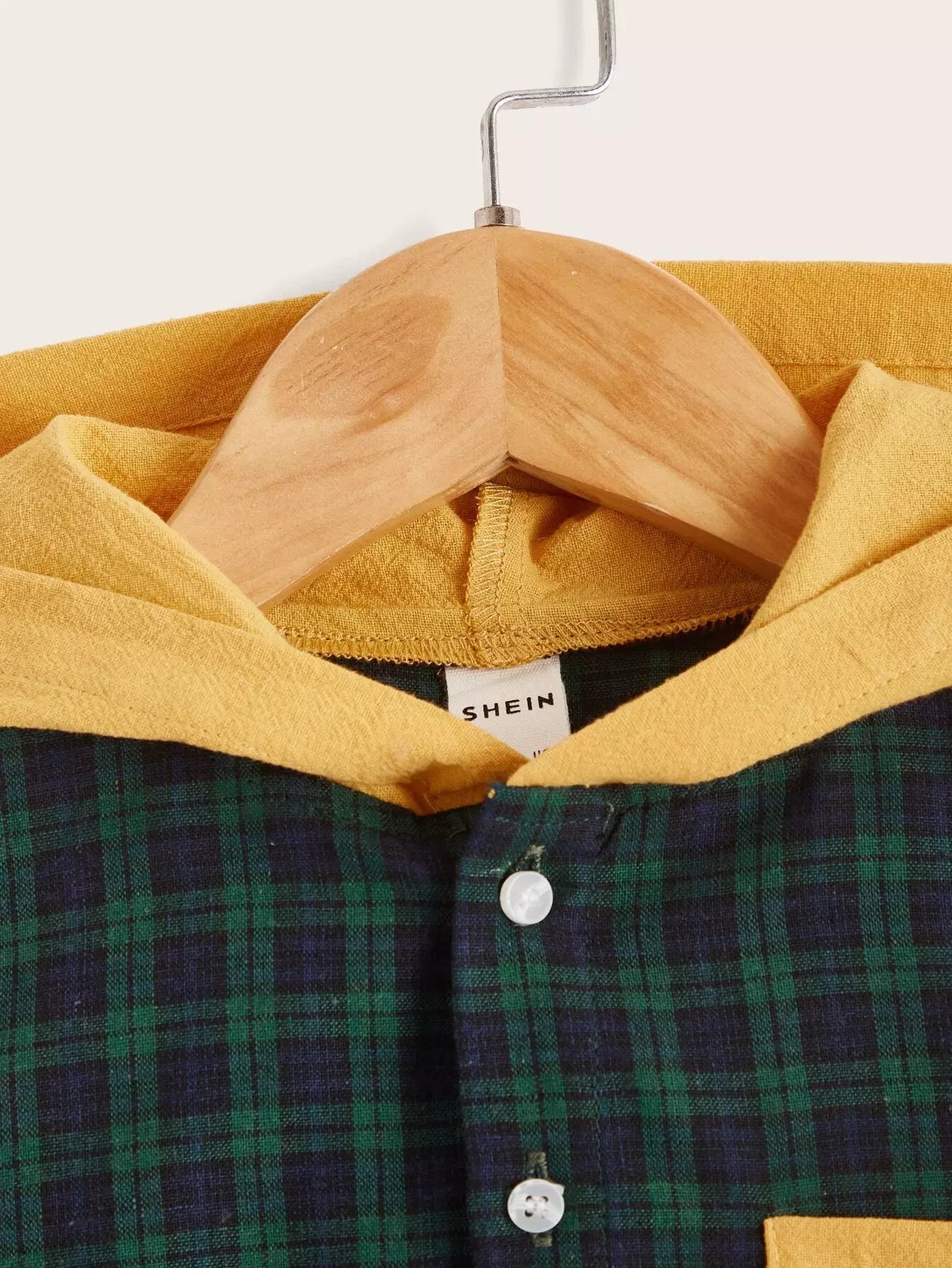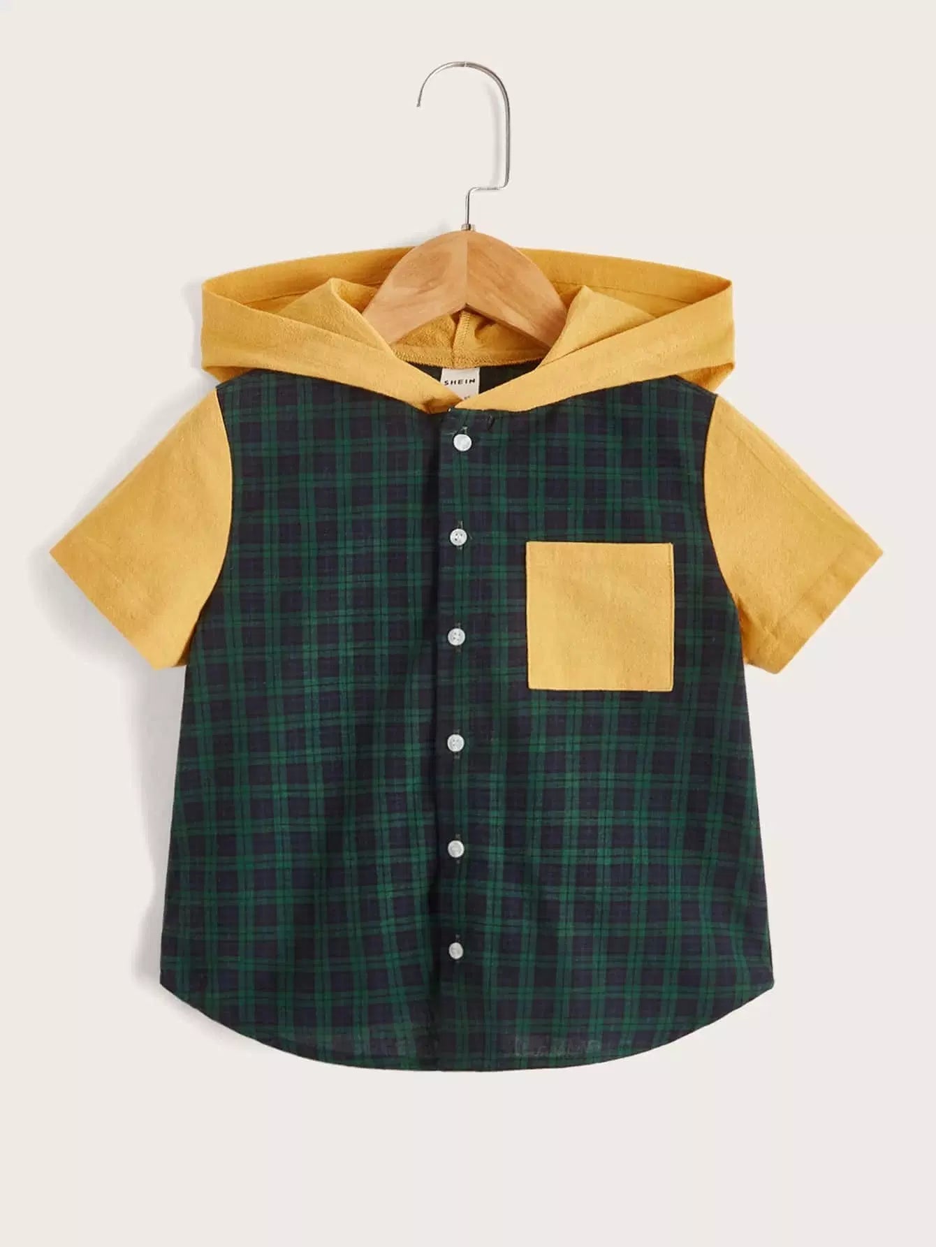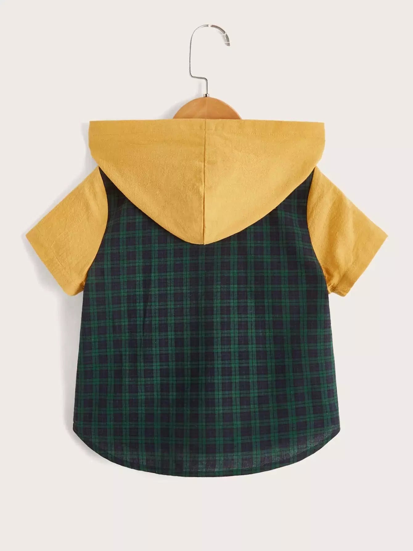 قميص بغطاء رأس وأزرار أمامية بطبعة مربعات للأولاد الصغار