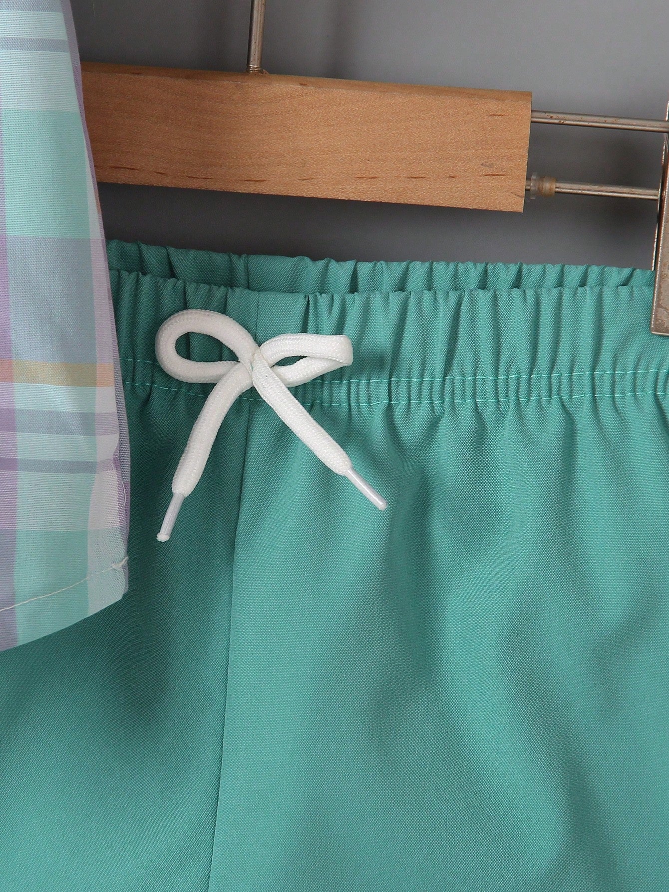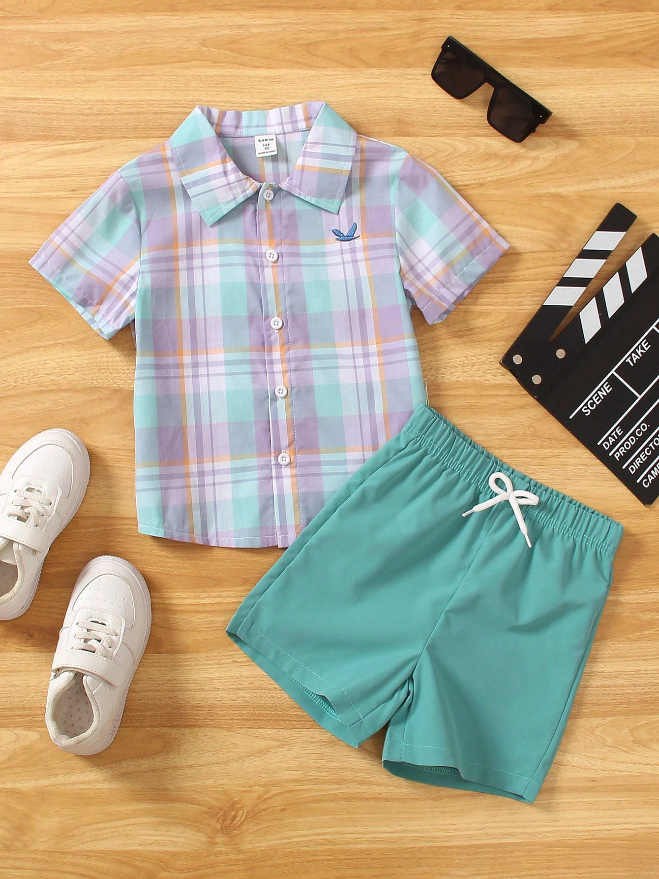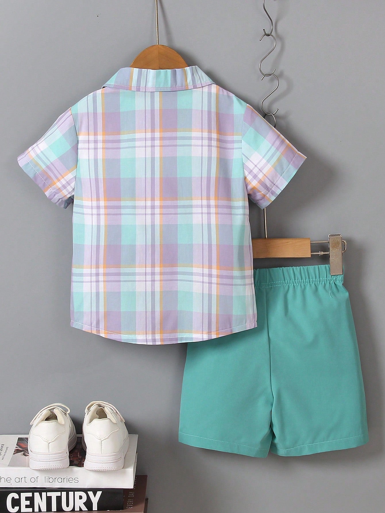 Young Boy Plaid Breathable 2 Pieces Set, Suitable For Getaways, Holidays, Travels, Relaxation, Sunbathing,
