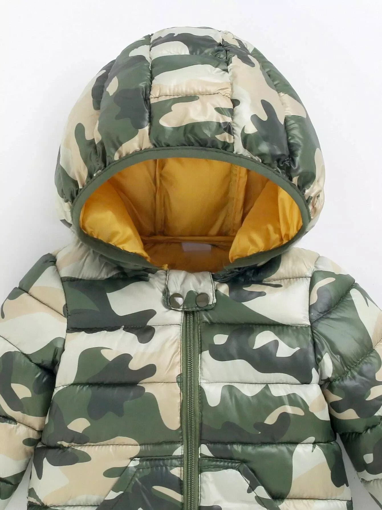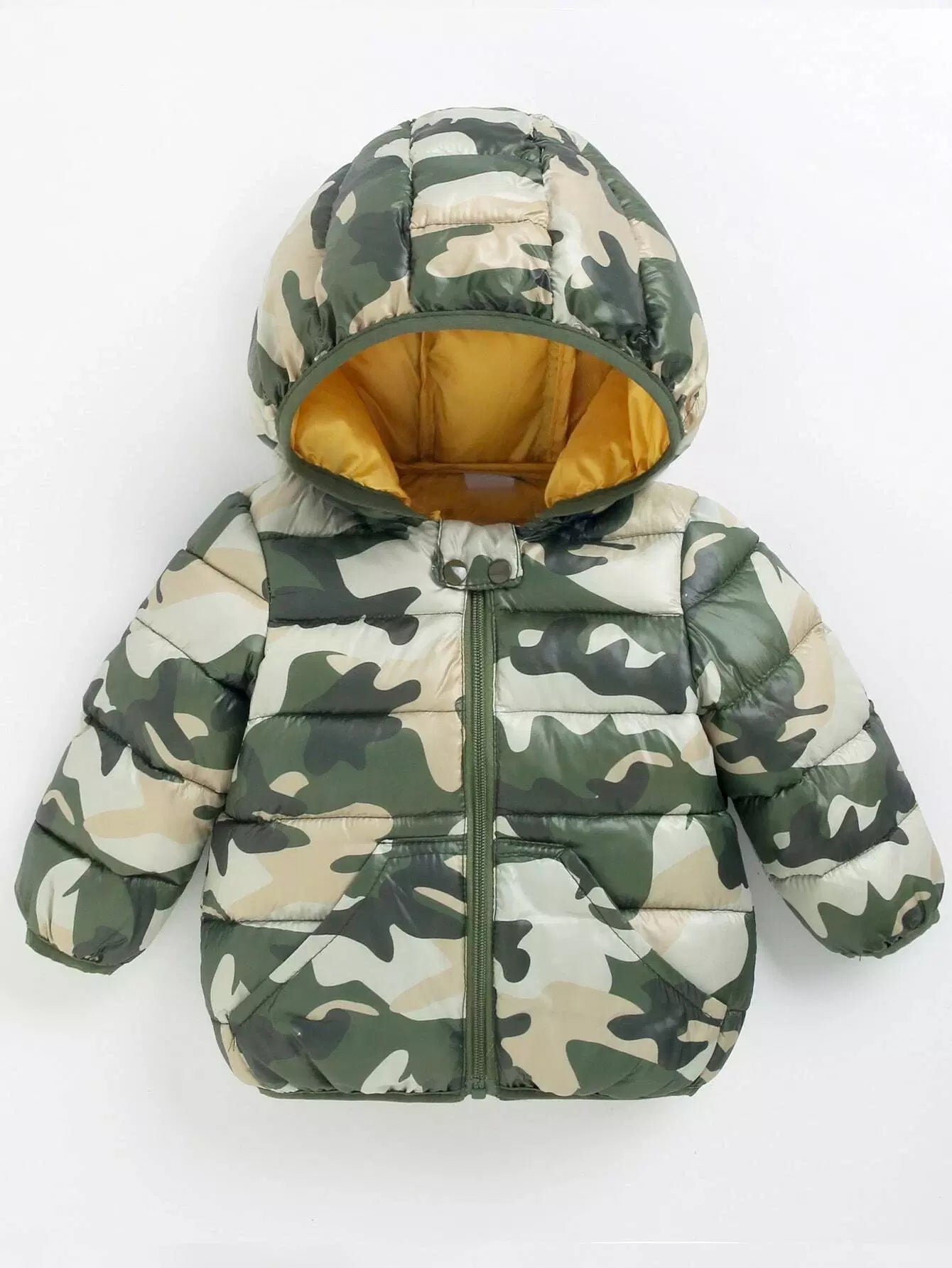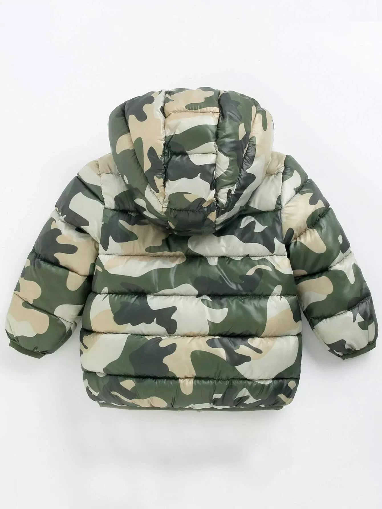معطف أطفال صغار بطبعة كامو للأولاد بغطاء منفوخة بغطاء رأس بسحاب