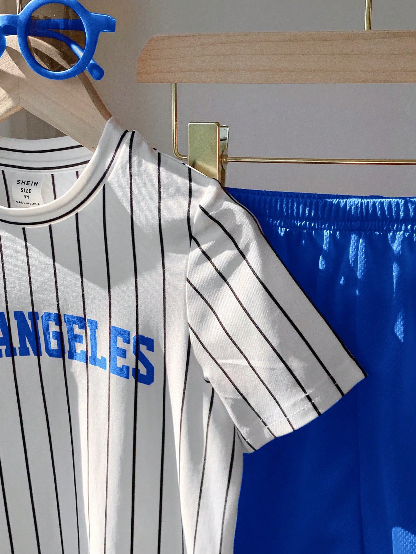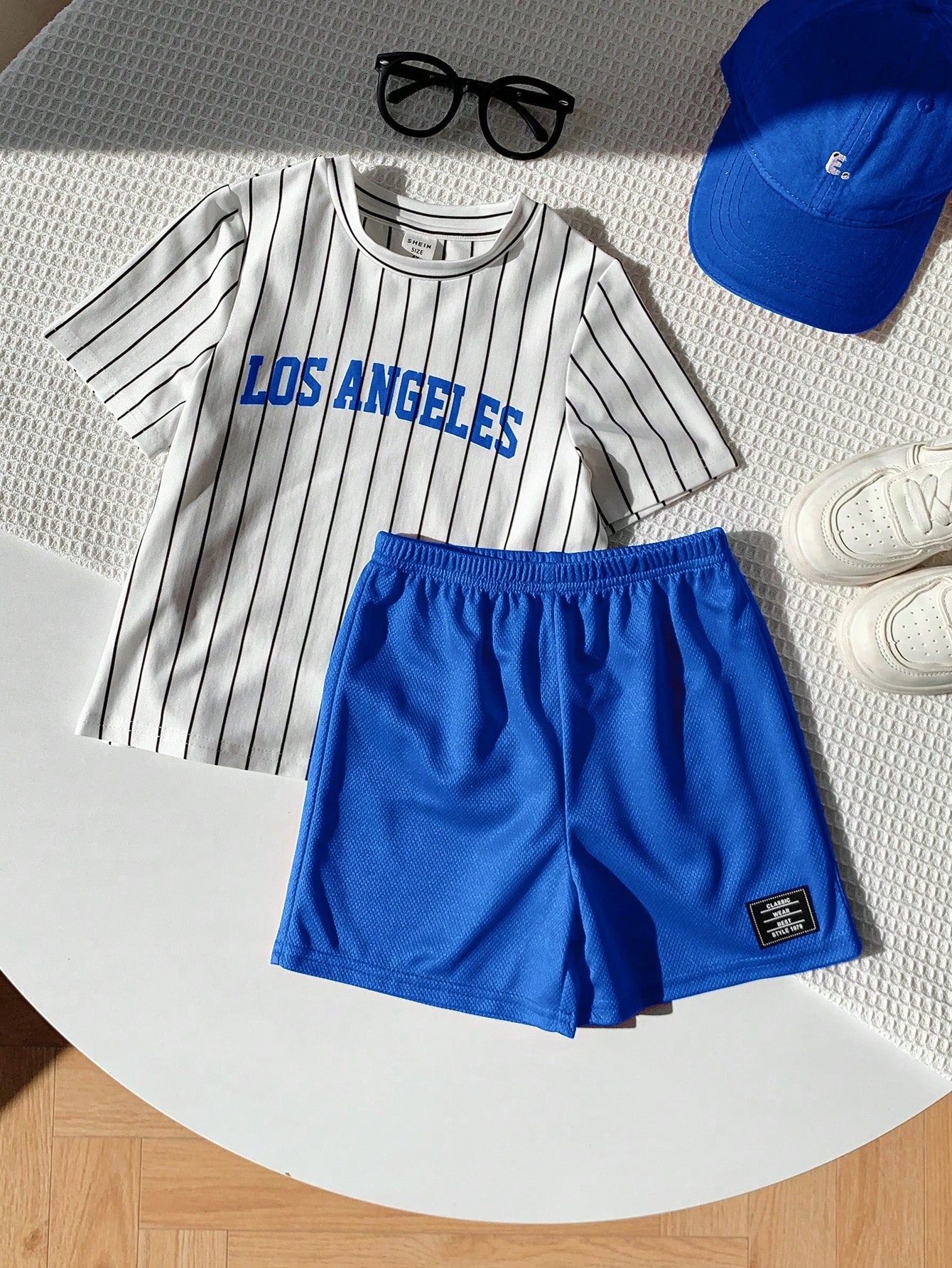 2pcs/Set Young Boys Casual Fashion Streetwear Loose Letter Print Striped Round Neck Short Sleeve T-Shirt