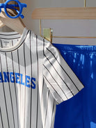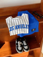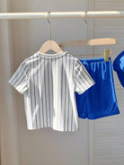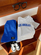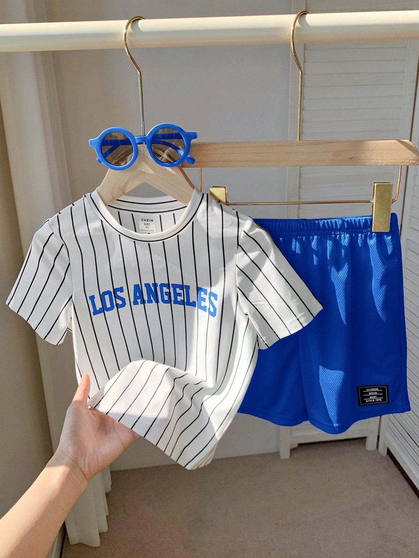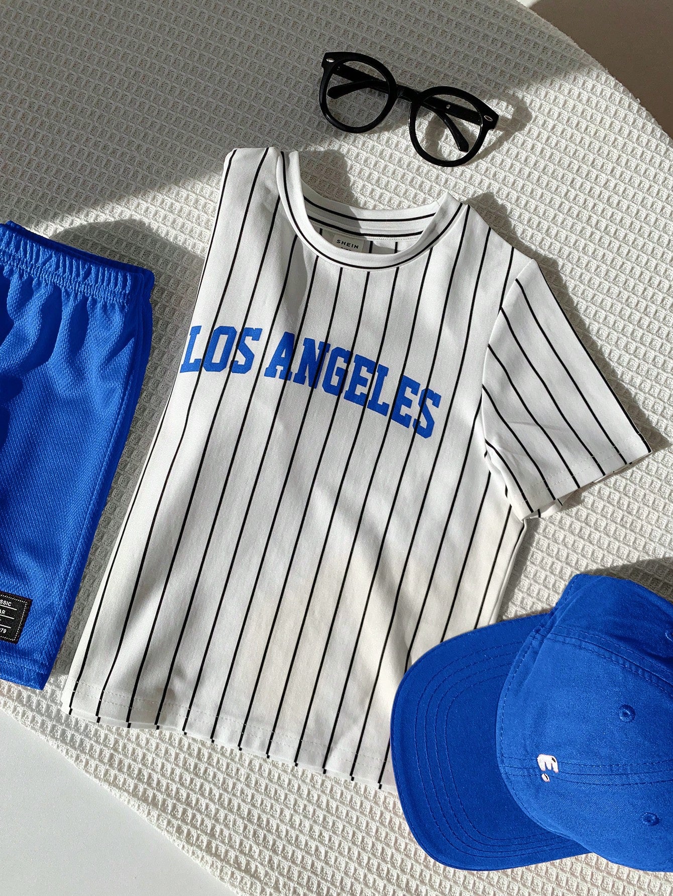 طقم من قطعتين من تي شيرتات قصيرة الأكمام مخططة بطباعة حروف فضفاضة للأولاد الصغار