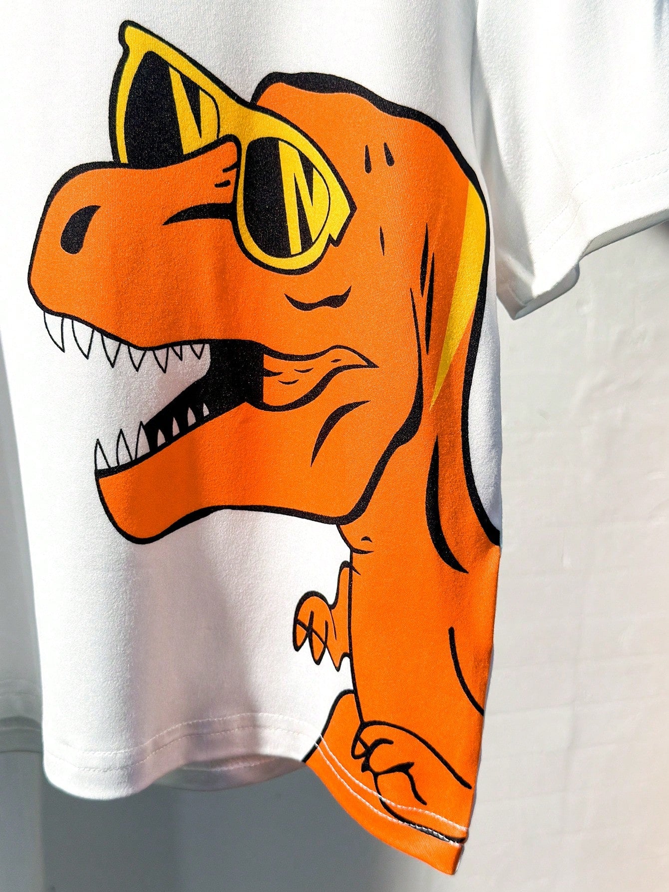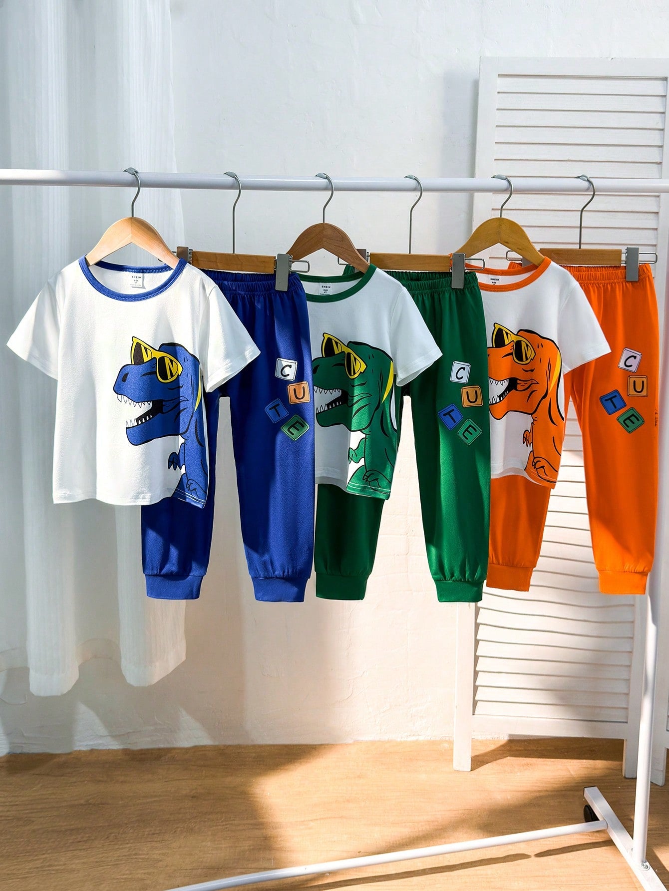 طقم بيجامة من SHEIN للأولاد الصغار بطبعة ديناصور مع بلوزة بأكمام قصيرة ورقبة دائرية وبنطلون برباط