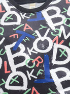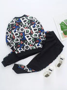 كنزة صوفية بنقشة رسومات حروف للأولاد الصغار وبنطال رياضي بحياكة جانبية بلون مغاير