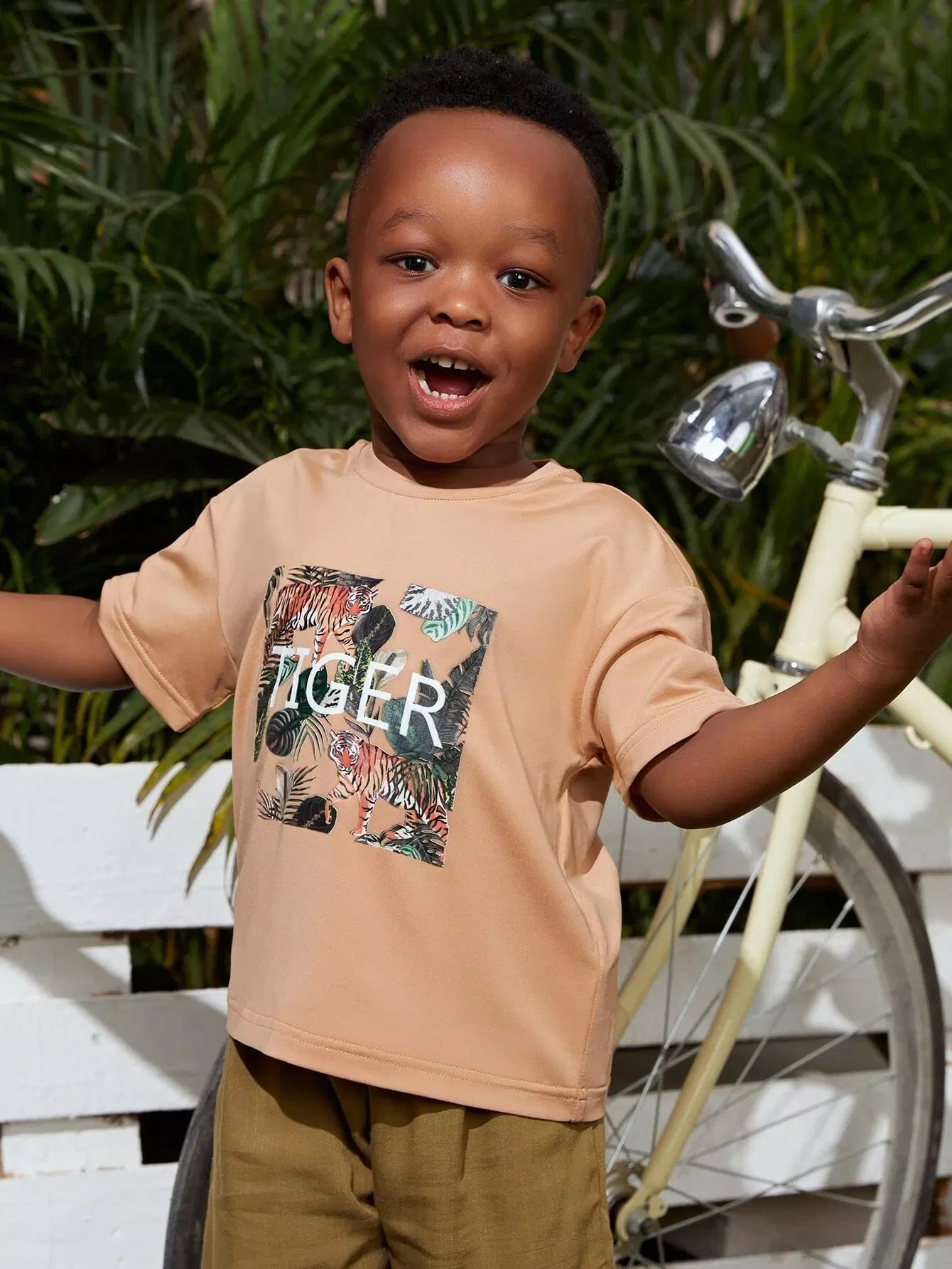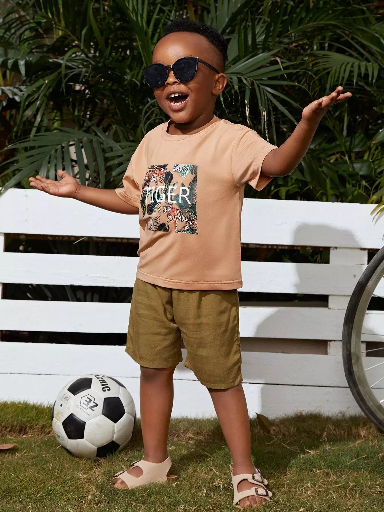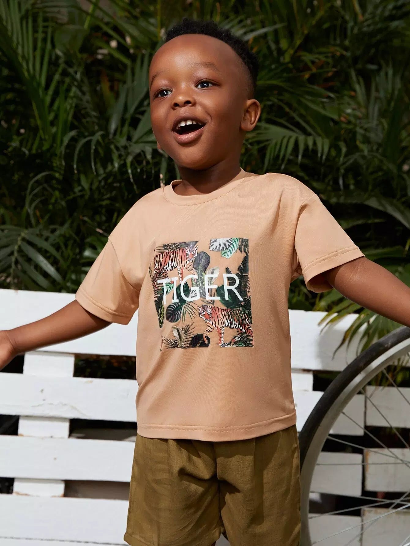 تي شيرت بطبعة حروف وأنماط استوائية للأولاد الصغار