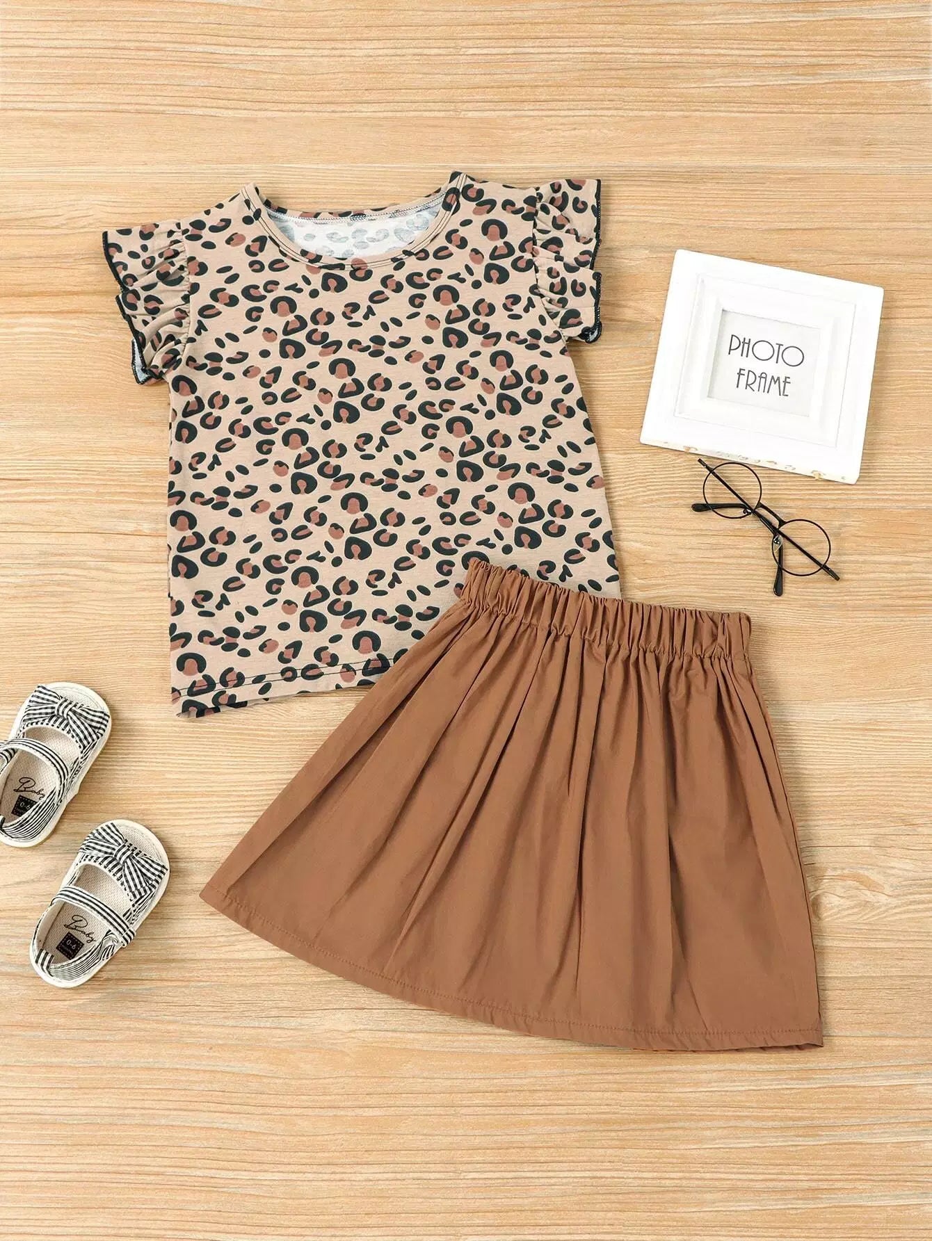 الأطفال - تيشيرت وتنورة بزخرفة الفهد للفتيات الصغيرات الصغار