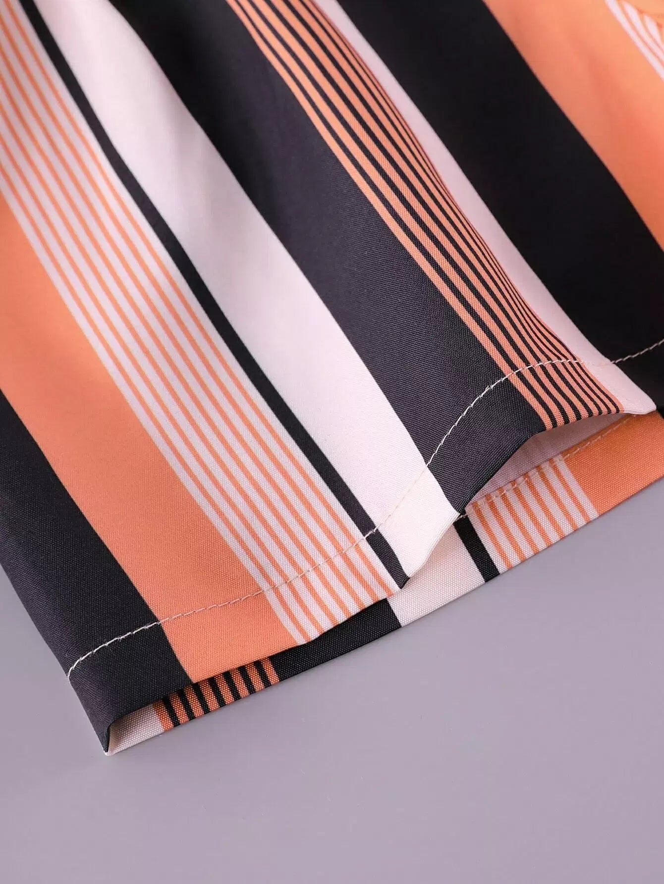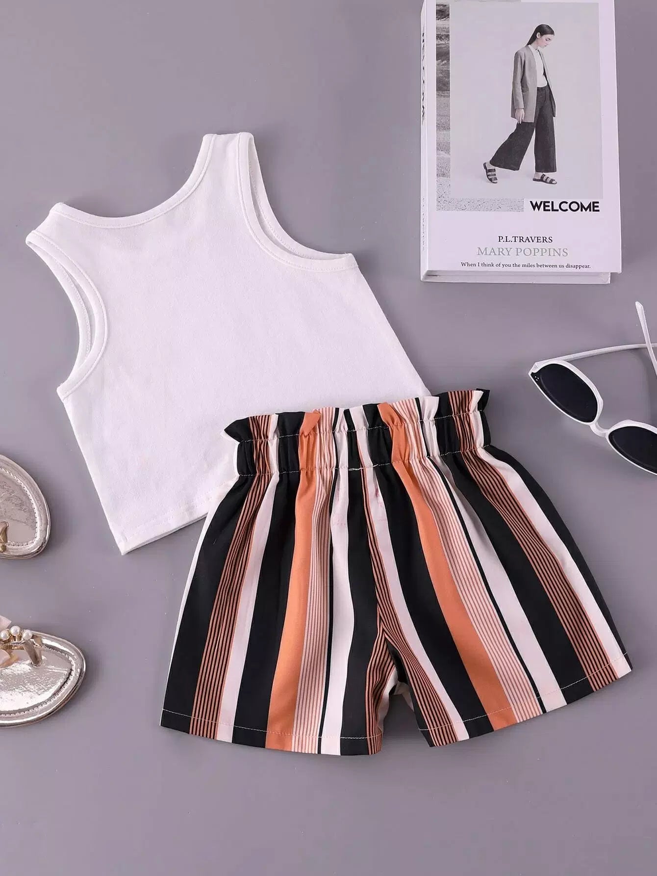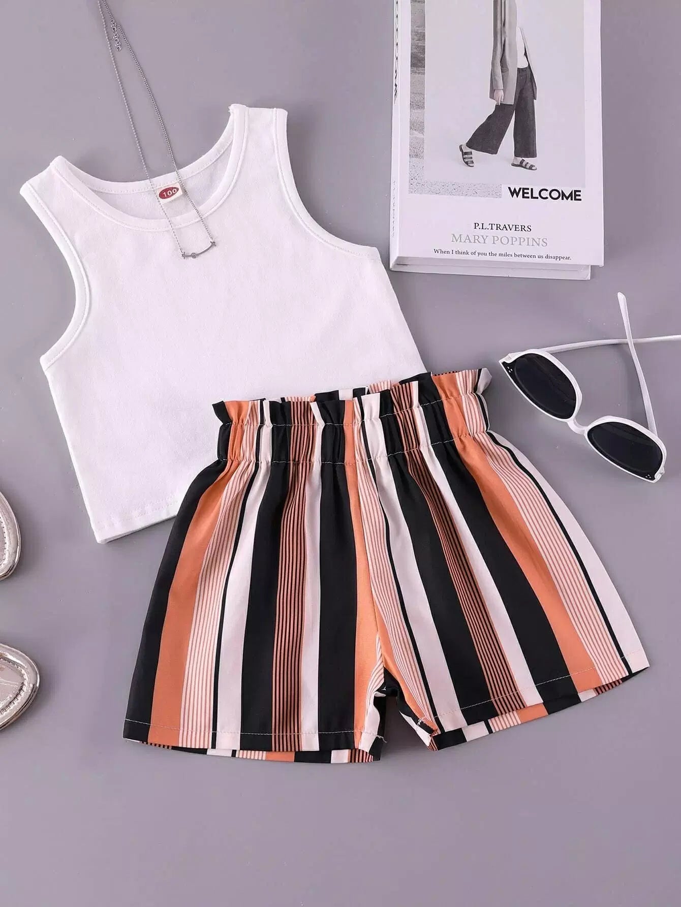 تي شيرت بدون أكمام سادة وبنات صغيرات وشورت مخطط بأكياس ورقية