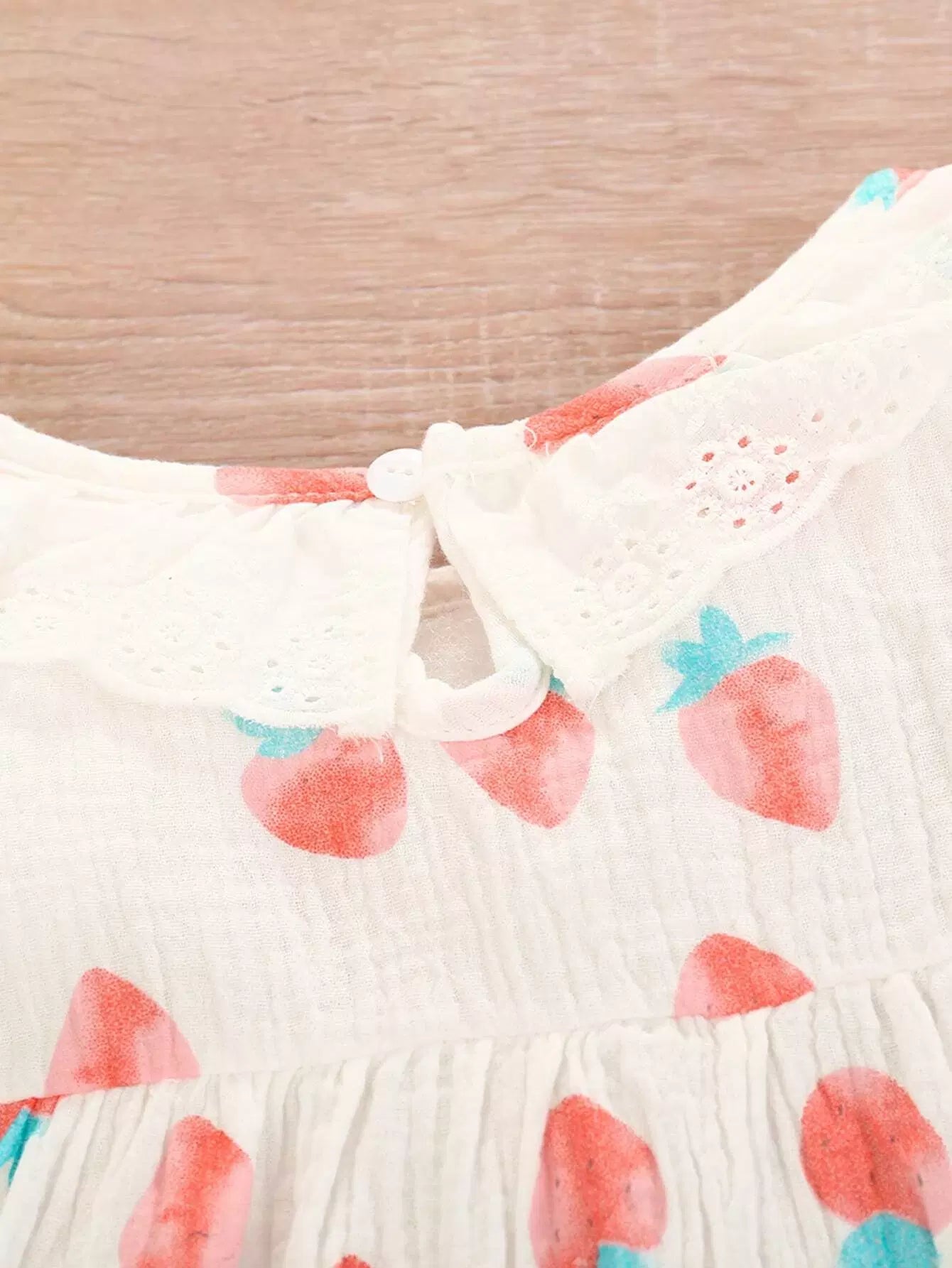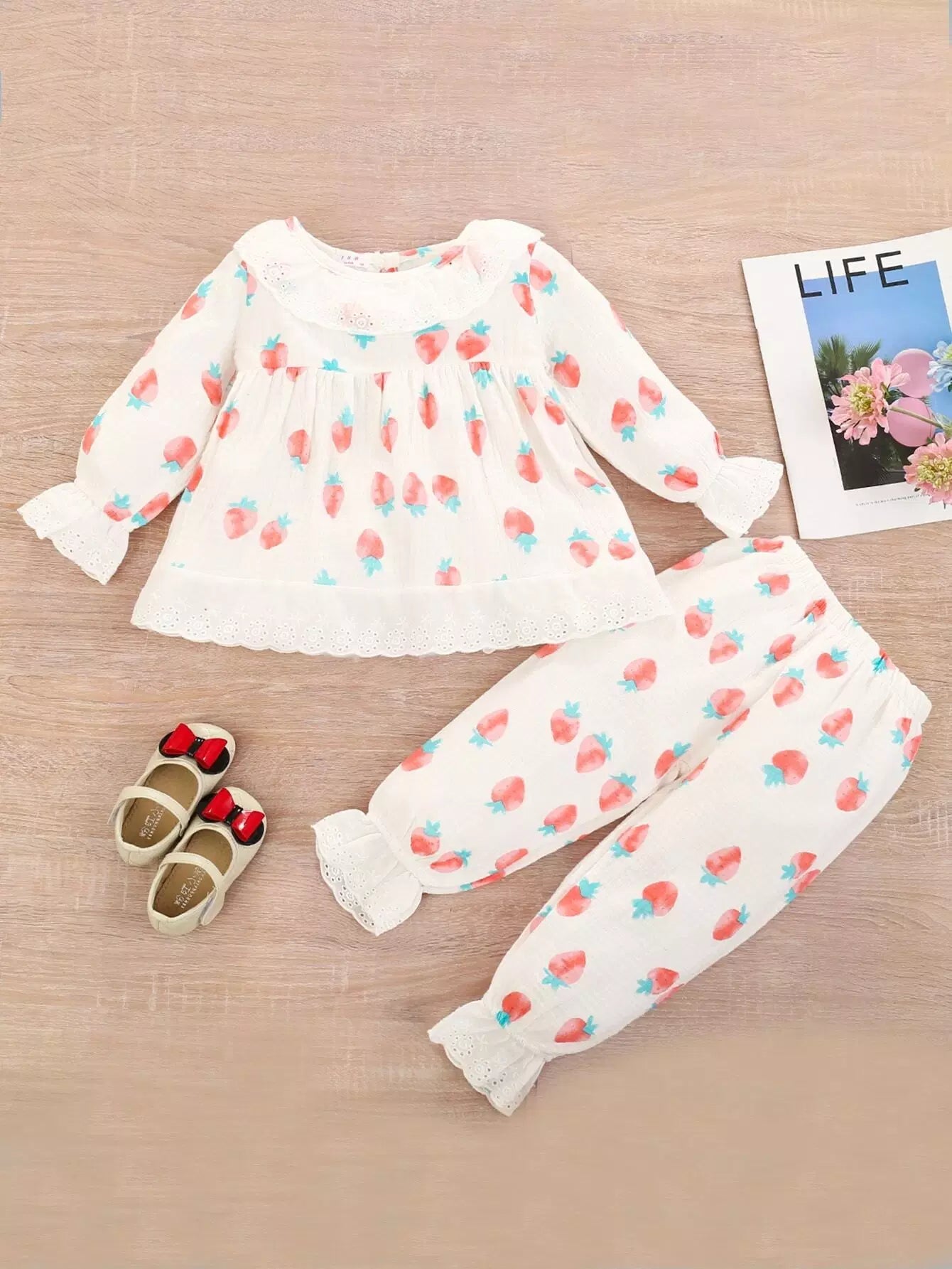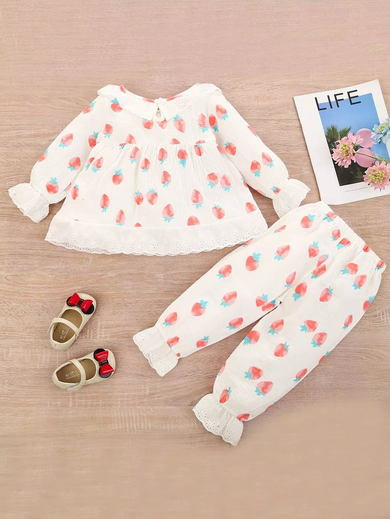بلوزة وبنطلون بنات صغيرات بطبعة فراولة مكشكشة وبنطلون