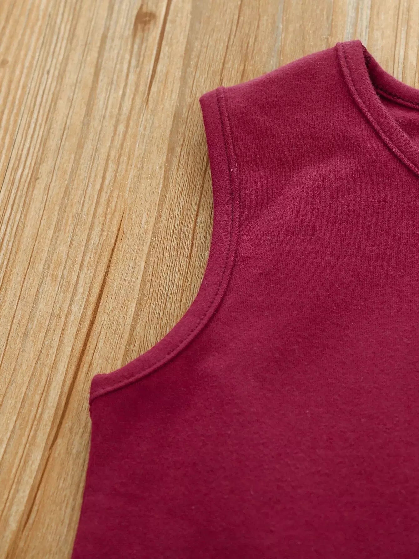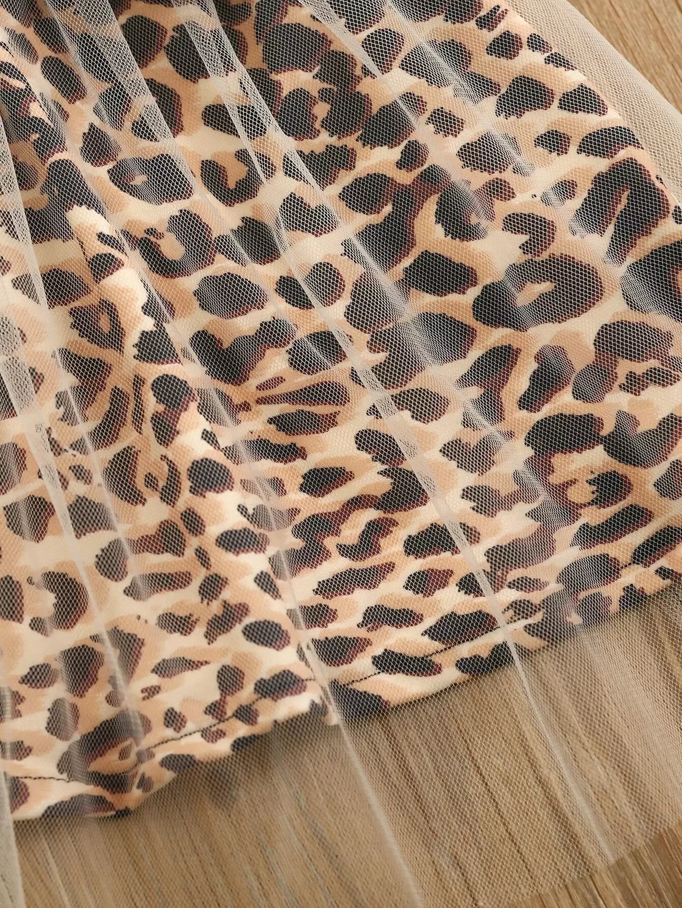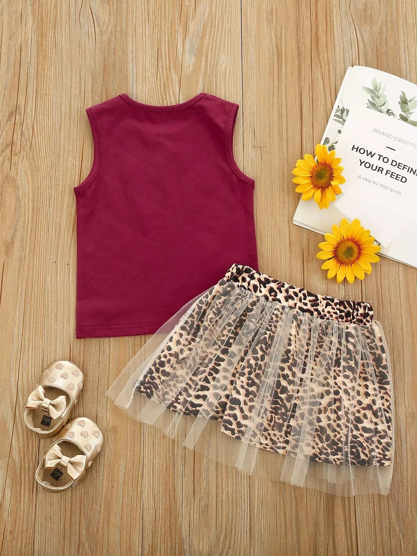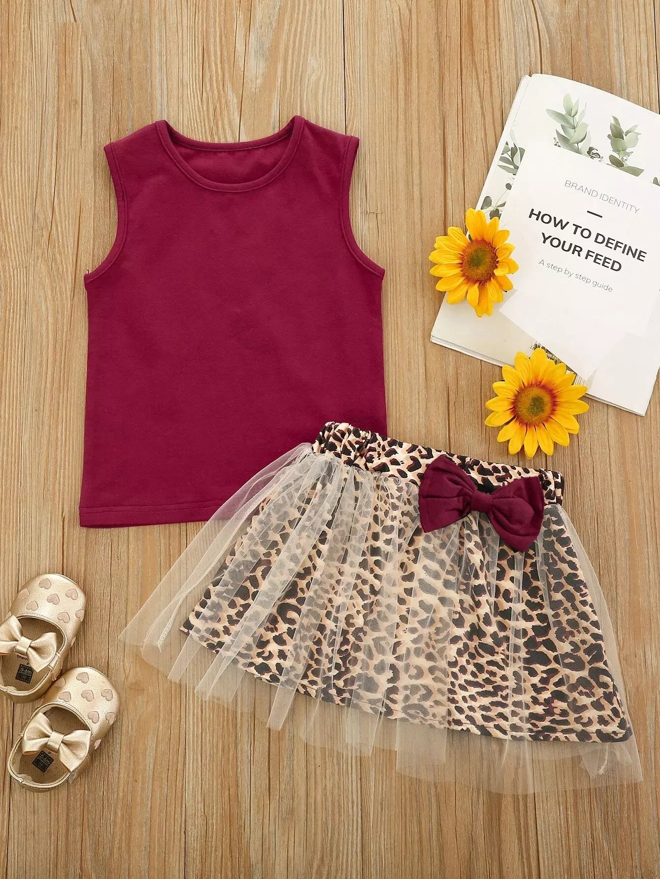 قميص بدون أكمام للبنات الصغيرات وتنورة شبكية مغطاة بعقدة النمر