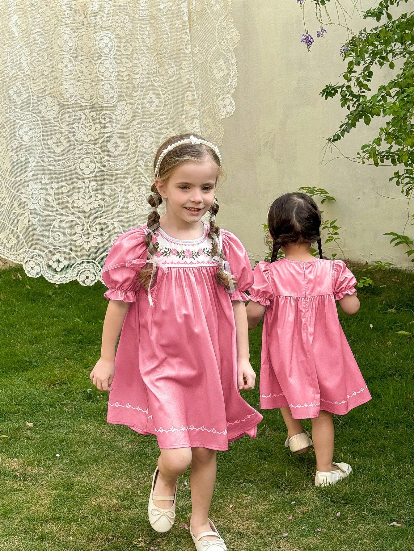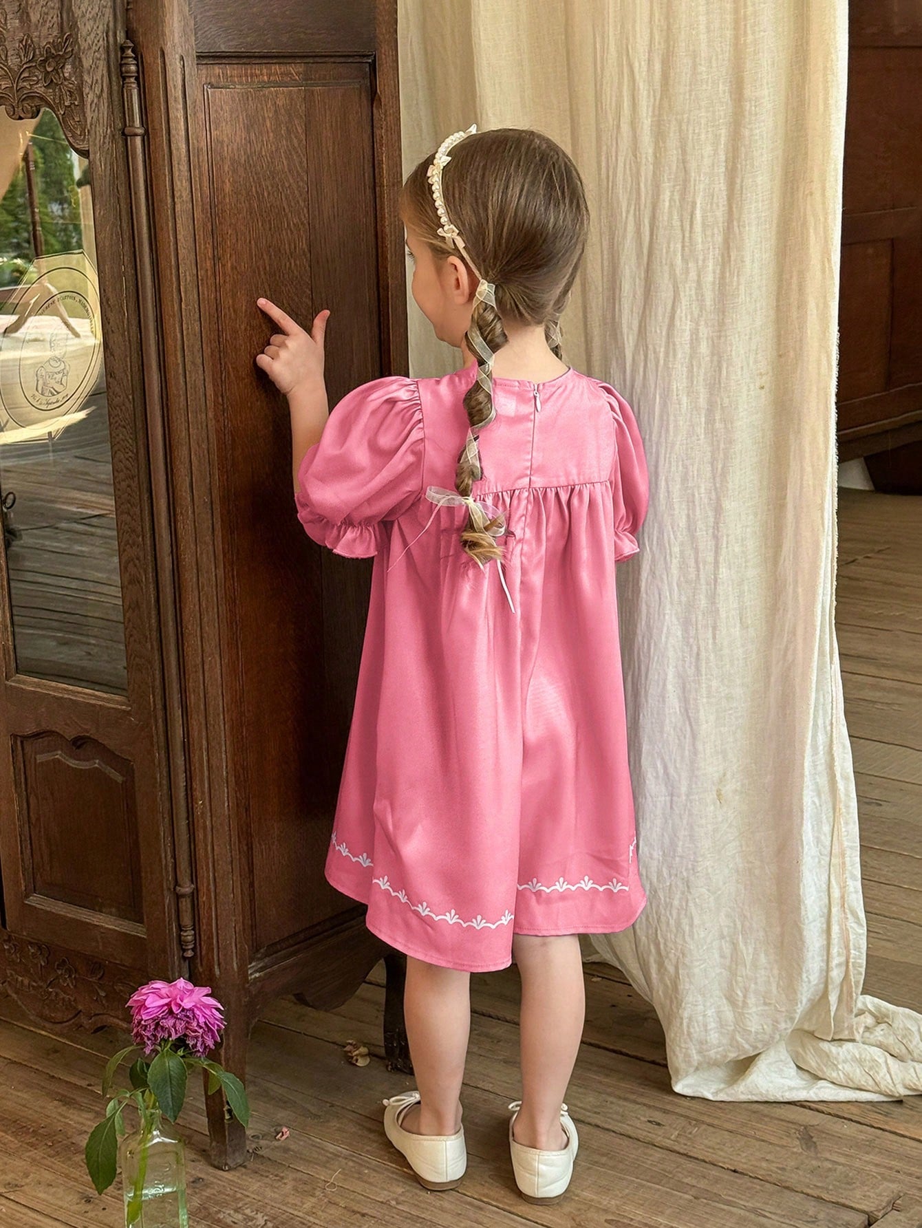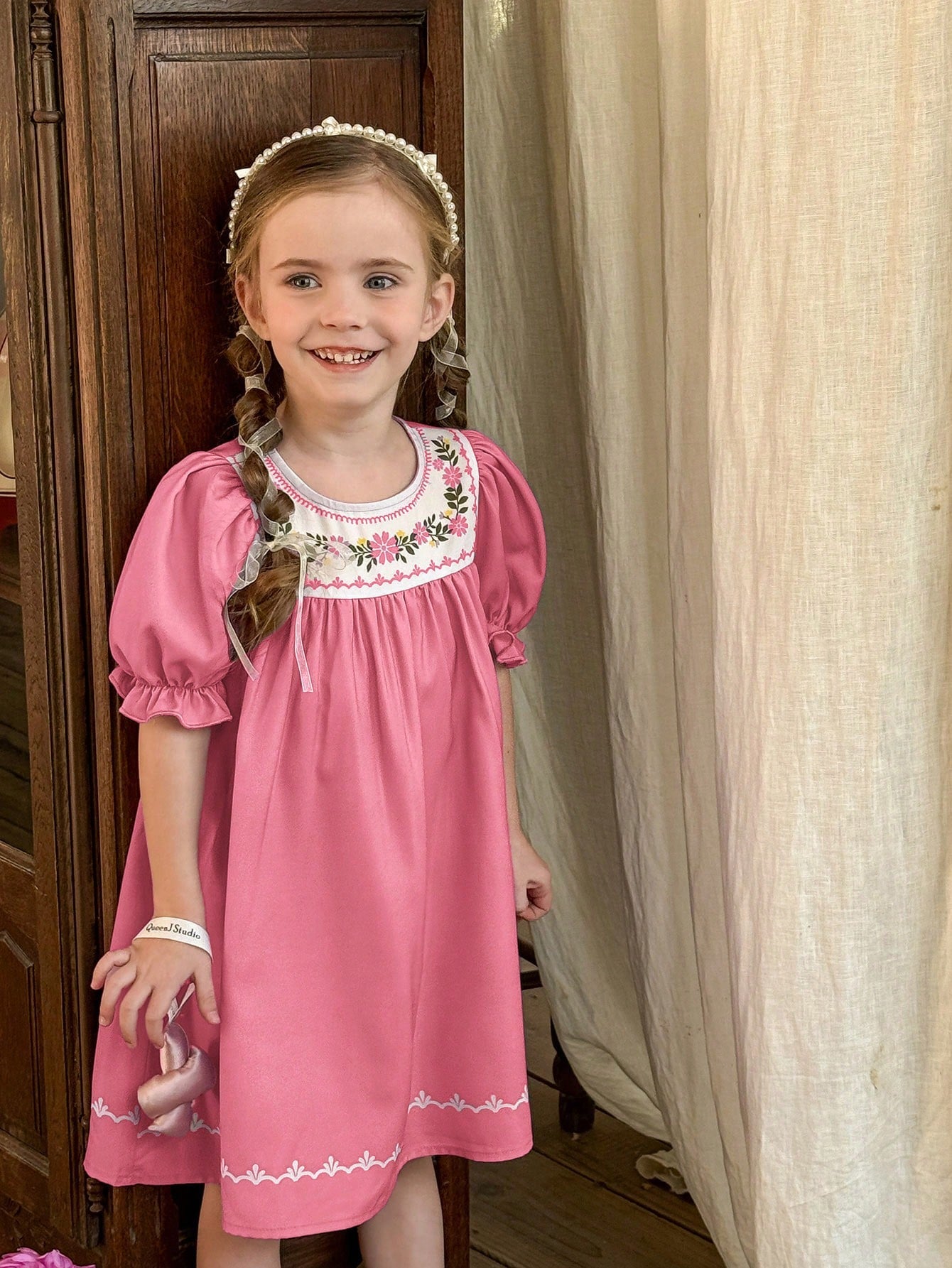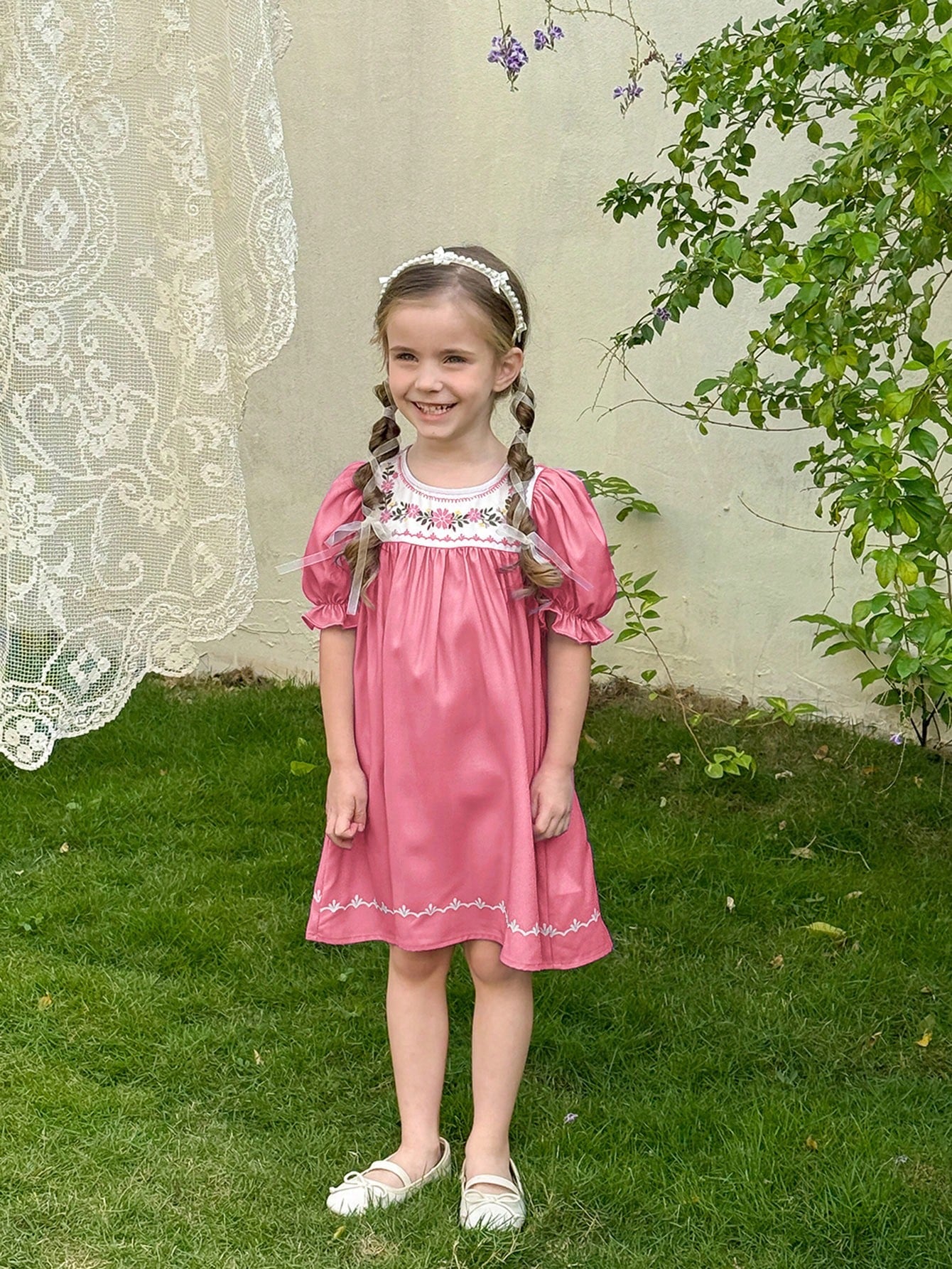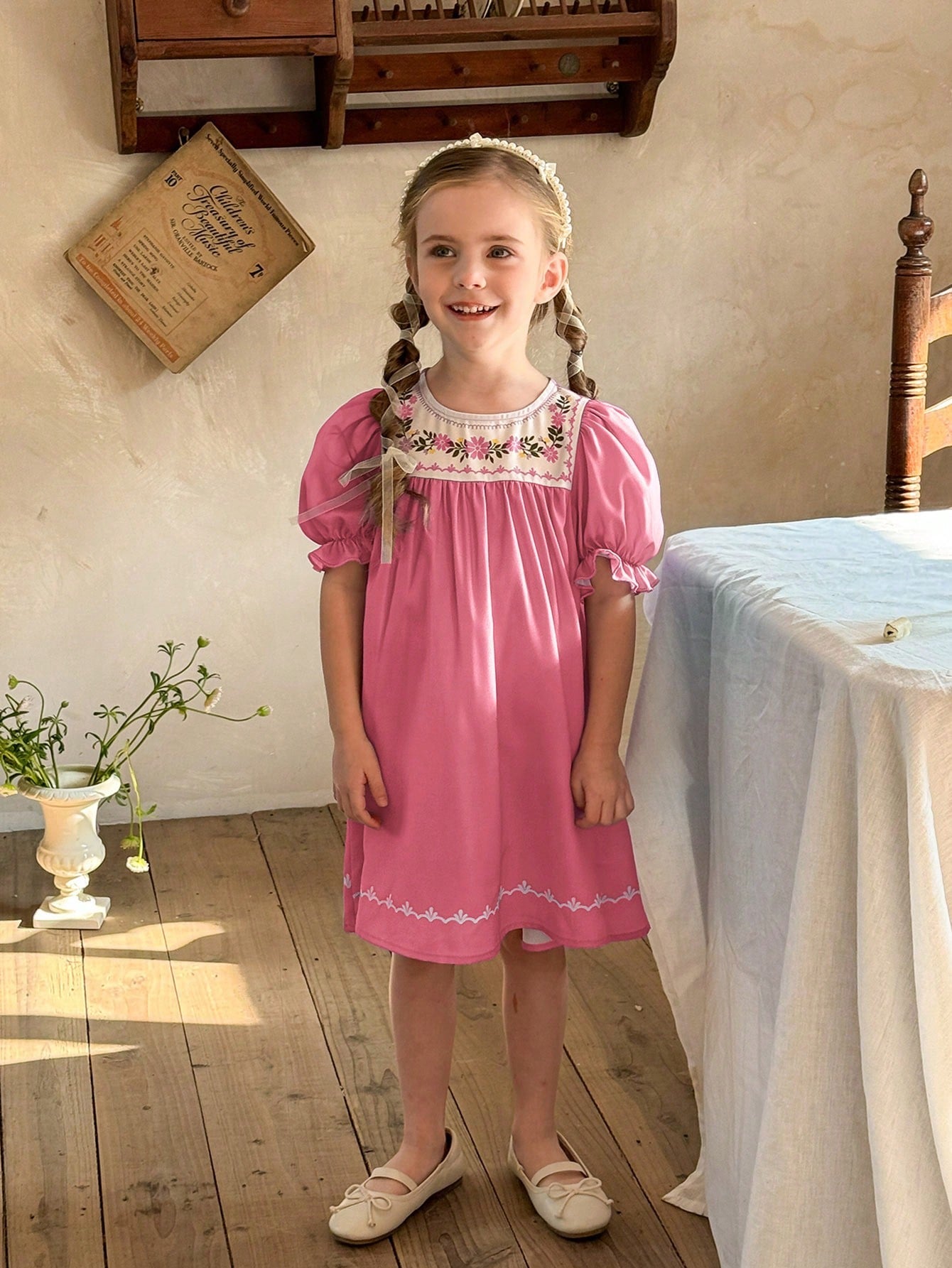 فستان كاجوال ملائم بأكمام منتفخة ورقبة دائرية مزخرفة بنقشة زهور من LMoss Kids للفتيات الصغيرات