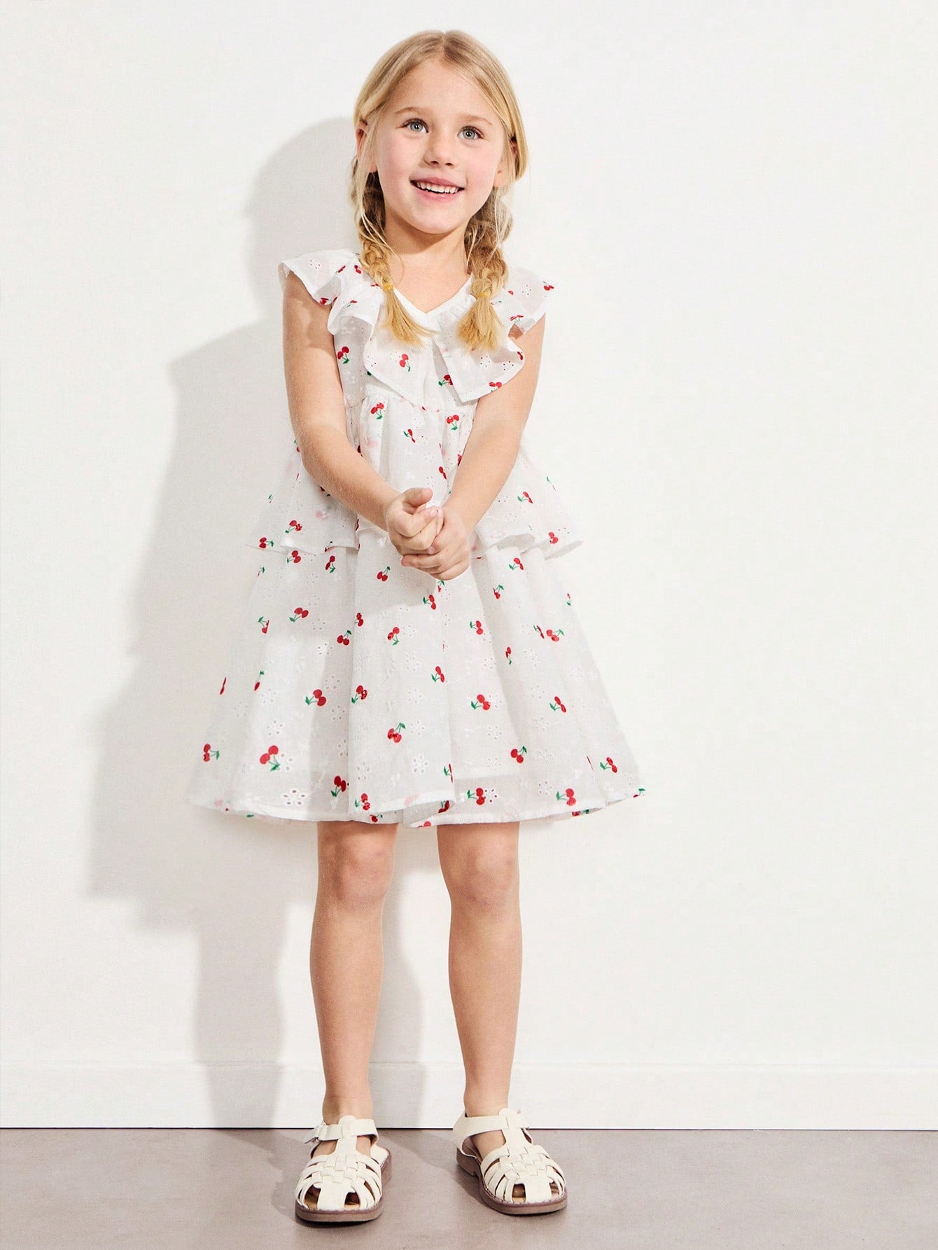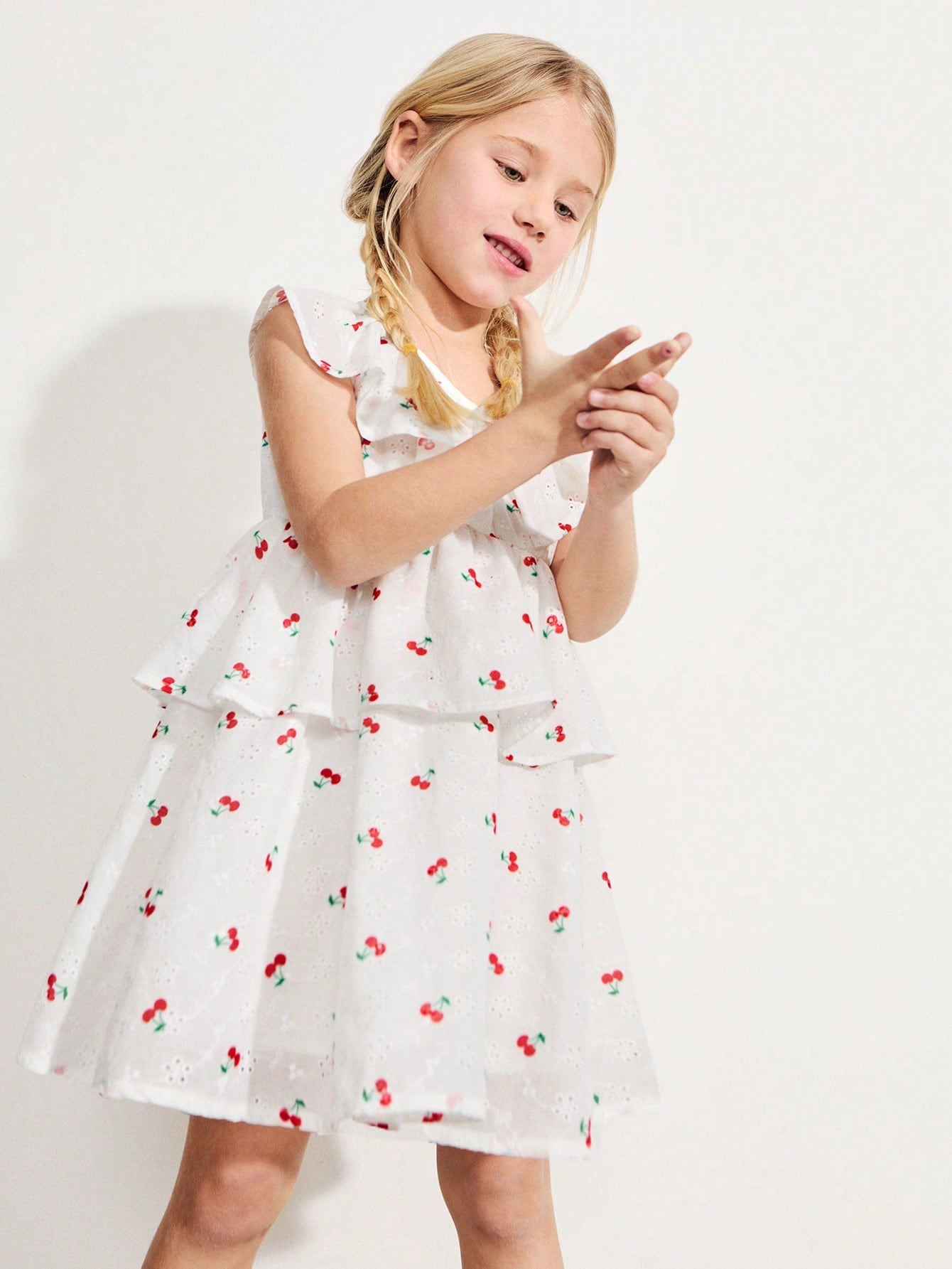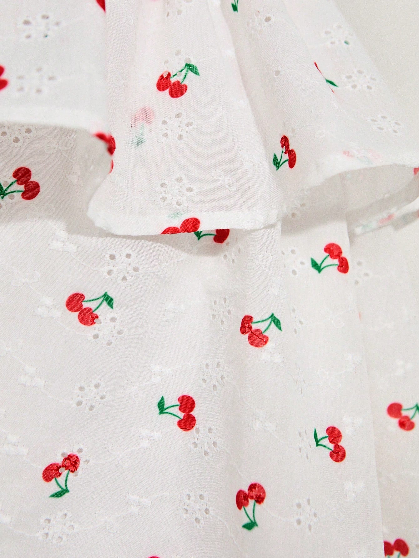 فستان أبيض للفتيات الصغيرات بنقشة الكرز وحاشية مكشكشة من طبقتين من THE HAPPY LOOK