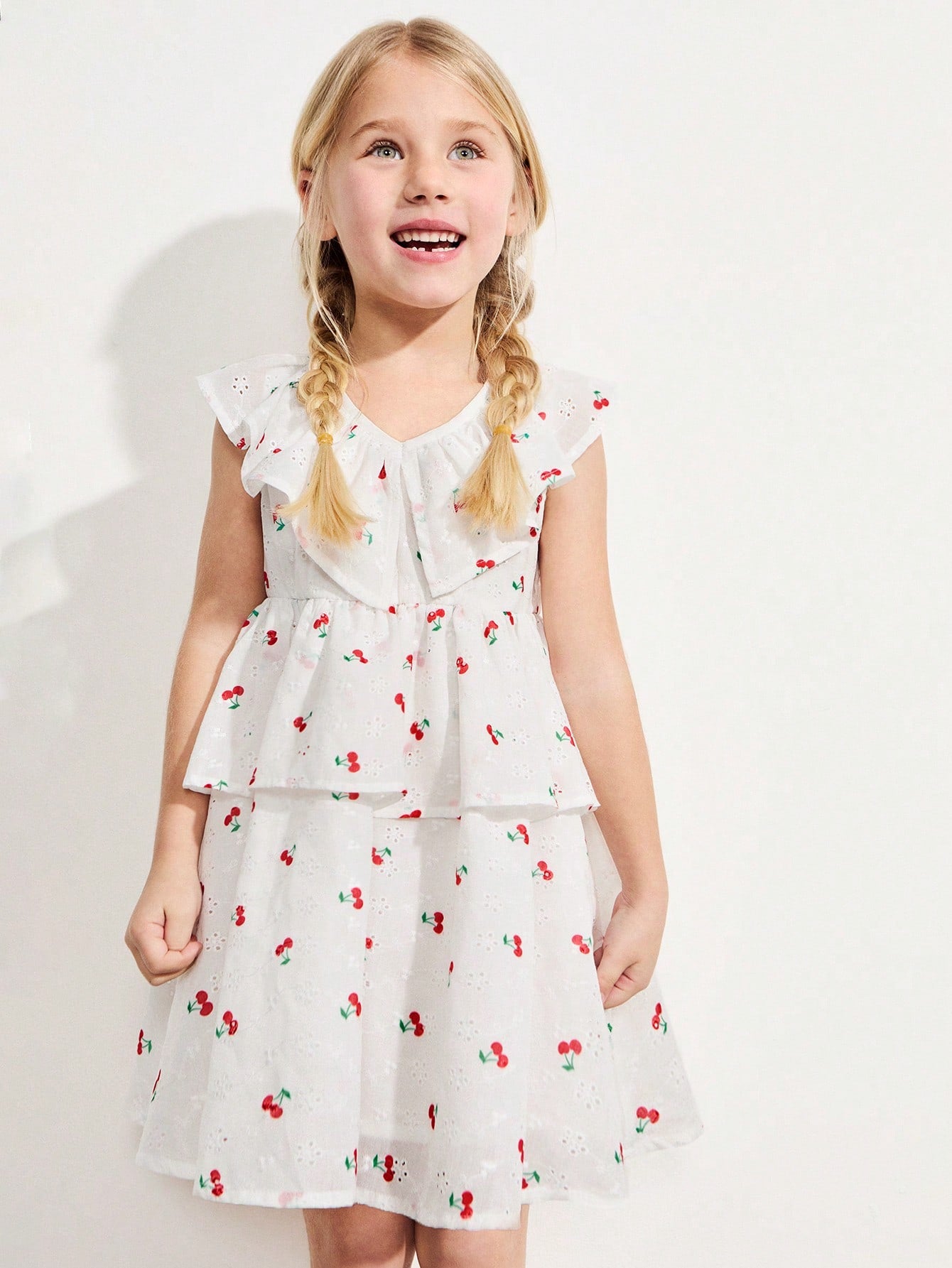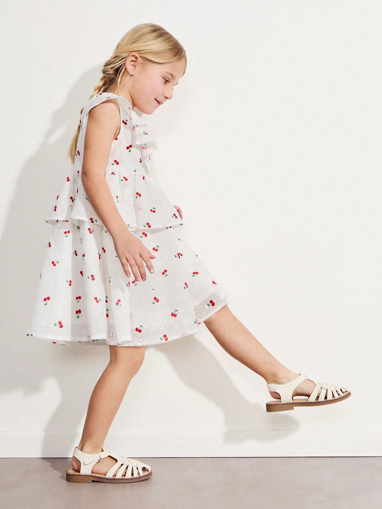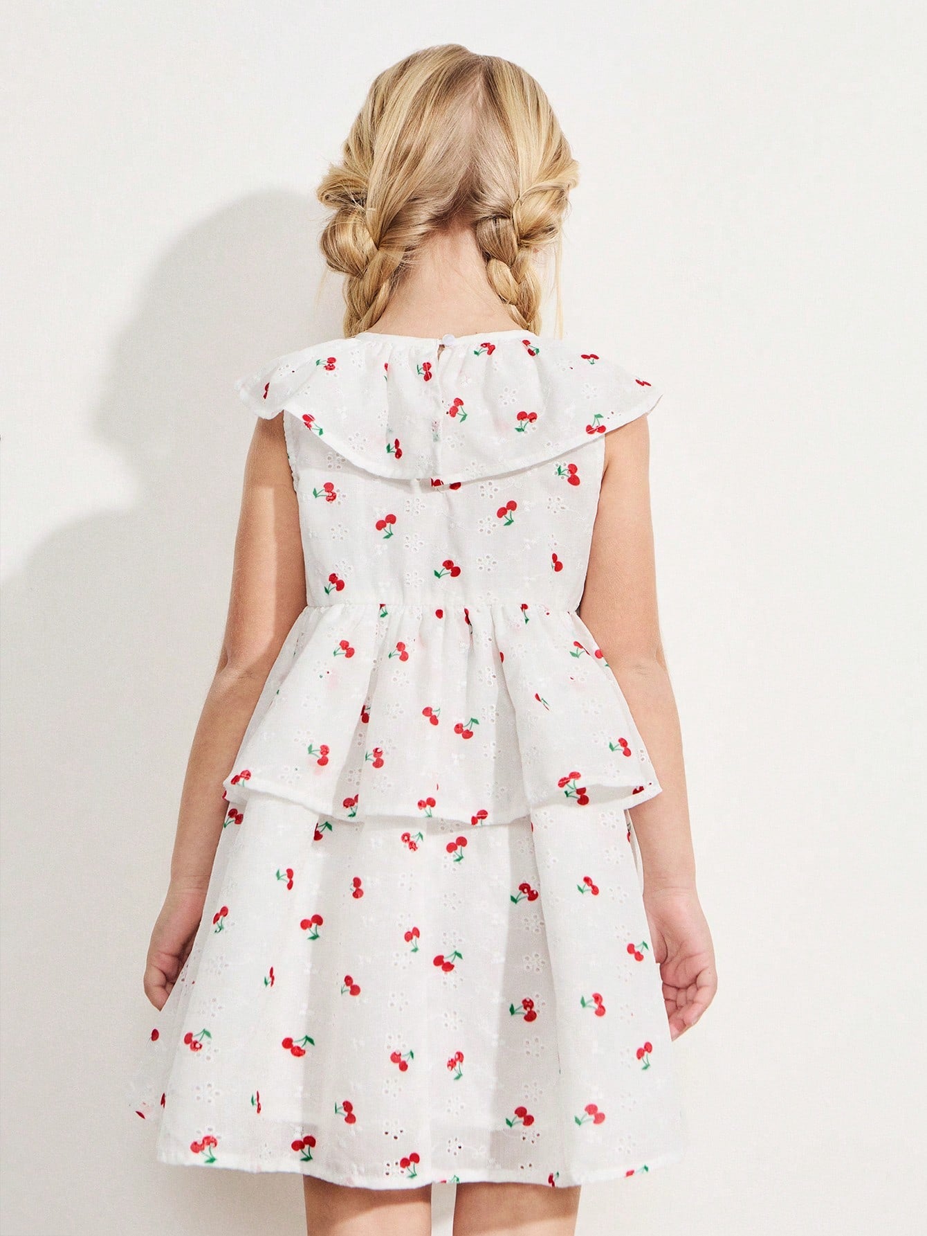 فستان أبيض للفتيات الصغيرات بنقشة الكرز وحاشية مكشكشة من طبقتين من THE HAPPY LOOK