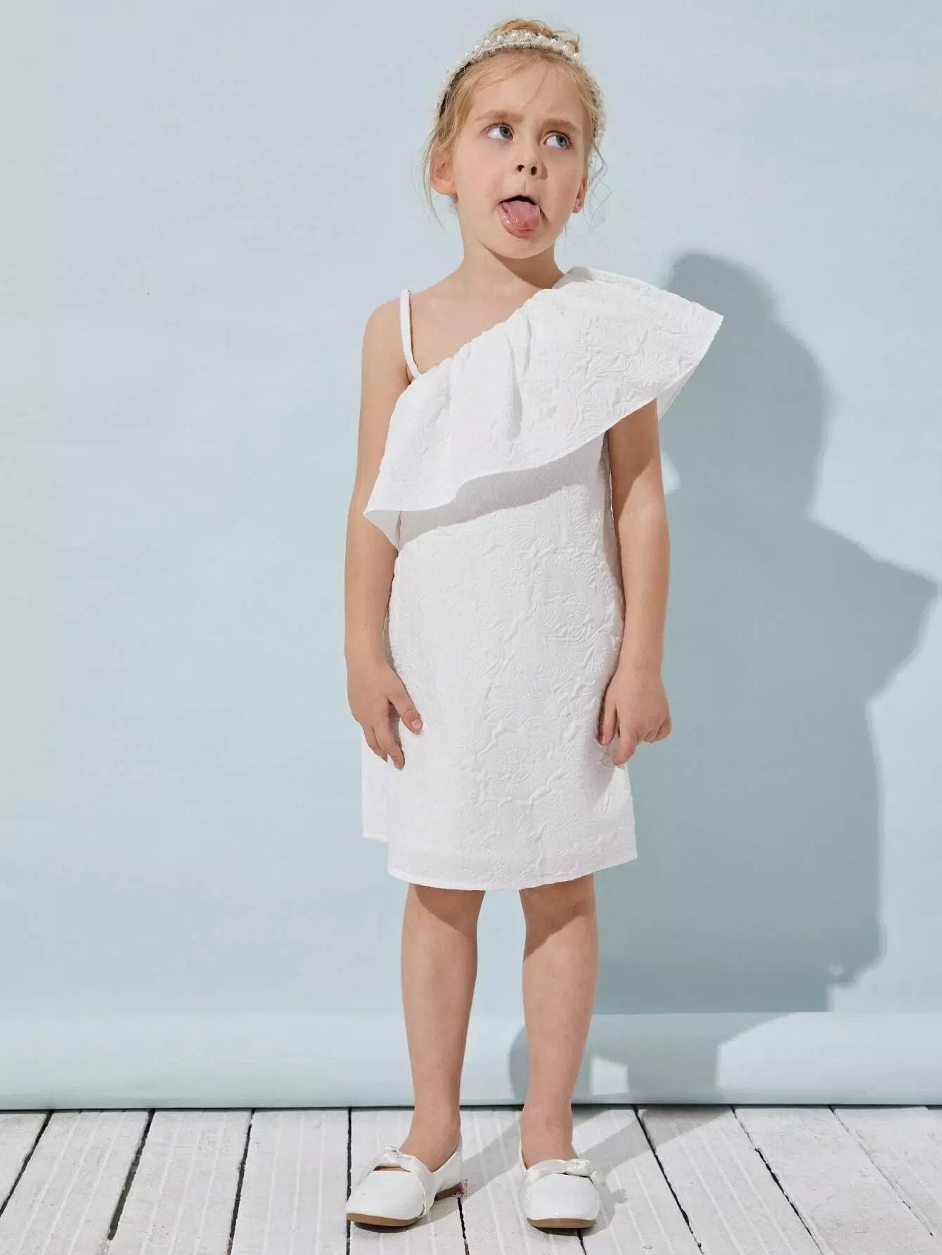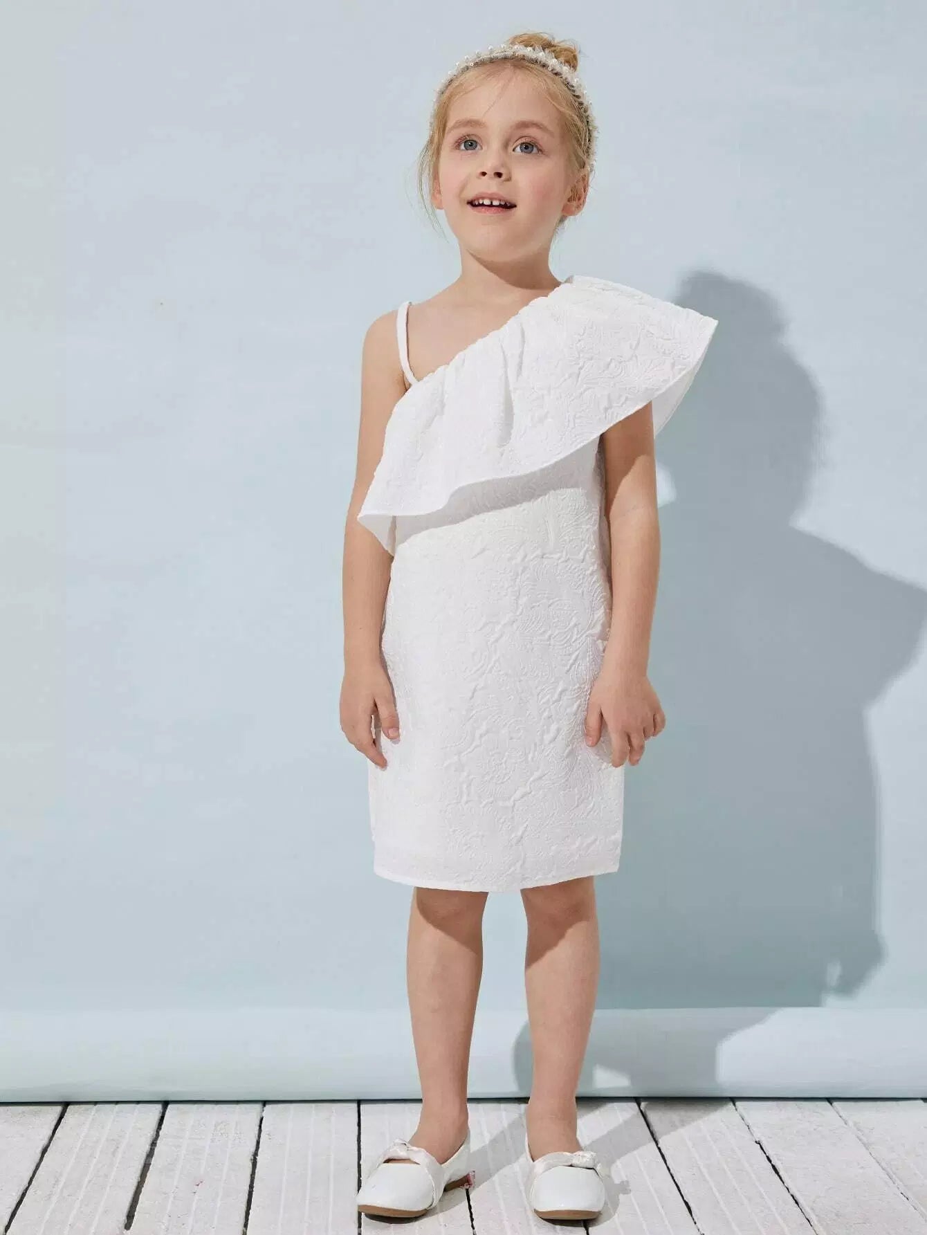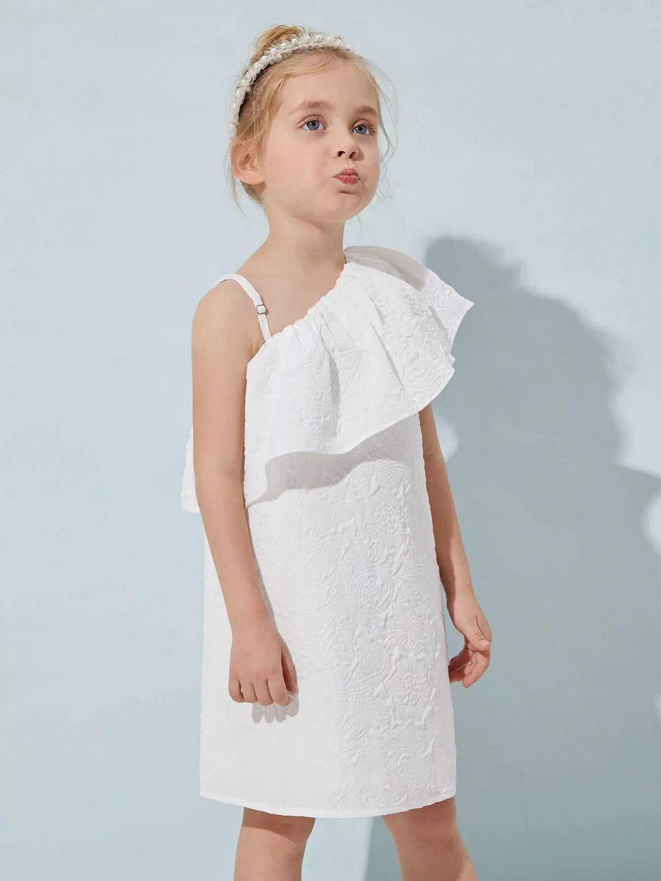 فستان جاكار بتفاصيل كشكشة ورقبة غير متماثلة للفتيات الصغيرات