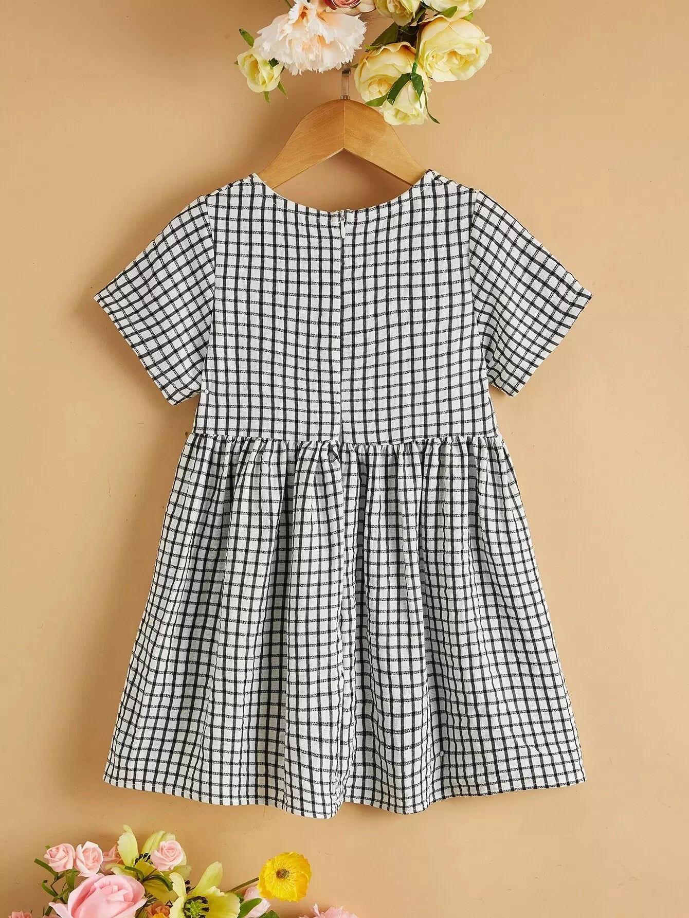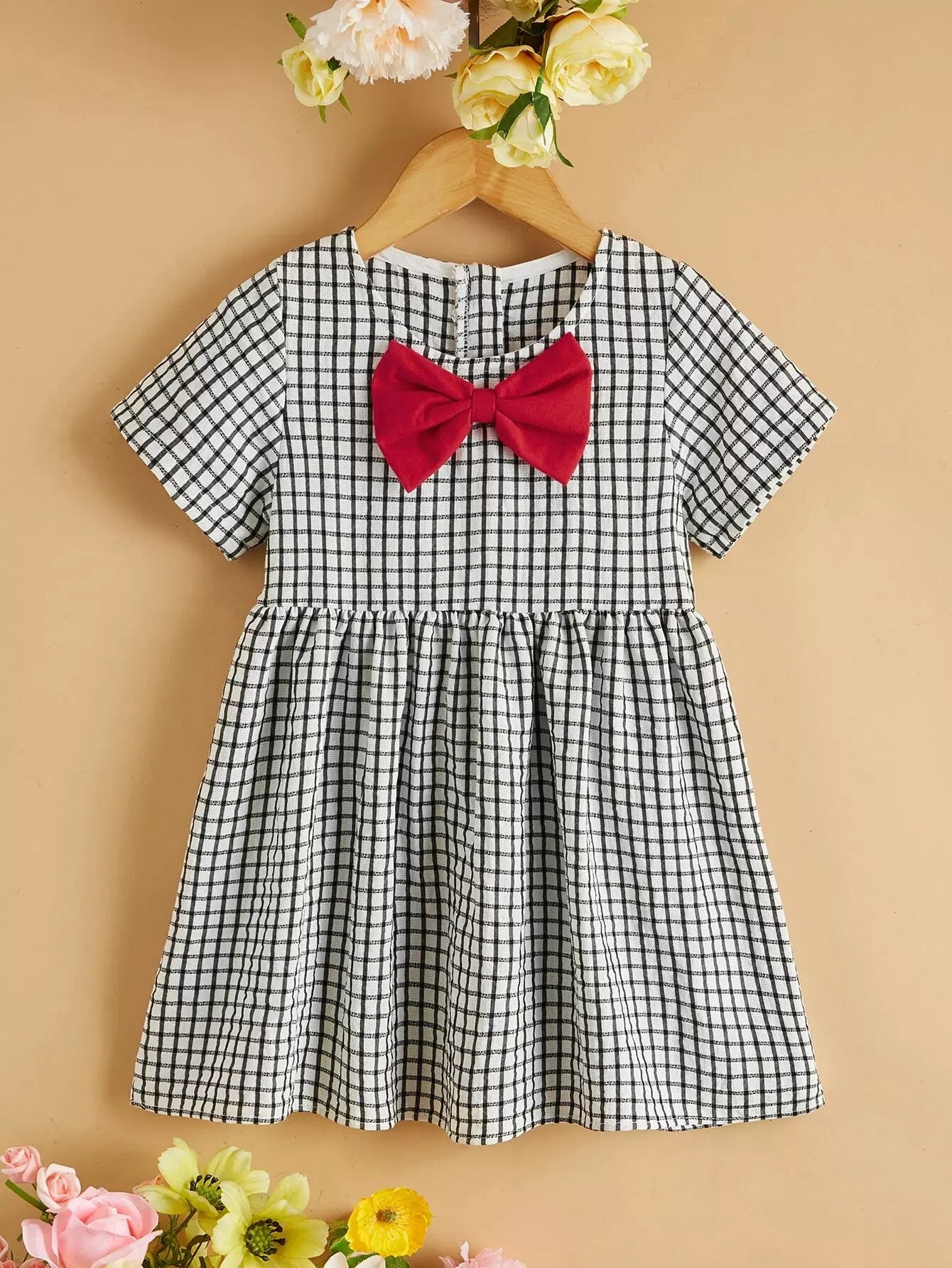 الأطفال - فستان سموك منقوش بفيونكة أمامية للفتيات الصغيرات