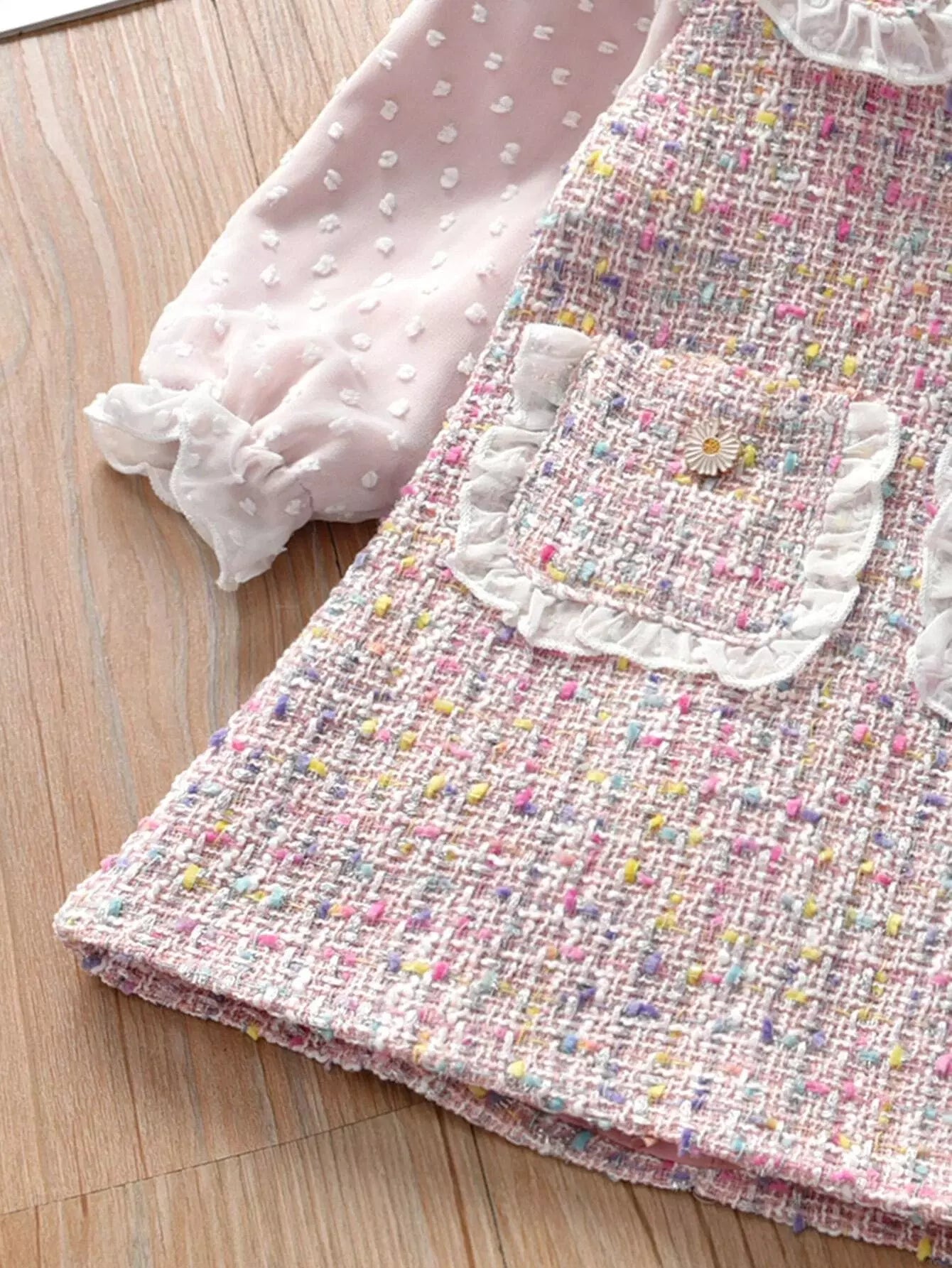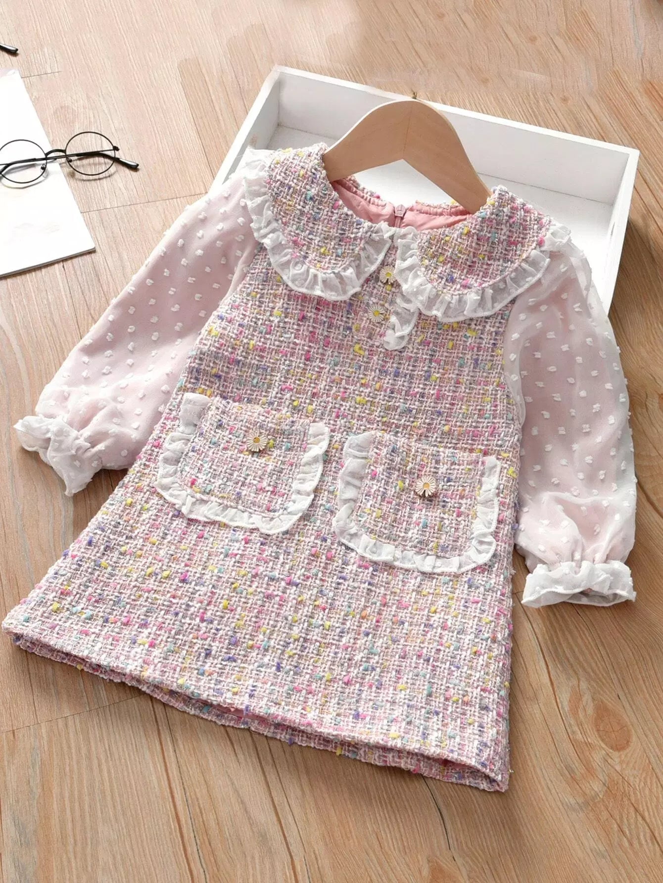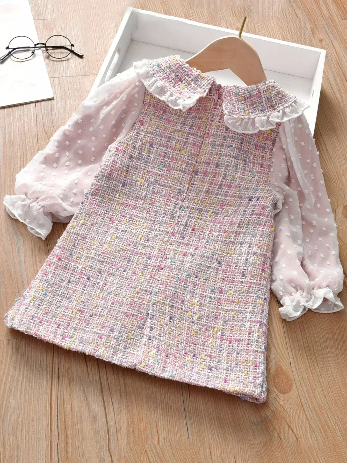فستان تونيك بأكمام من التويد المنقّط السويسري للبنات الصغار