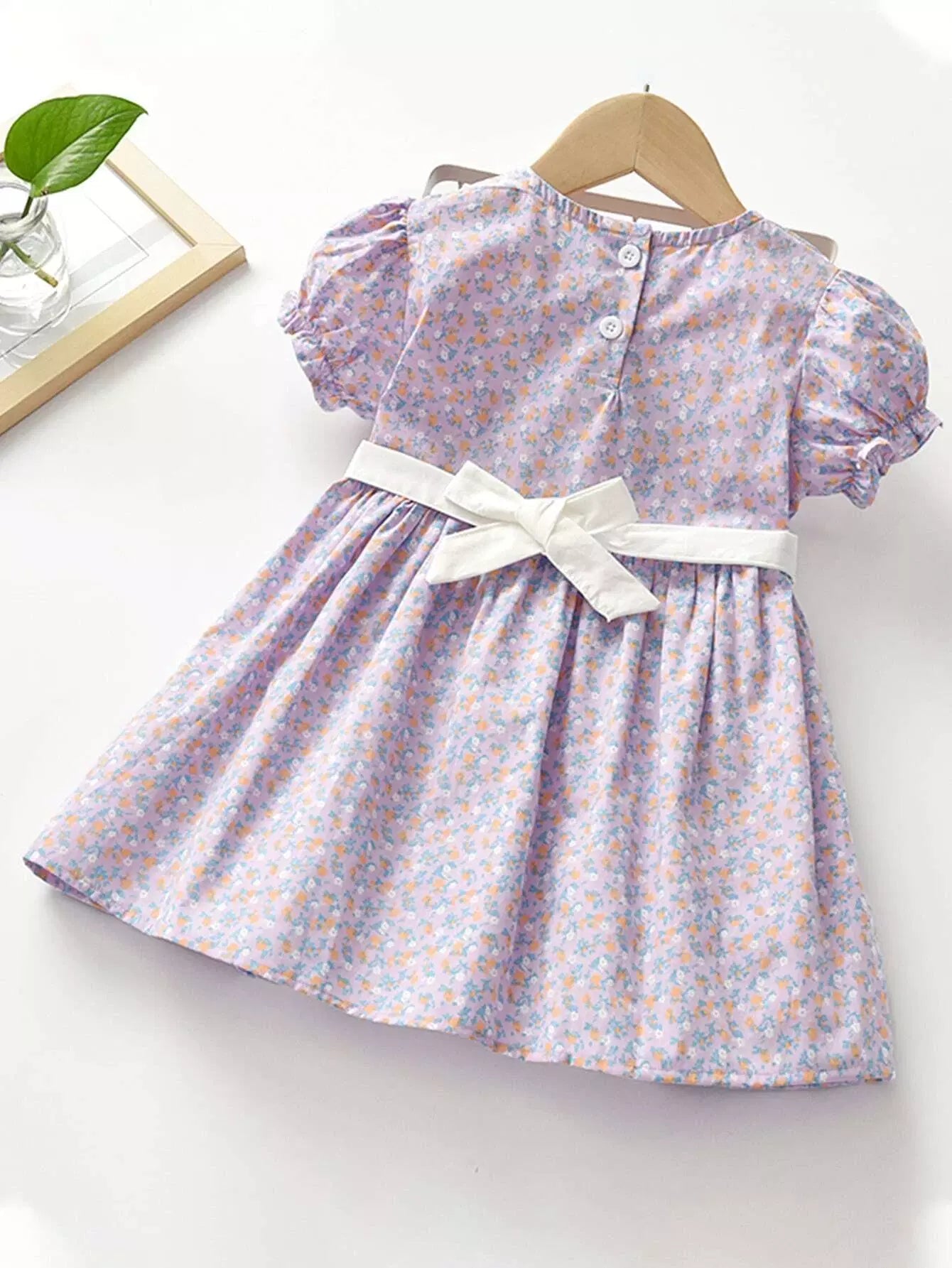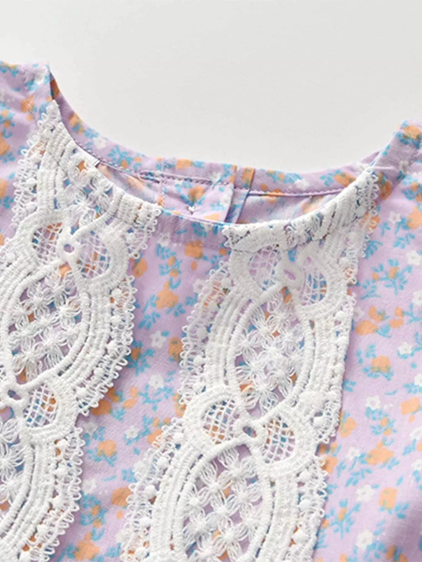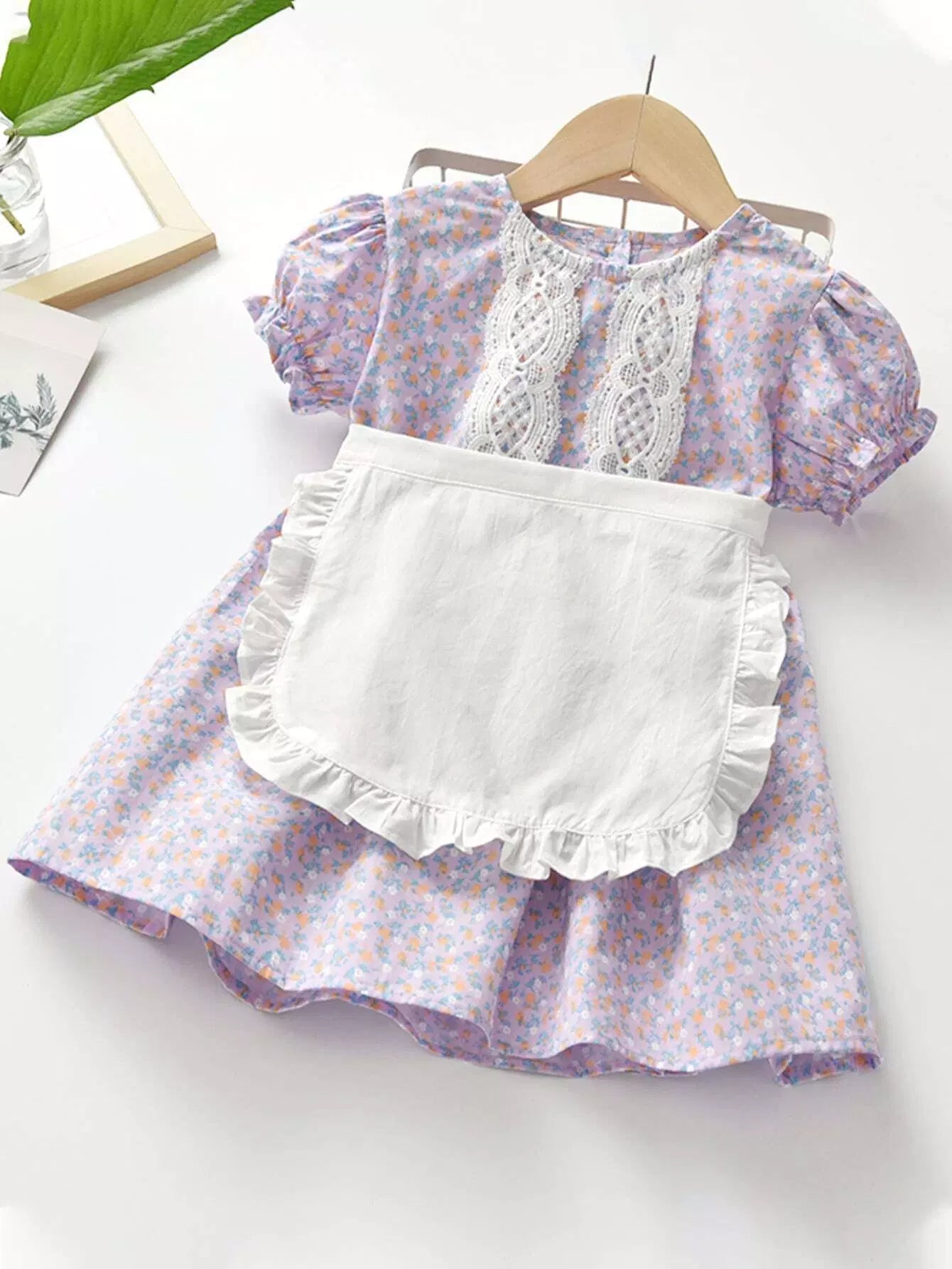 فستان بناتي صغيرات مزين بنقوش الزهور المخرمة من الدانتيل مع مريلة