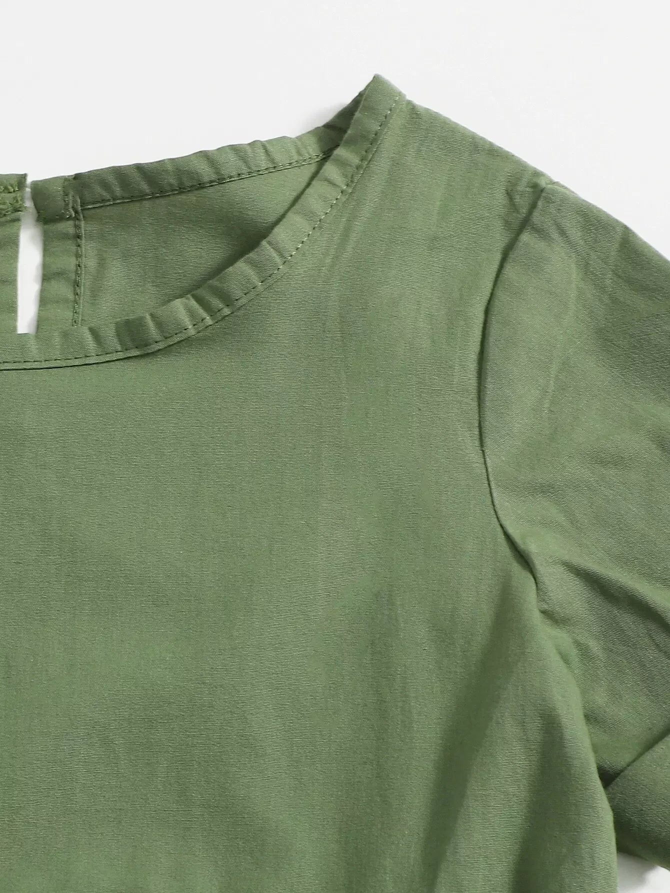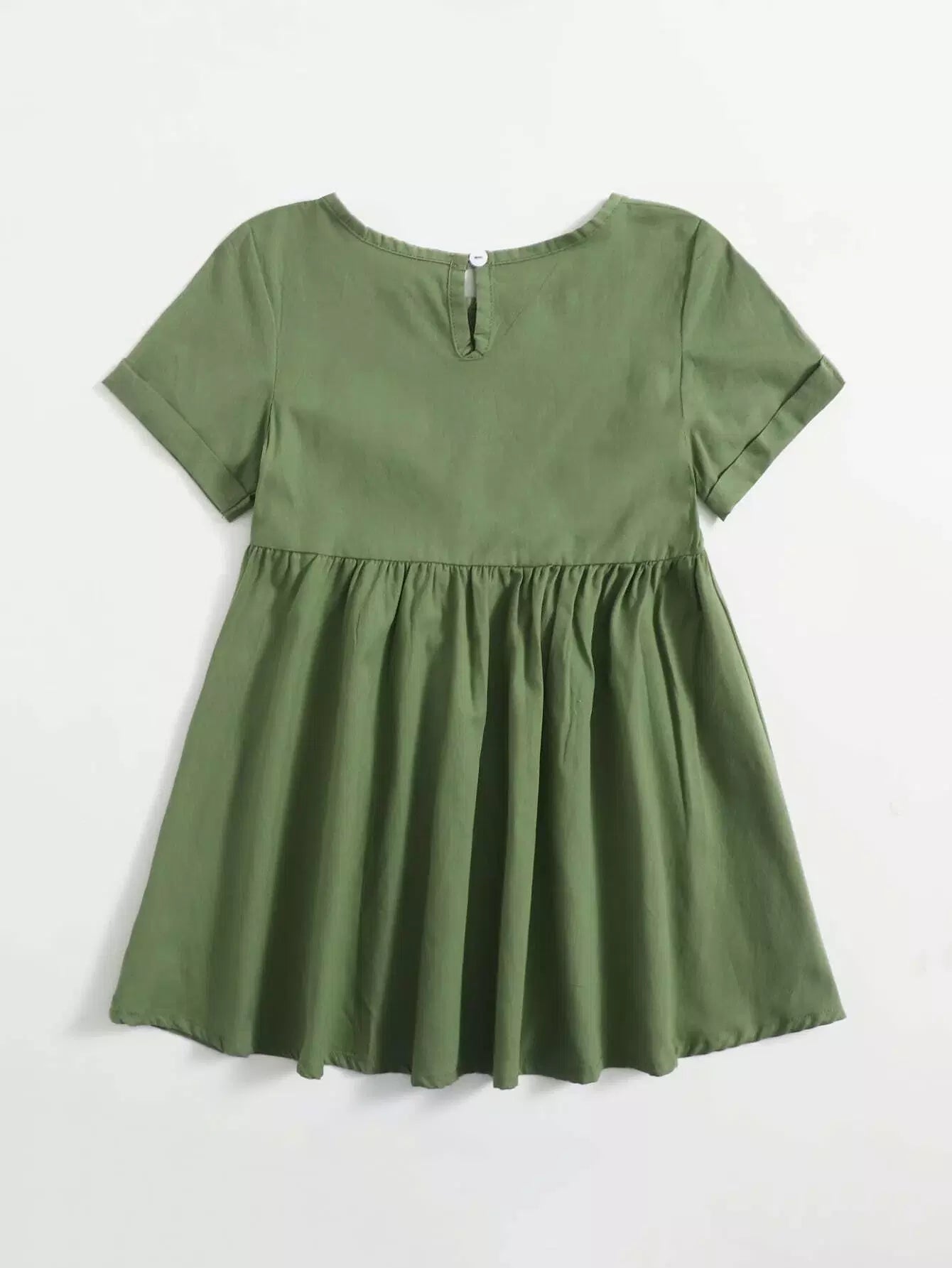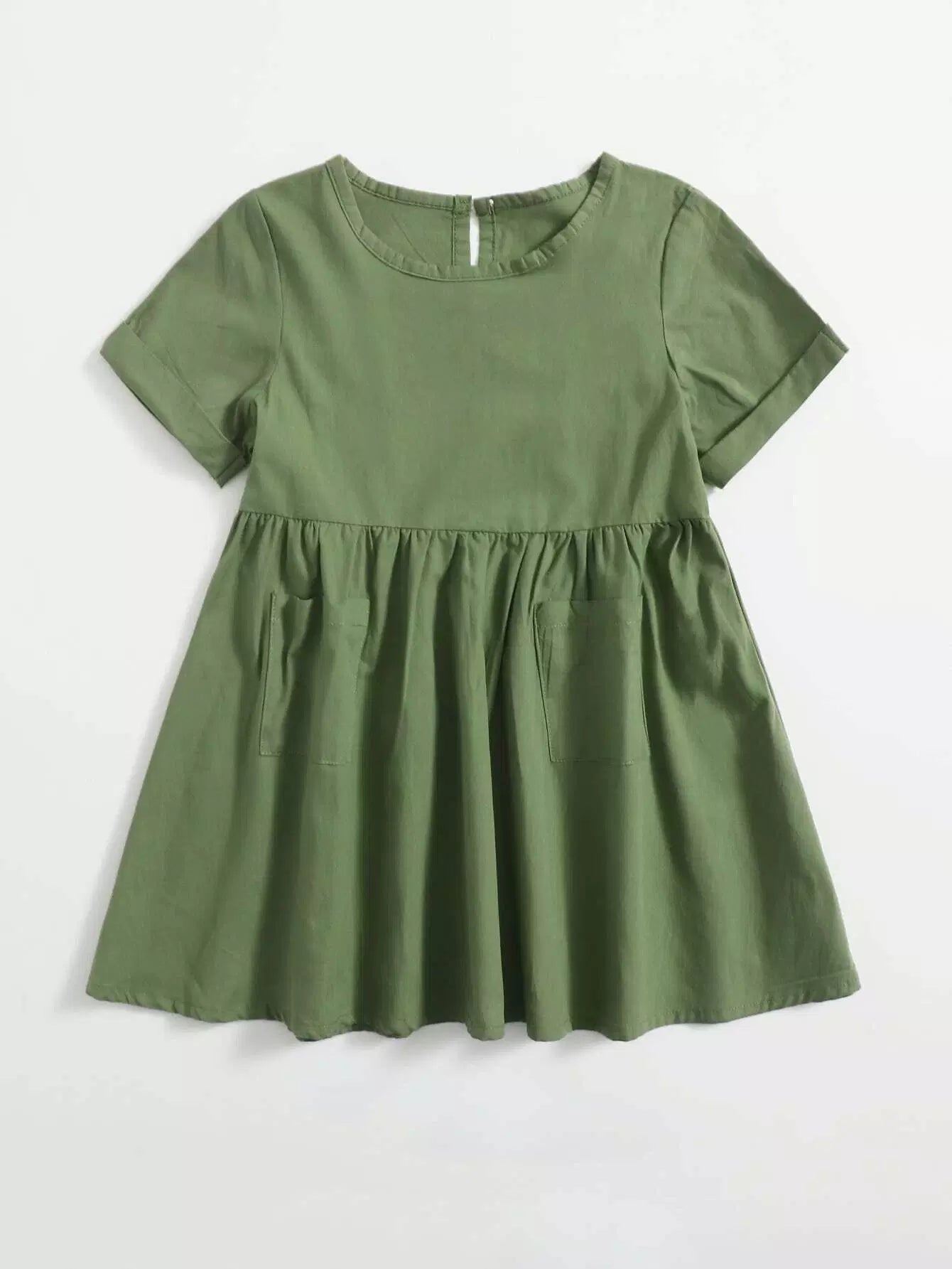 فستان بنات صغيرات بجيوب مزدوجة بأكمام ملفوفة بأكمام ملفوفة فستان أطفال