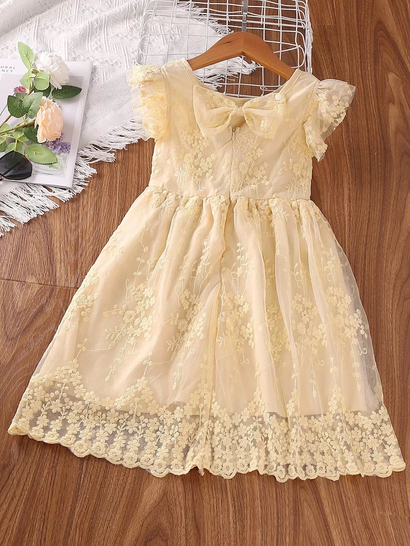 الأطفال - فستان على شكل حرف A مطرز بفيونكة من الخلف للفتيات الصغيرات