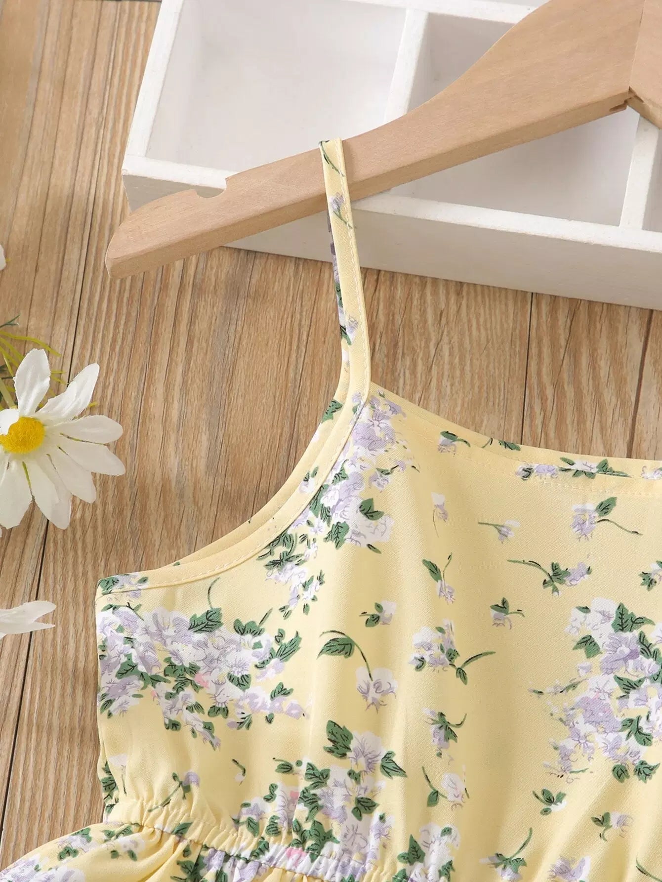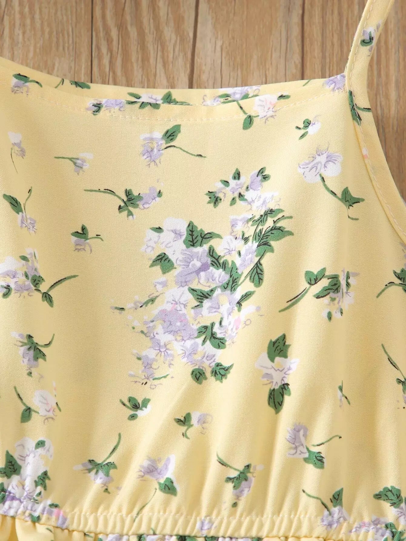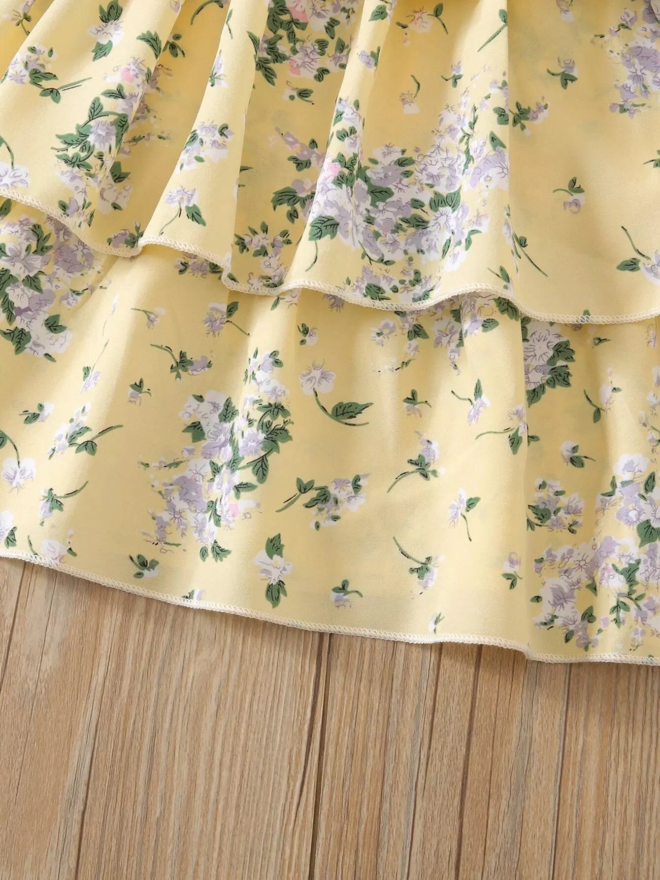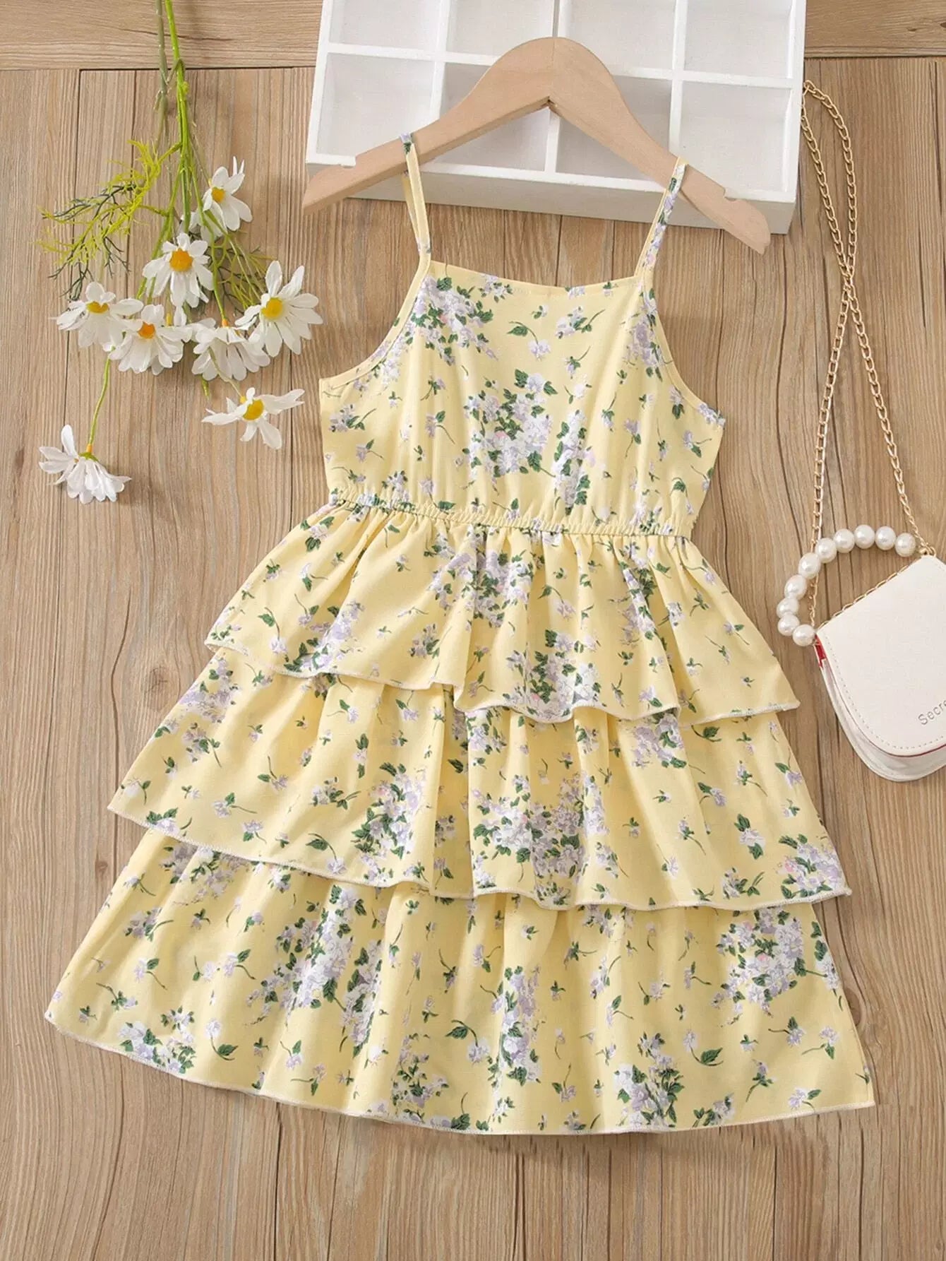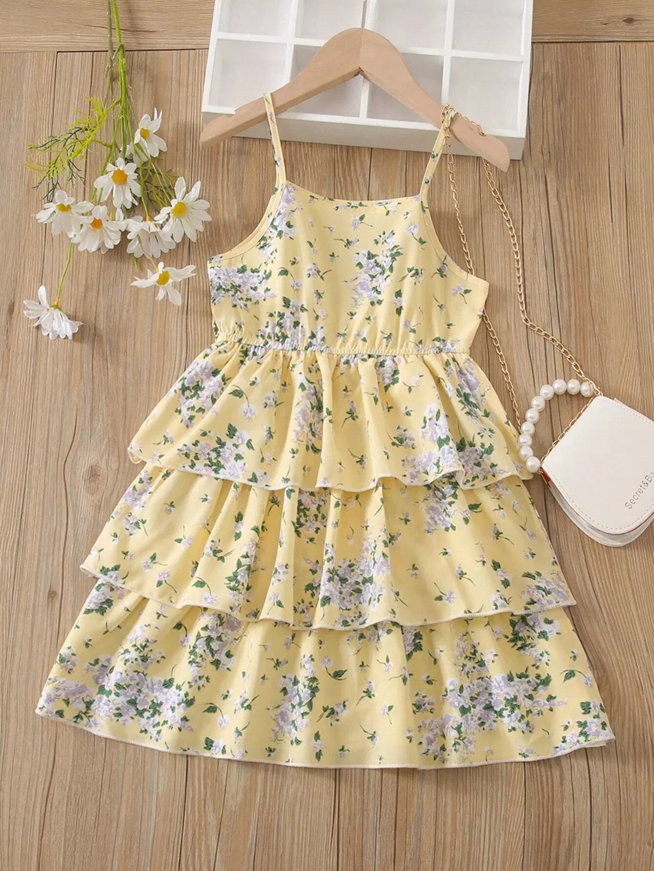 فستان بناتي صغير بطبعة زهور بطباعة زهور بطبقات فستان كامي بحواف متعددة الطبقات