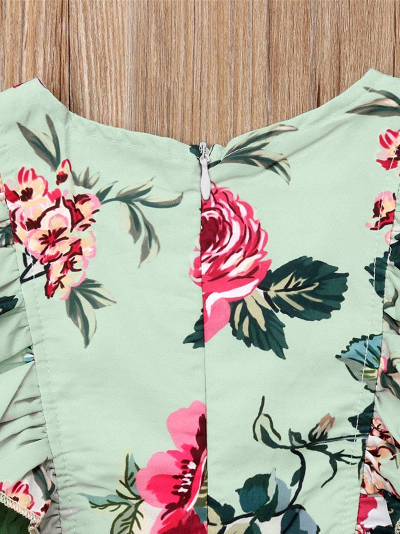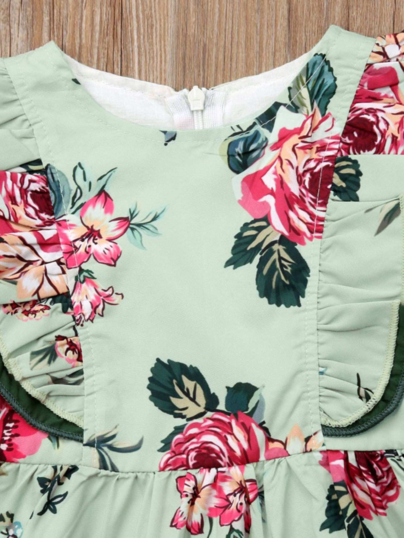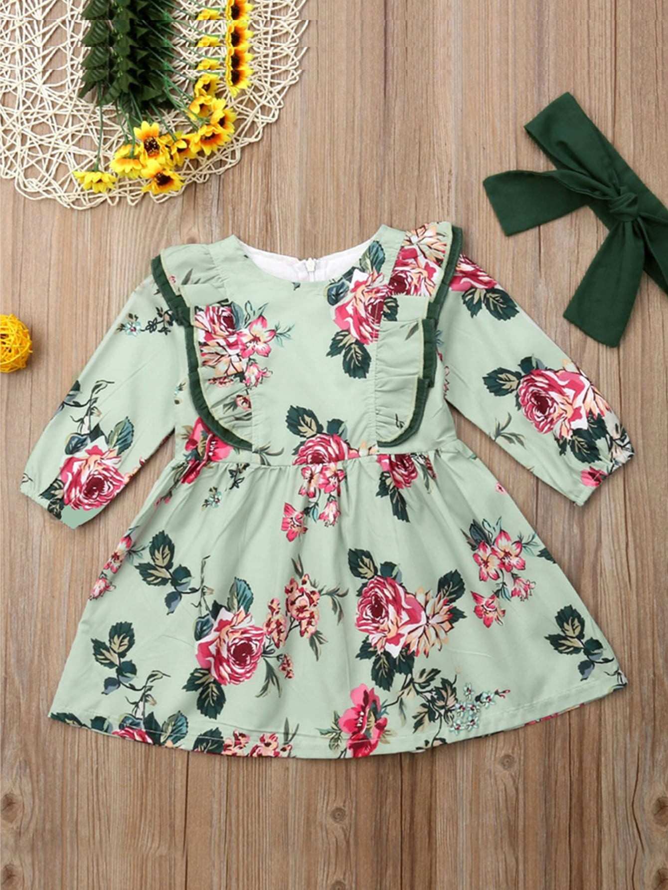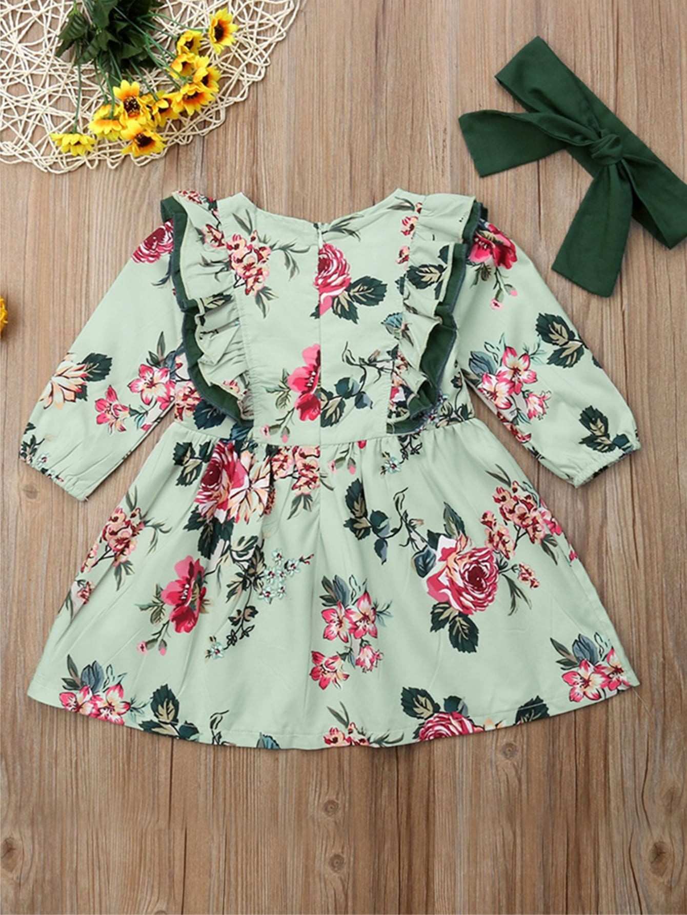 الأطفال - فستان واسع للفتيات الصغيرات بطبعات زهور ومزين بكشكشة مع عصابة رأس