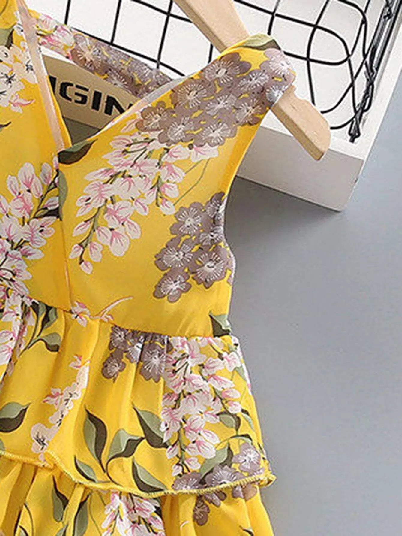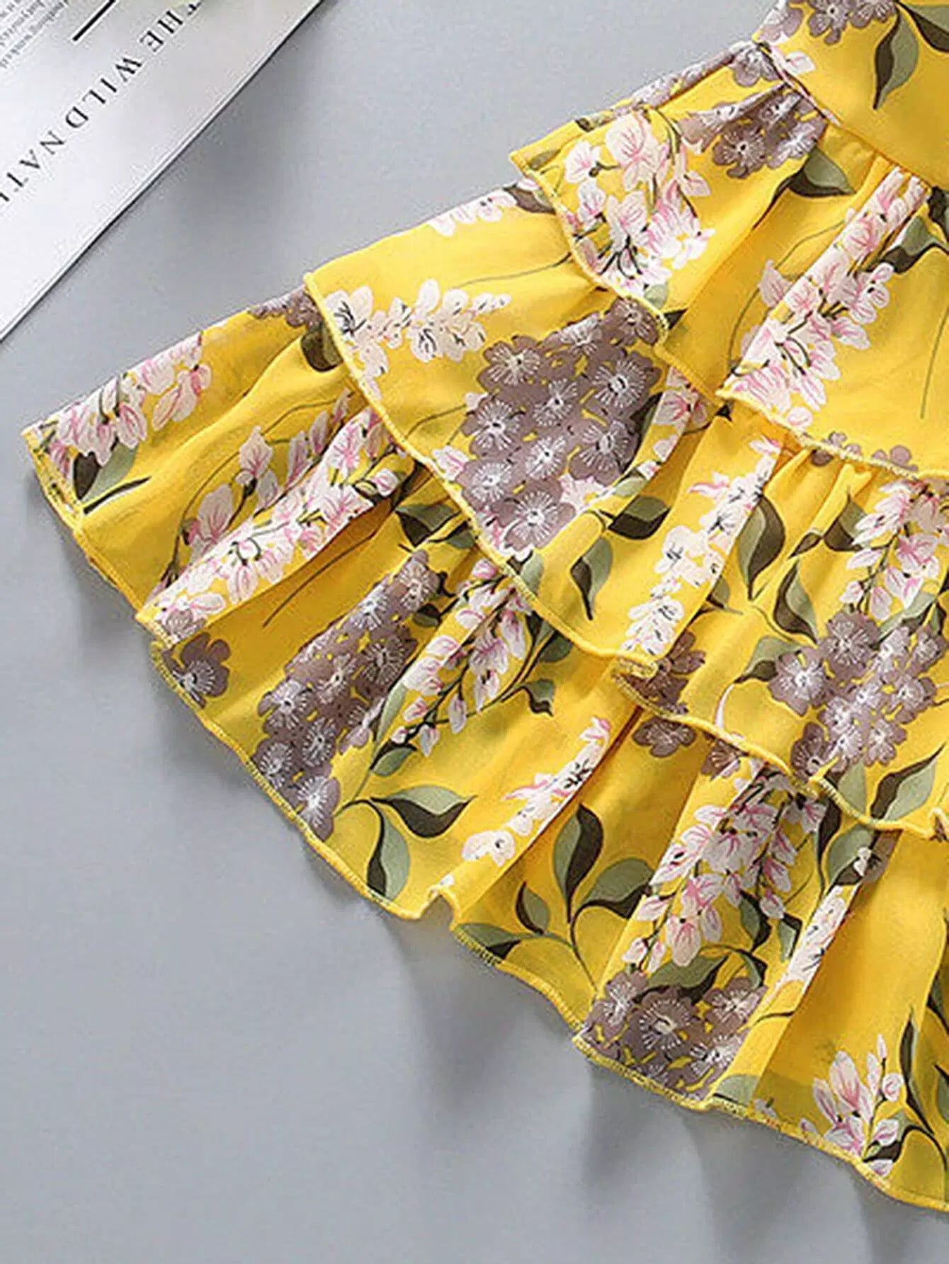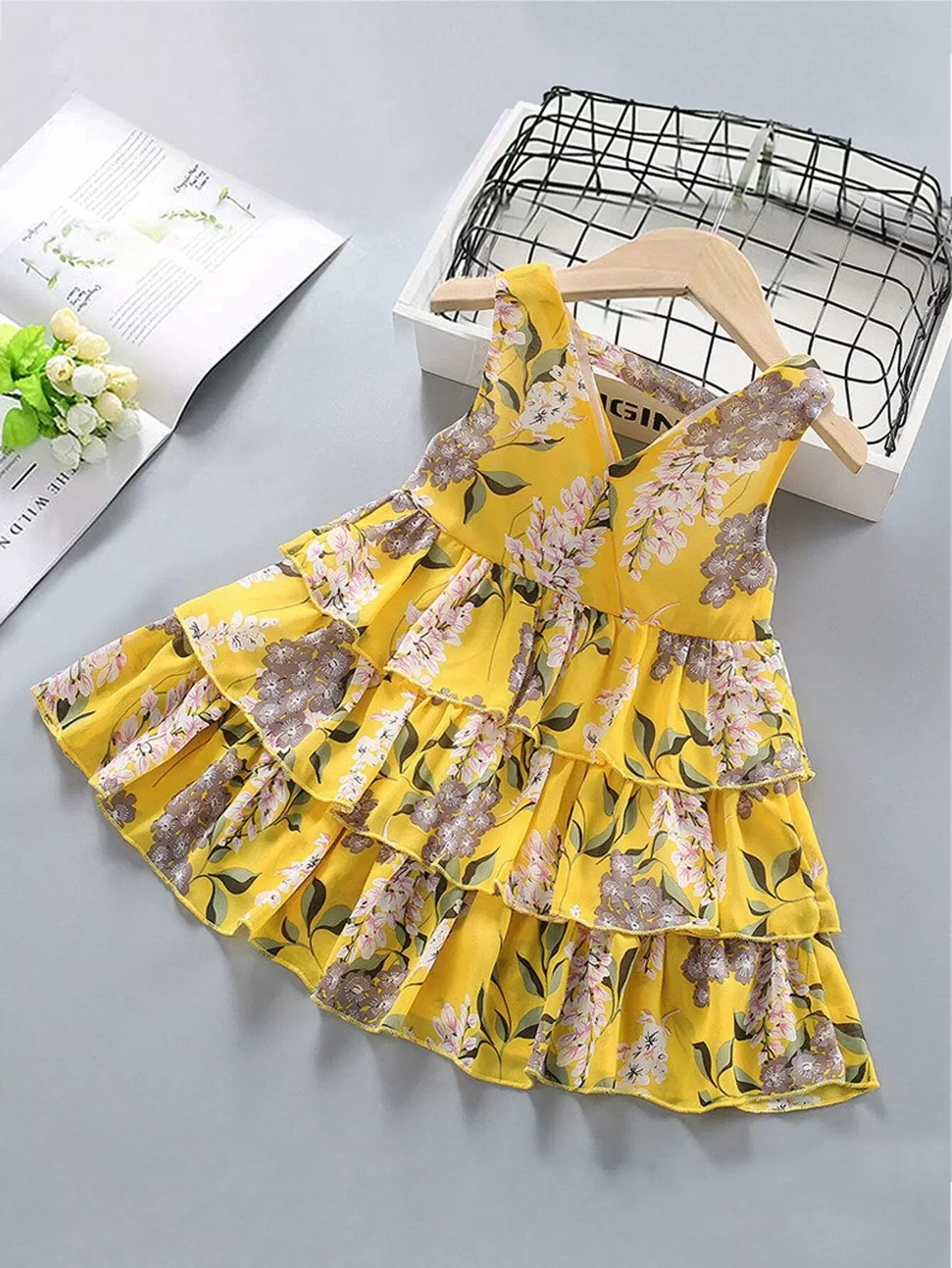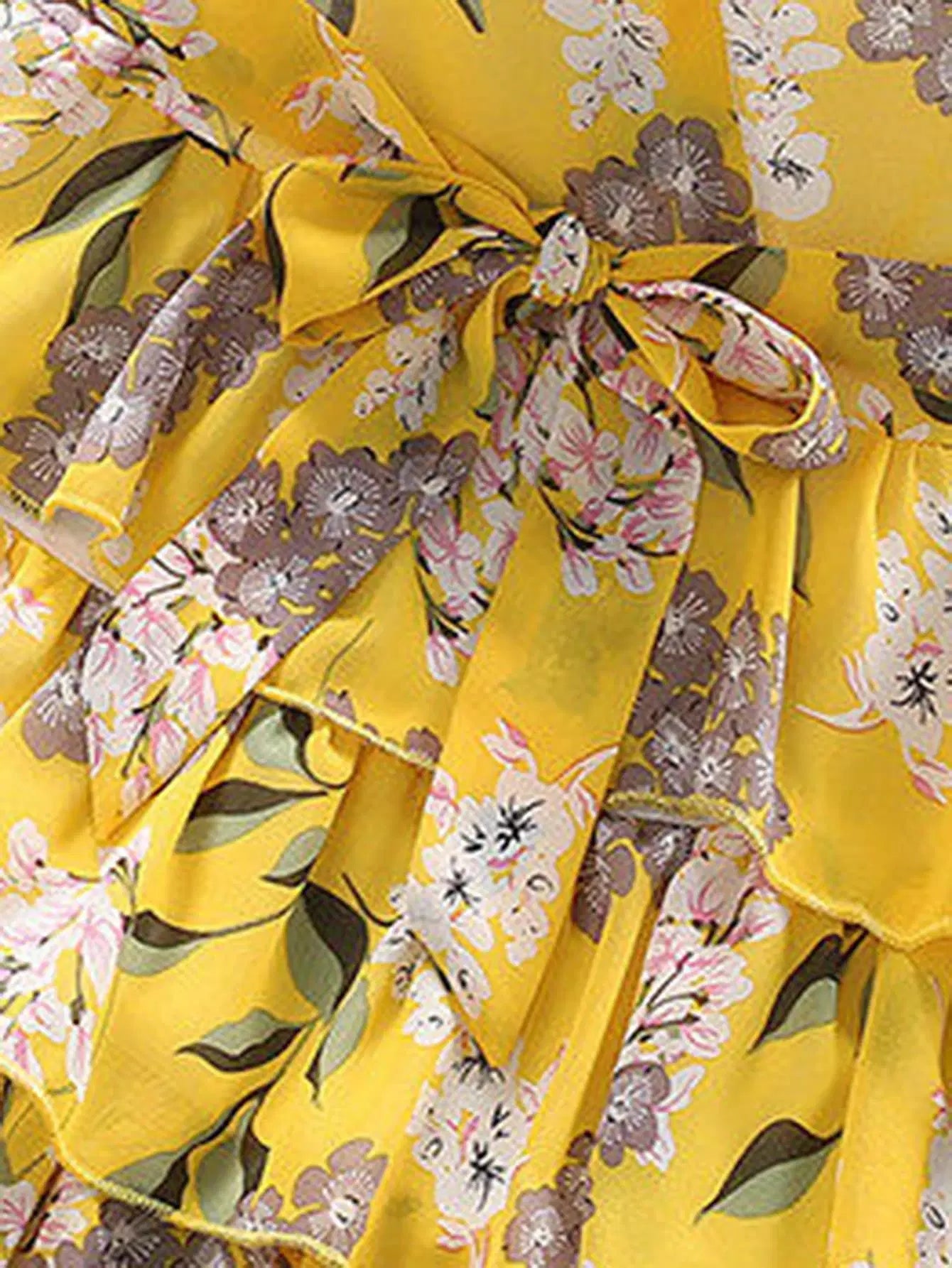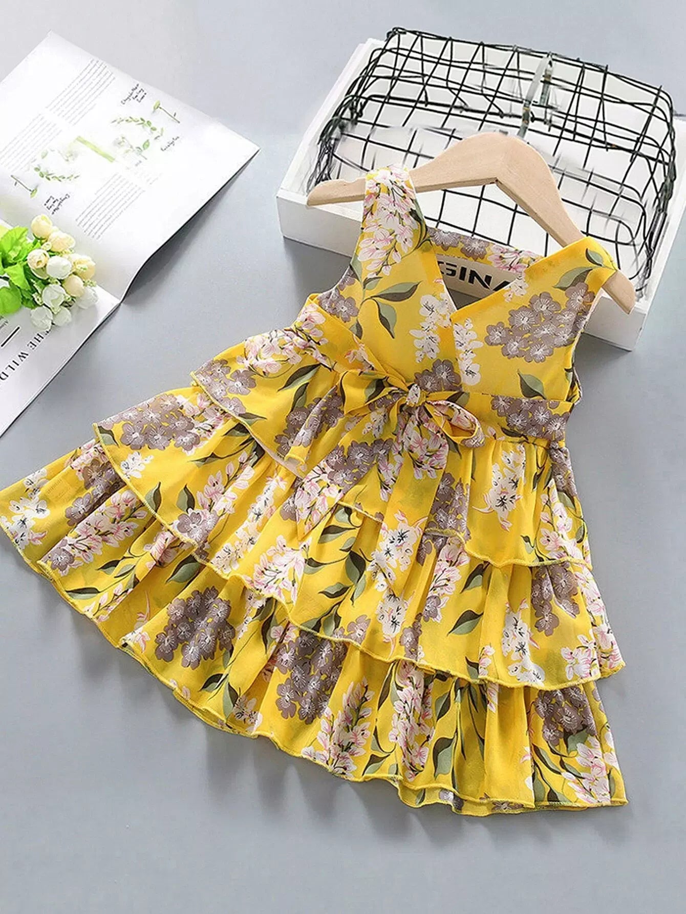 فستان بناتي صغيرات بطبعة زهور مطبوع بربطة عنق أمامية بطبقات