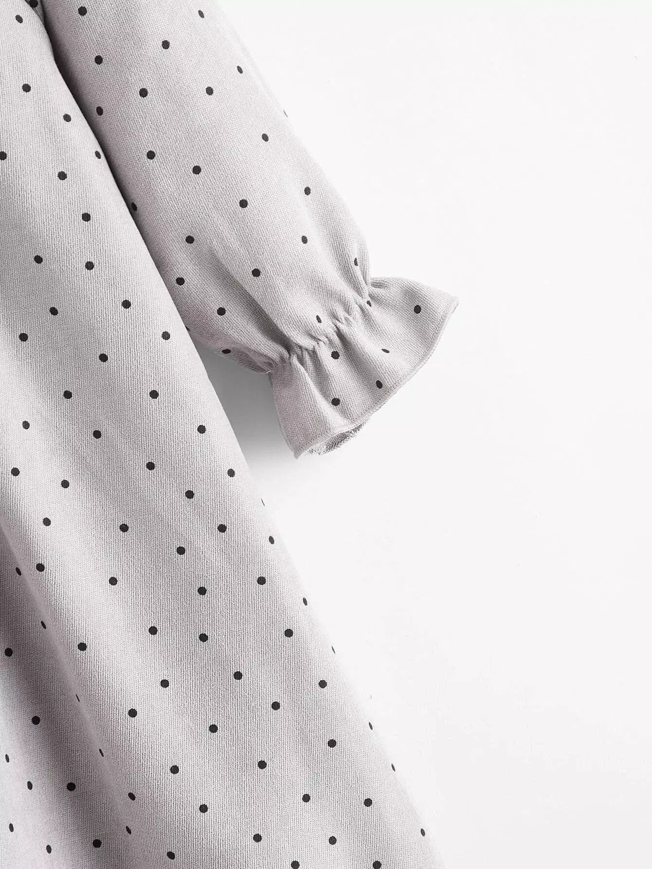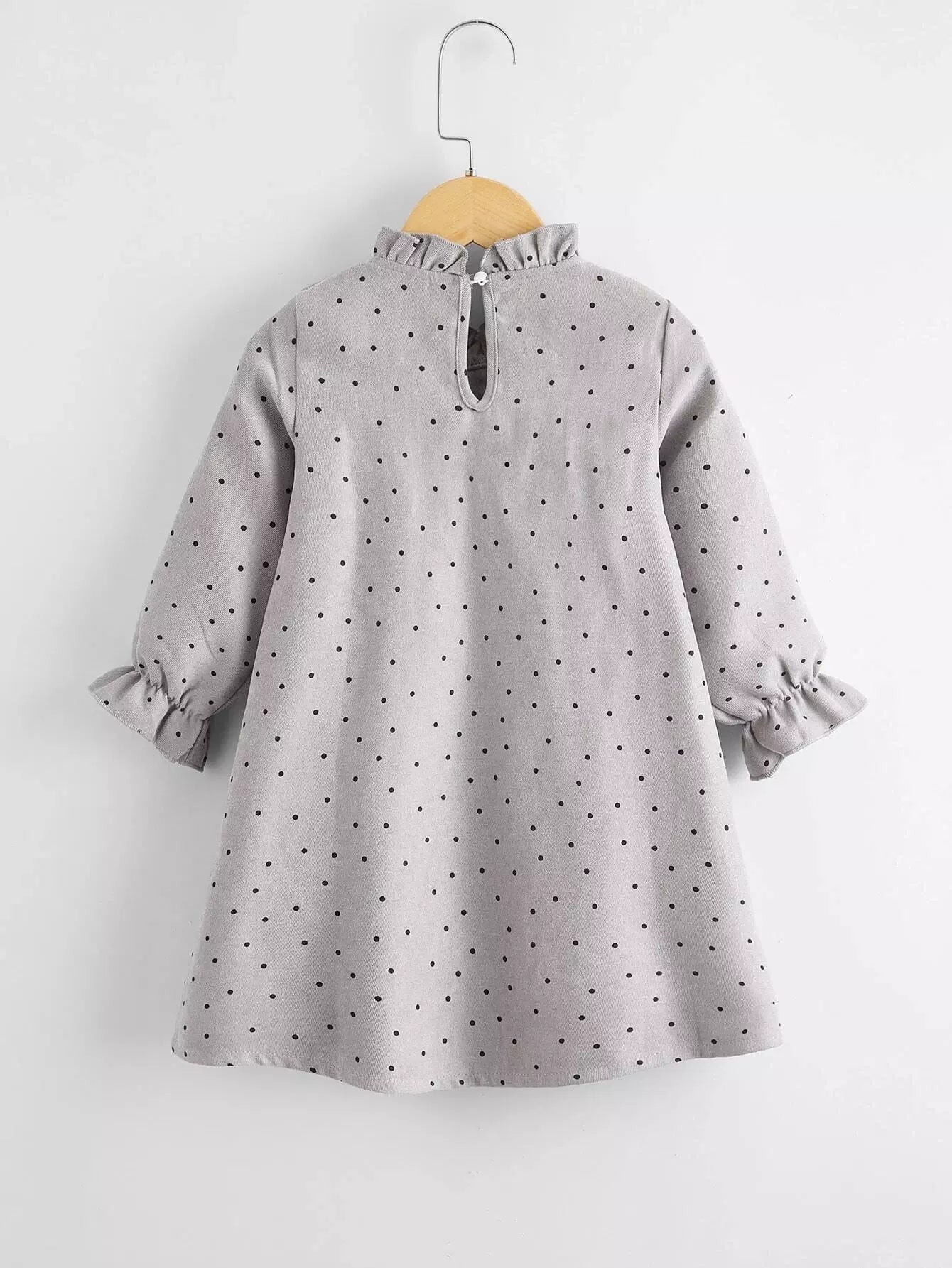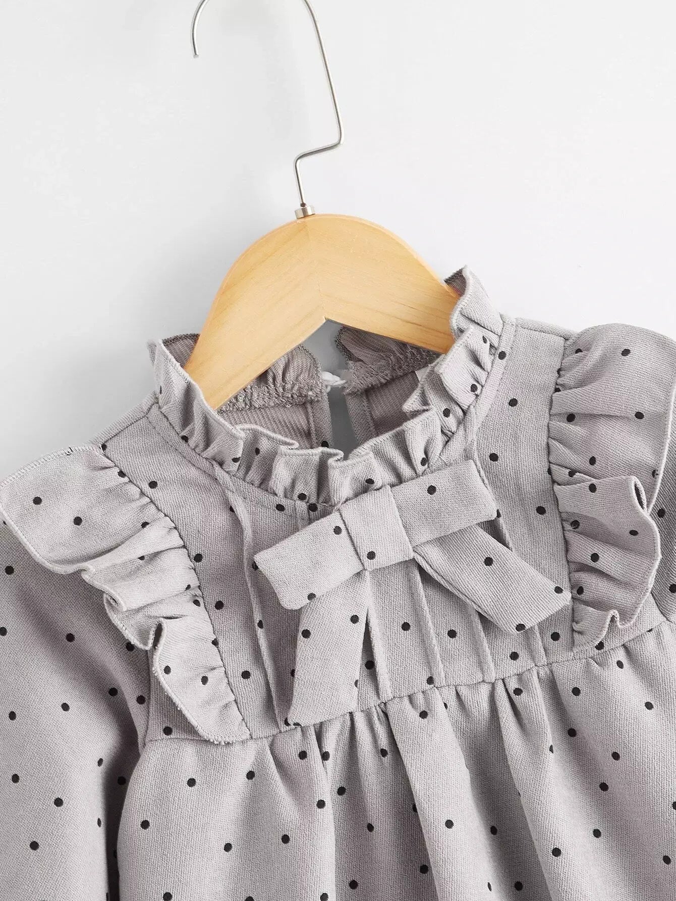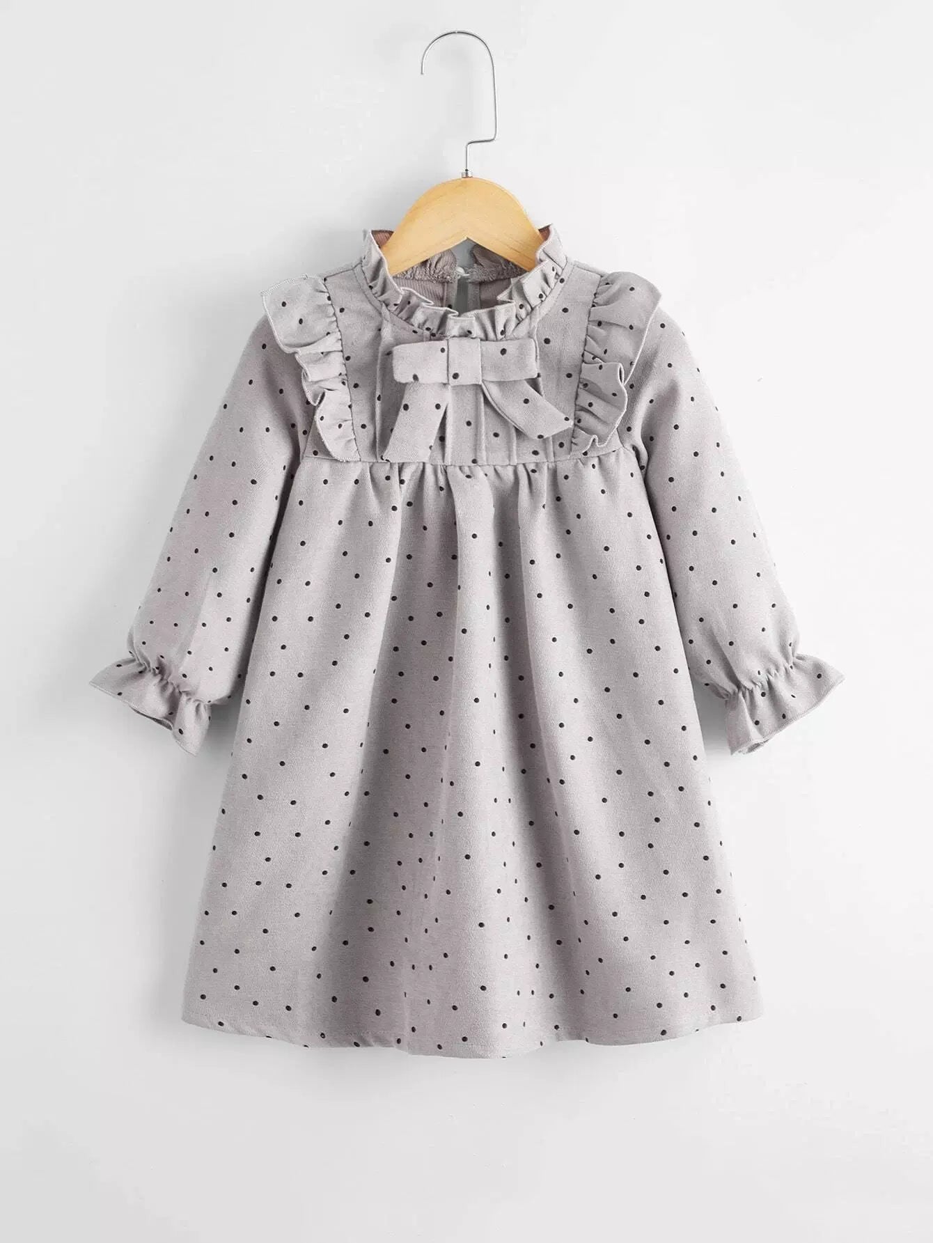 فستان بناتي صغيرات برقبة كشكش بفتحة رقبة أمامية منقوشة بعقدة منقطة