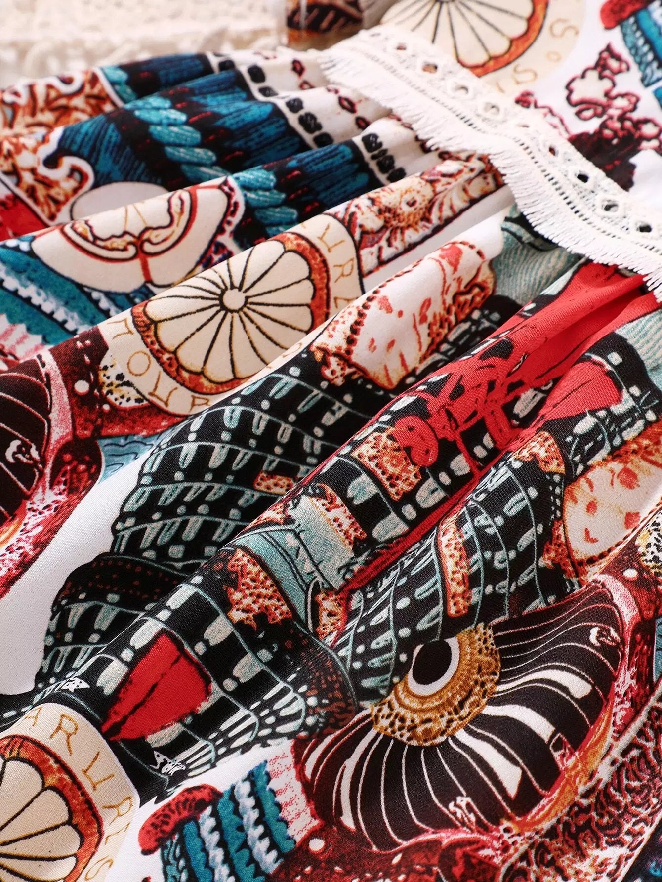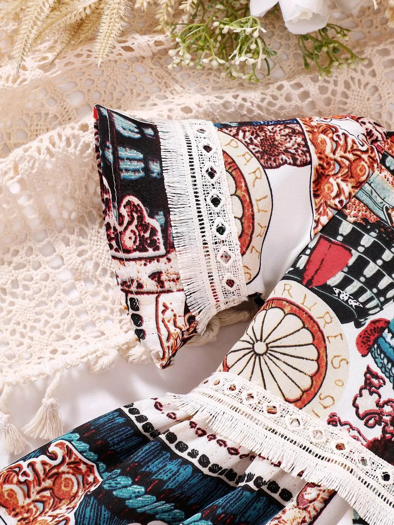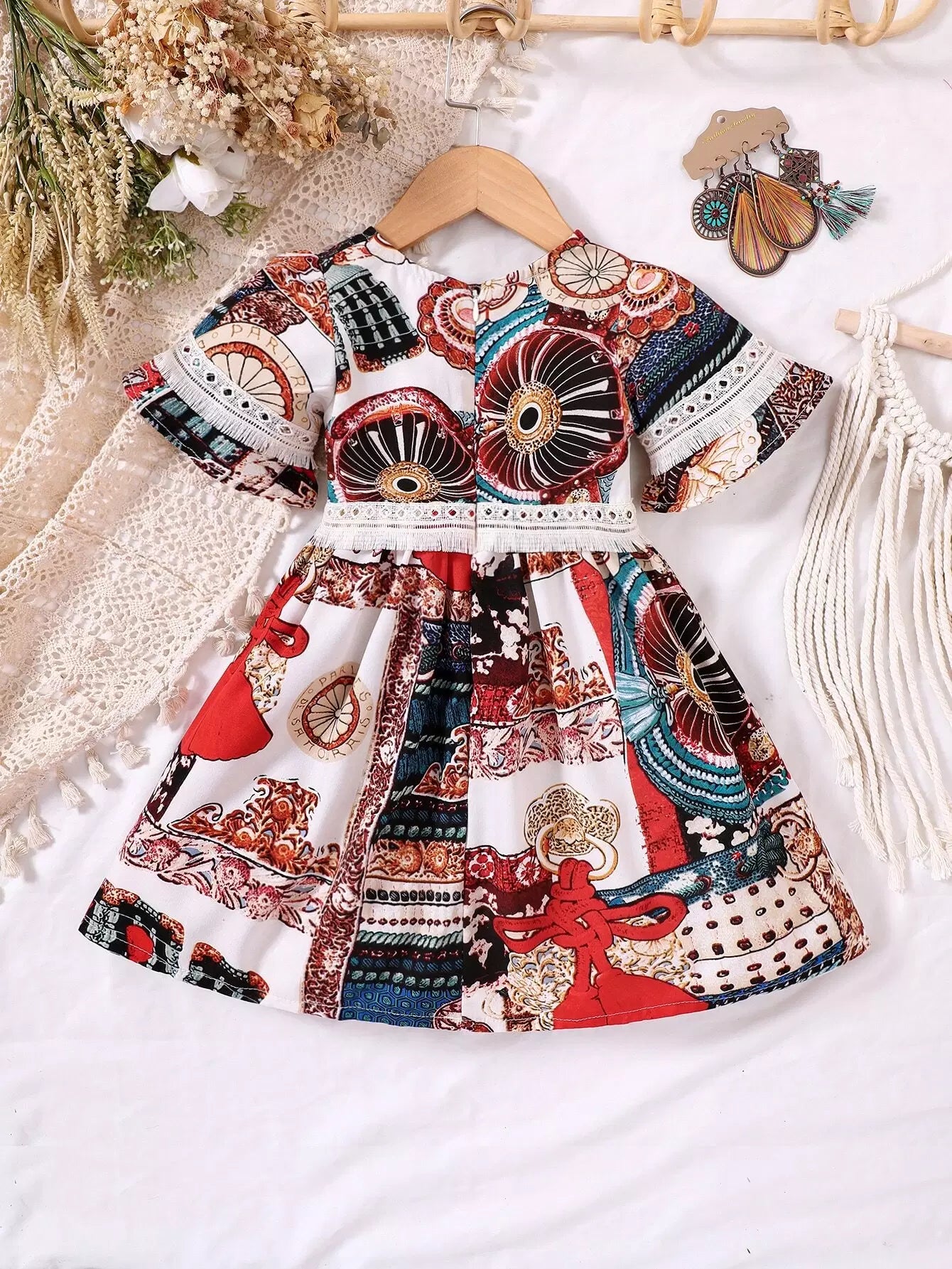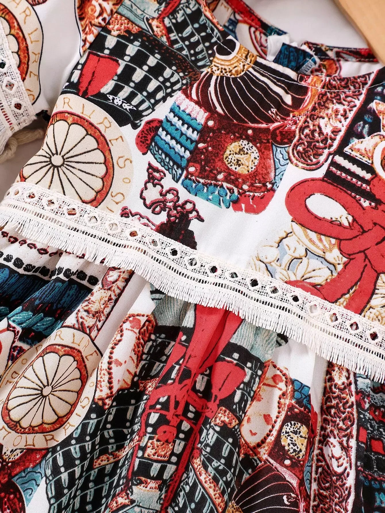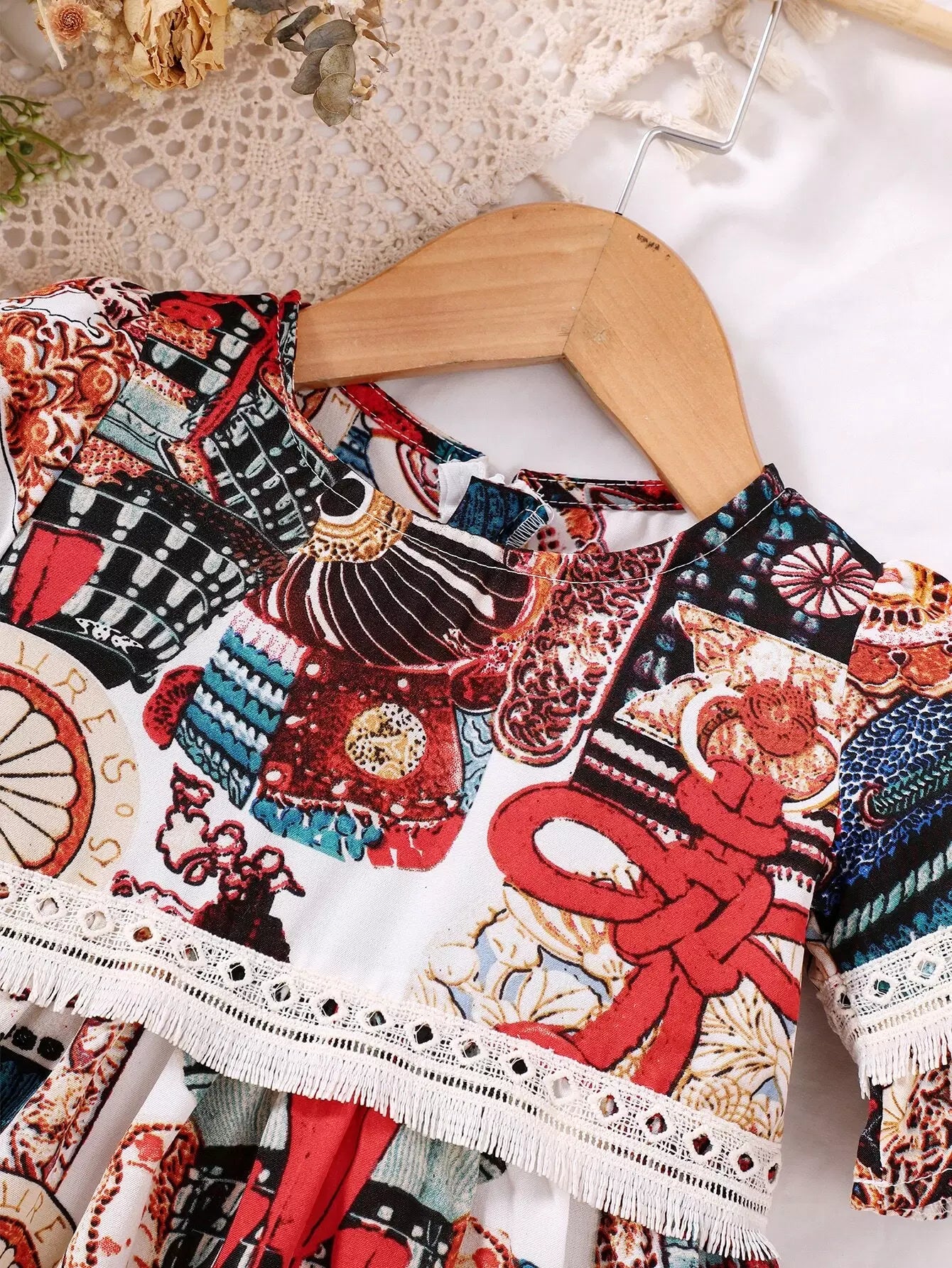 فستان بناتي صغيرات بطبعة جرافيك بحواف مهدبة
