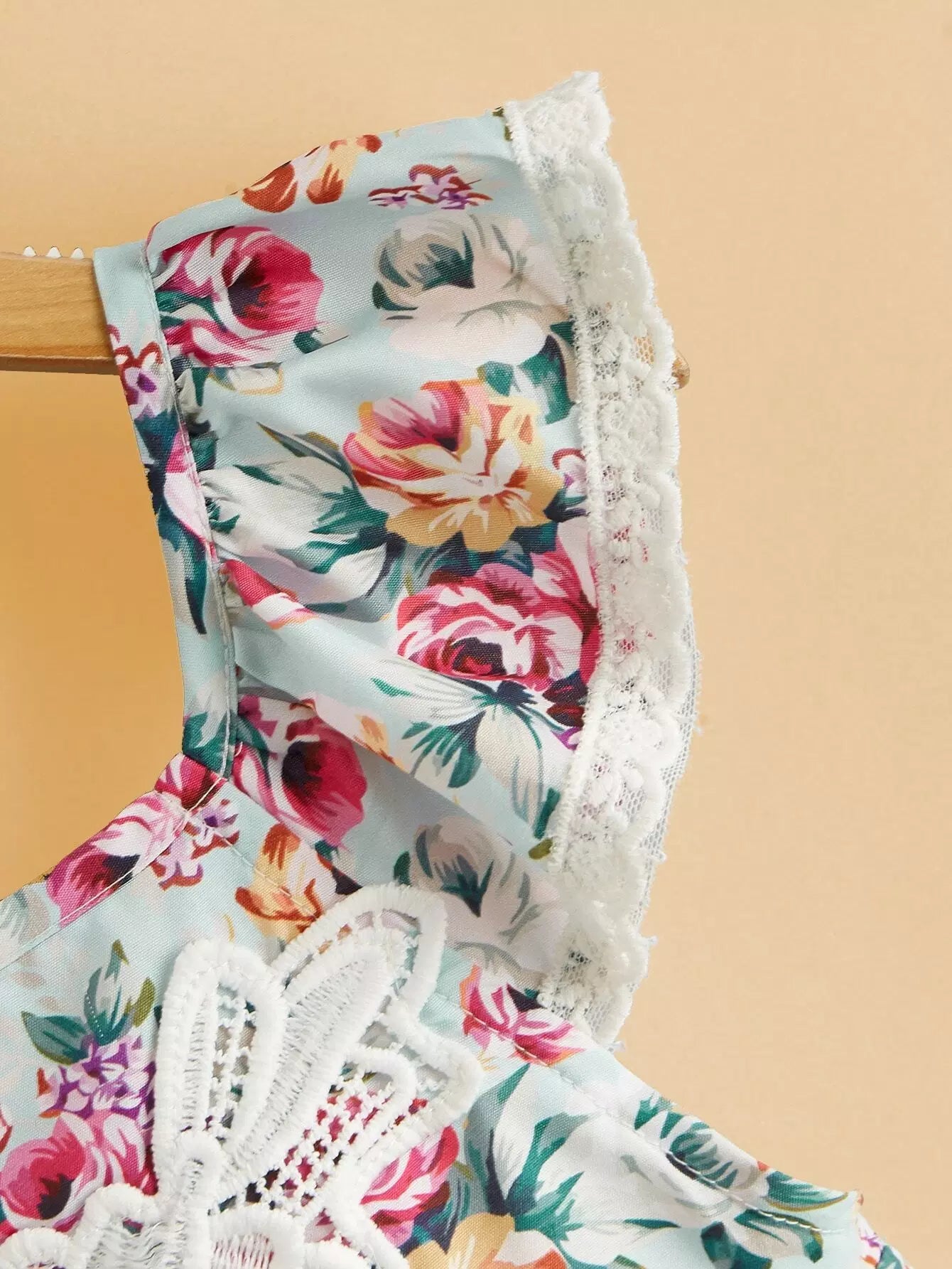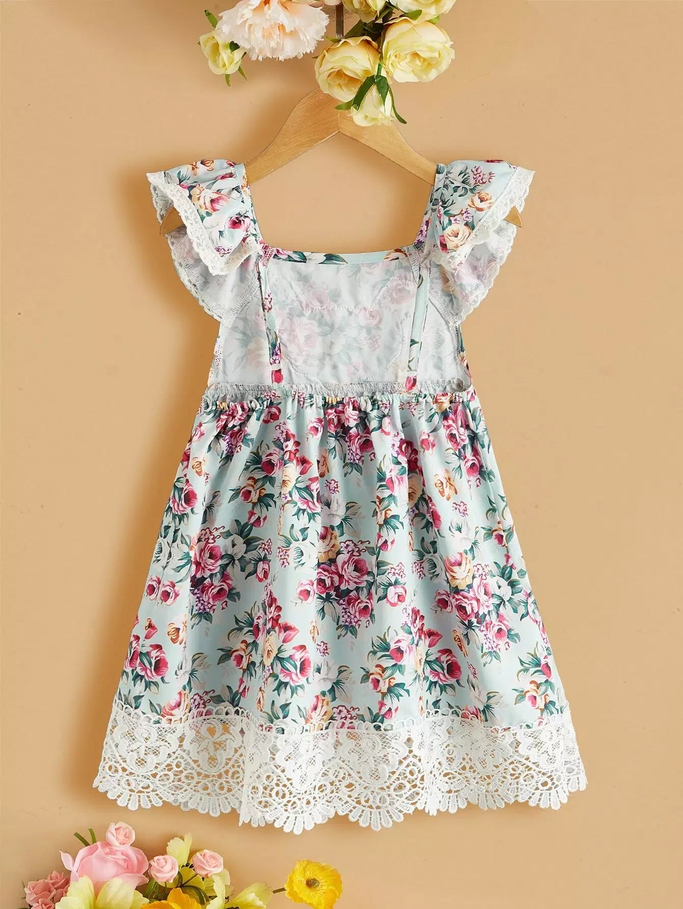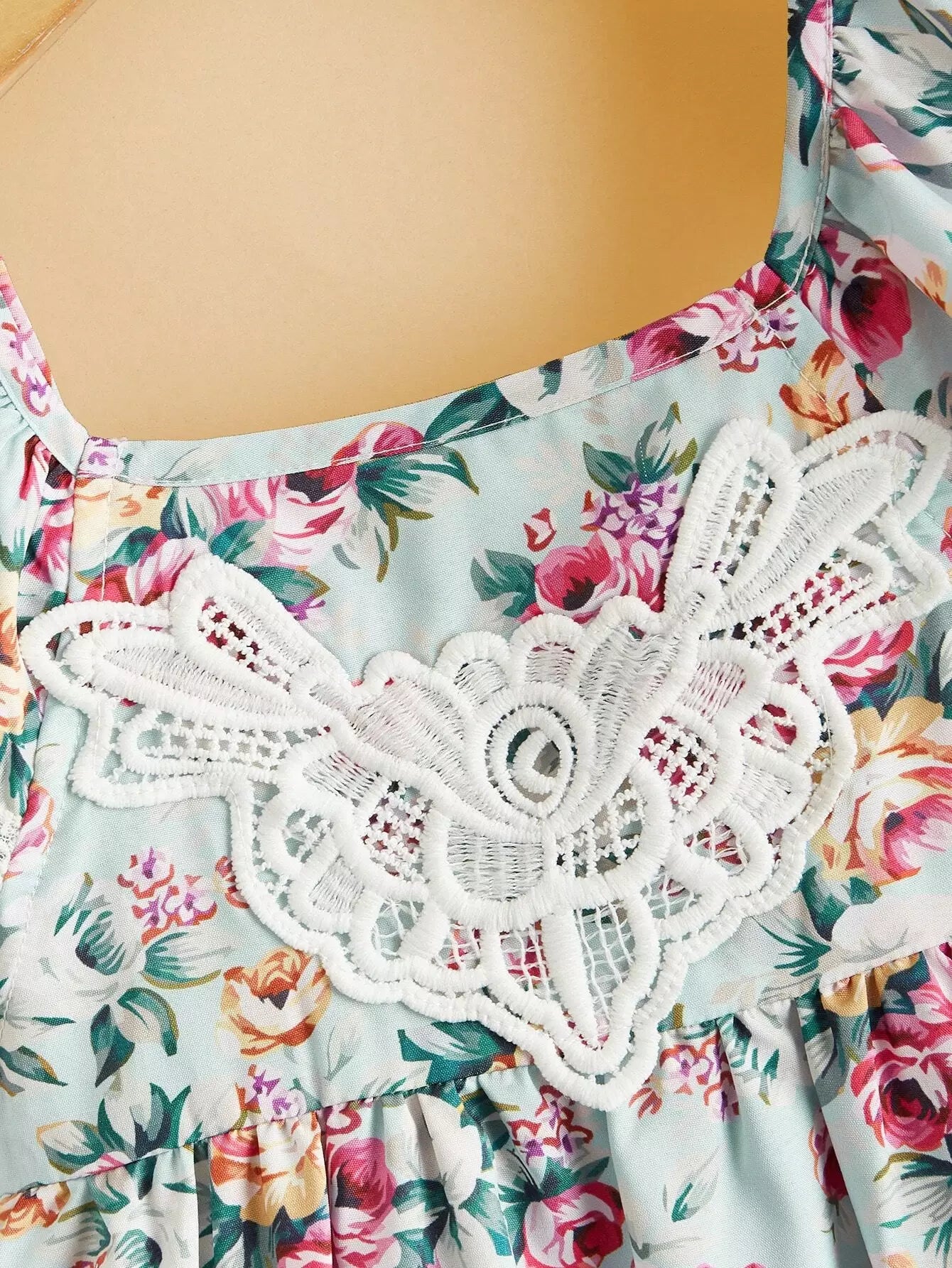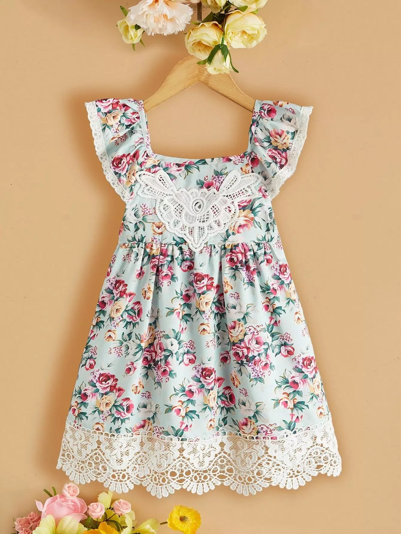 الأطفال - فستان مطبوع عليه زهور من الدانتيل المخرّم للفتيات الصغيرات