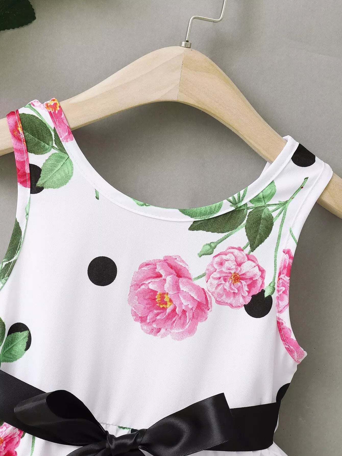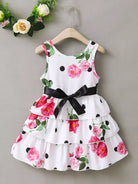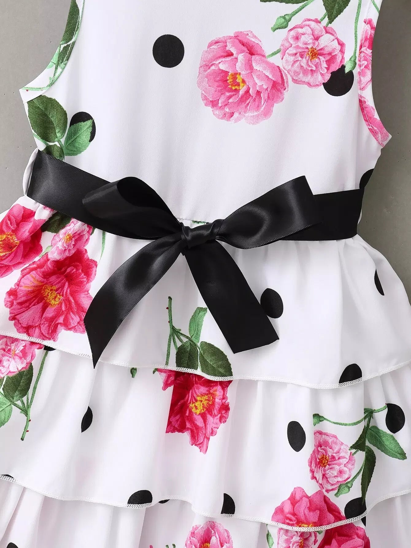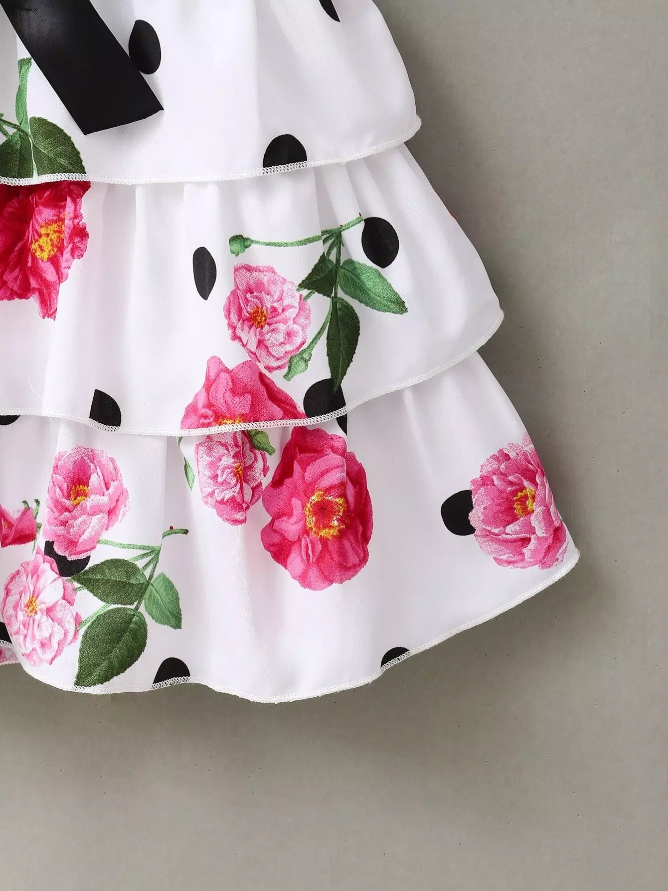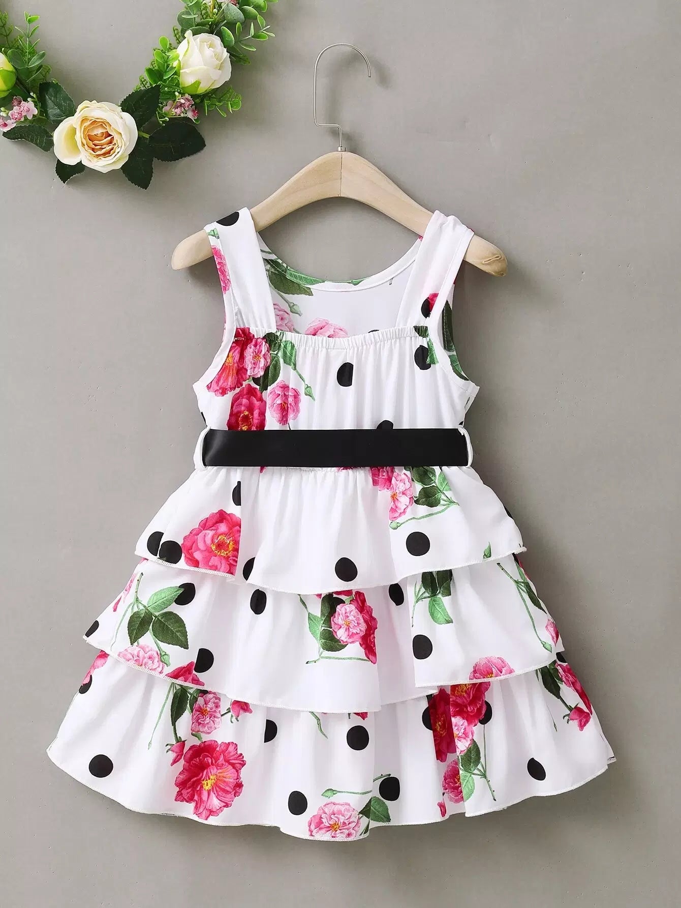 فستان للفتيات الصغيرات بطبعة زهور ونقاط بولكا مع حاشية طبقات بدون حزام